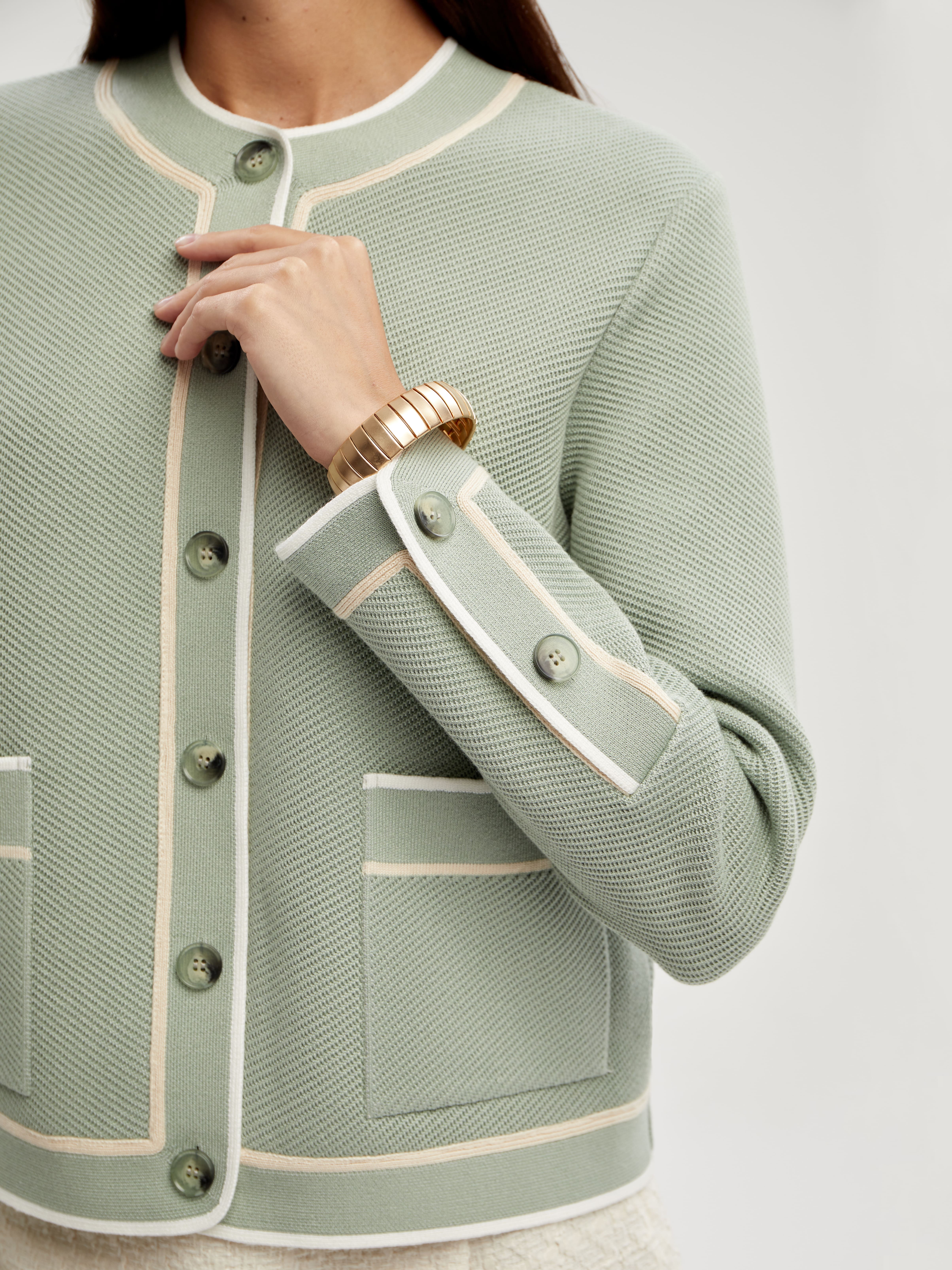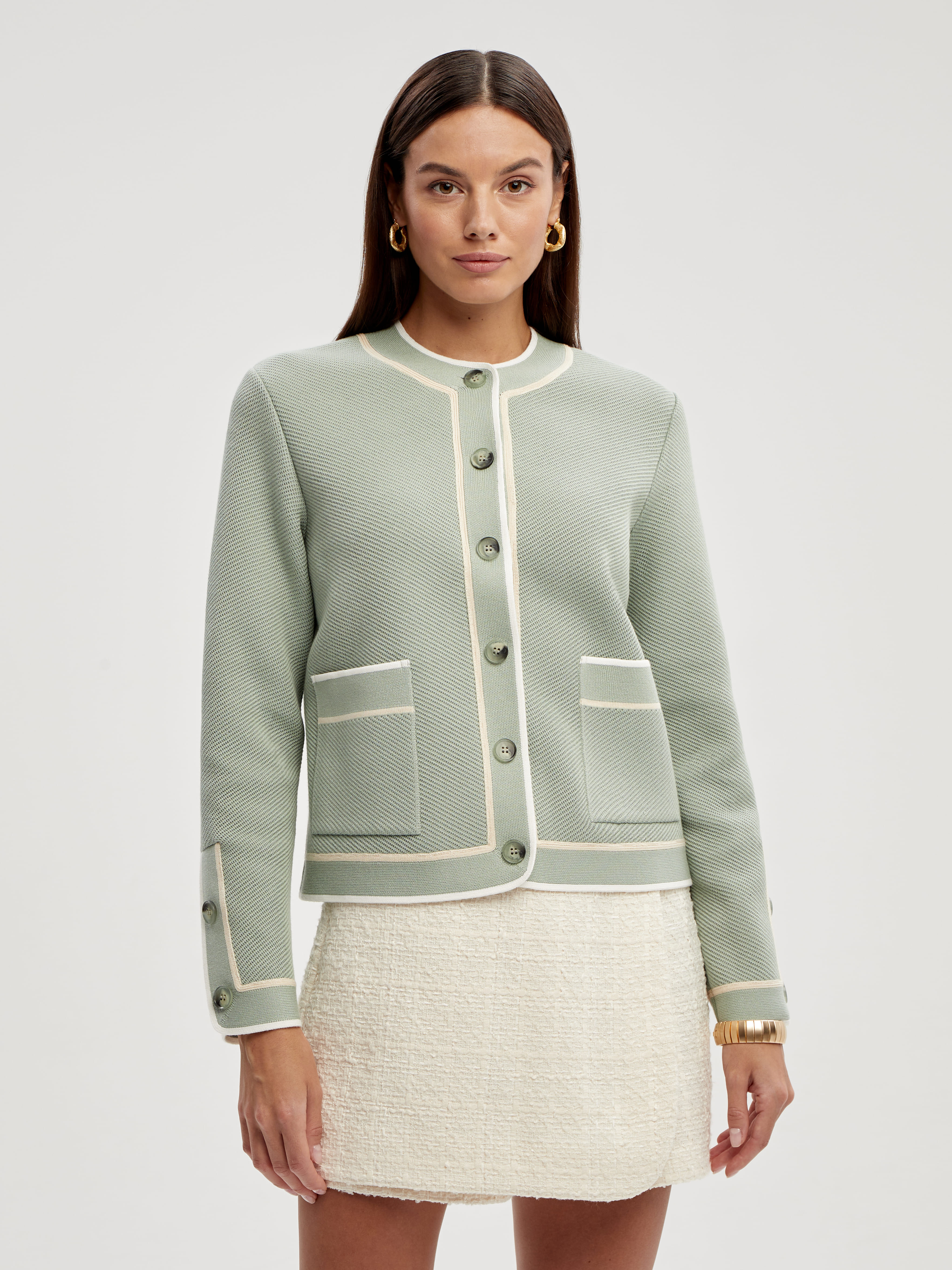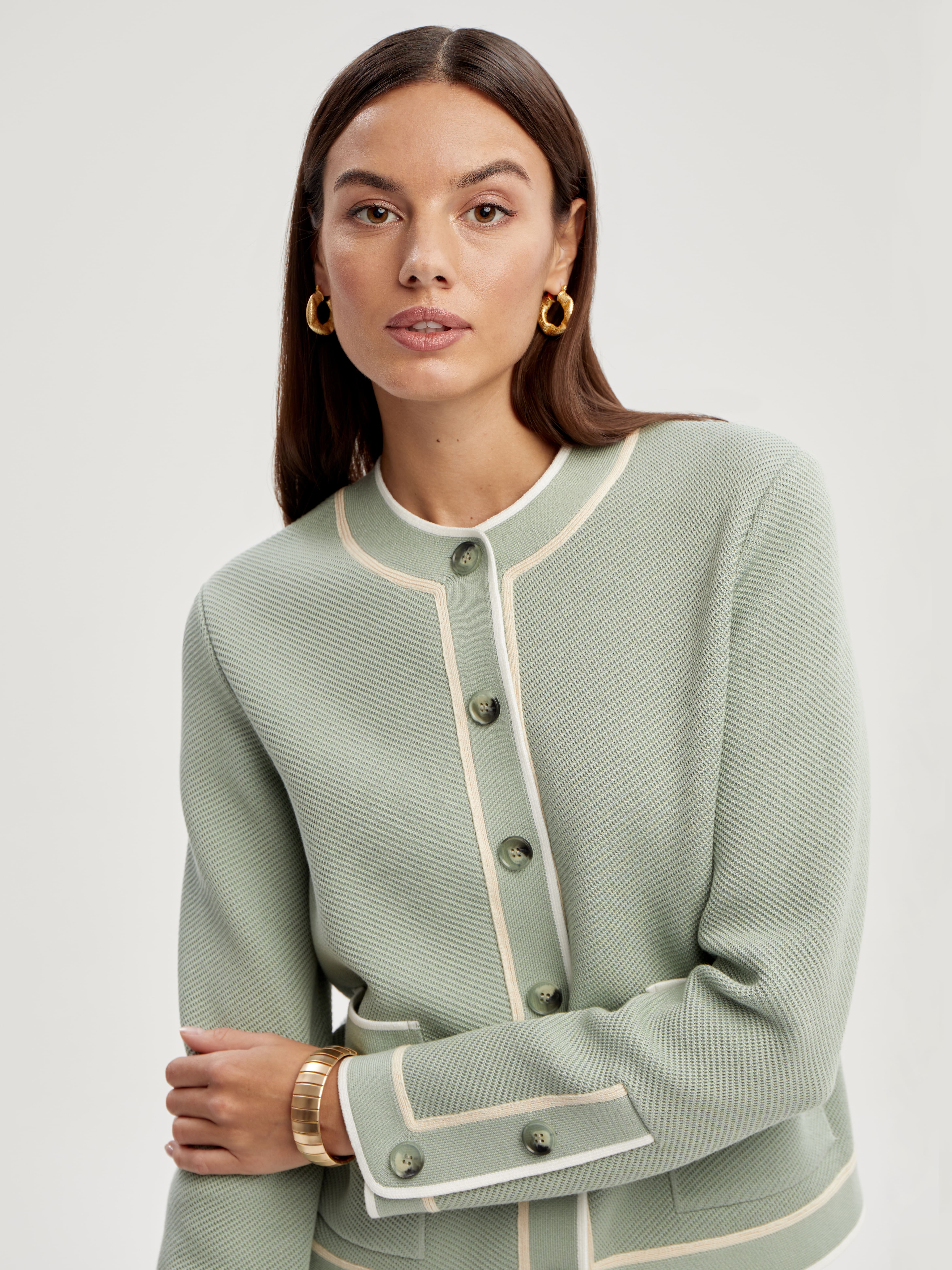 Маленький французский жакет из хлопковой пряжи – модель, готовая прожить с вами самый насыщенный день, начиная с утреннего совещания в офисе и заканчивая посиделками с подругами в модном баре. Акцентная отделка кантом придает образу дополнительную выразительность. Трикотажное полотно, усиленное дуэтом вискозы и полиамида, обладает приятной тяжестью, но при этом уверенно держит форму по всей длине.
