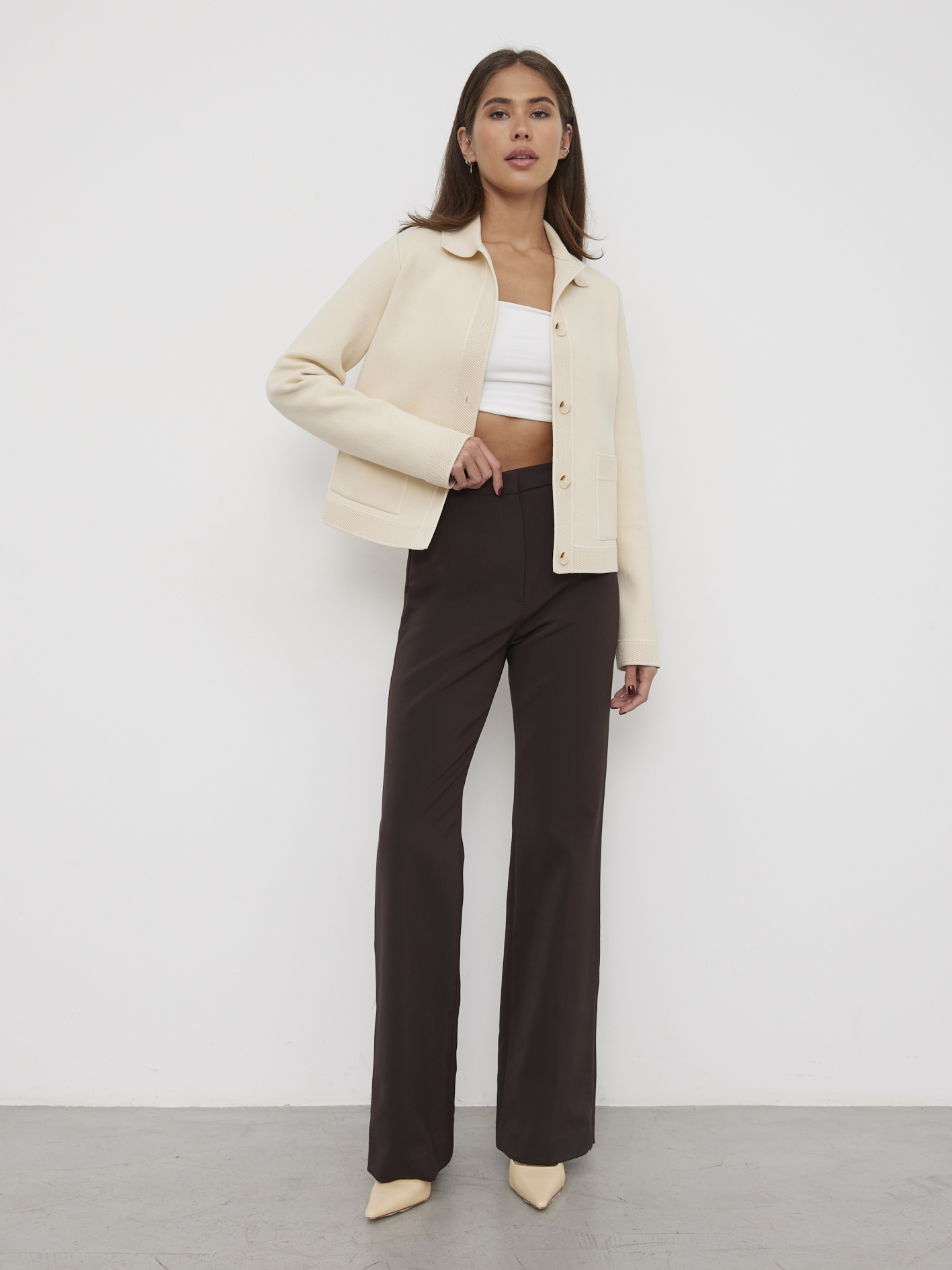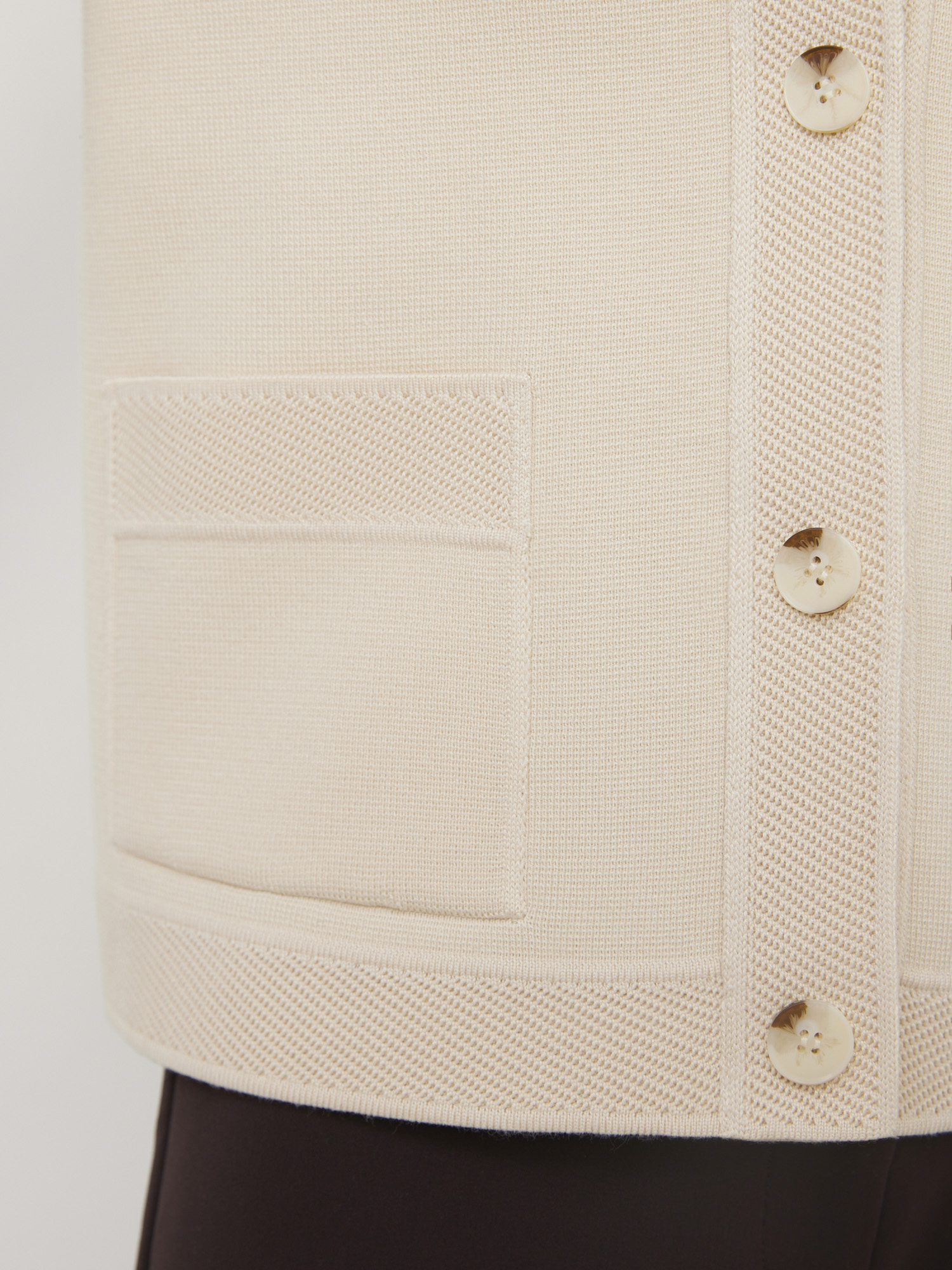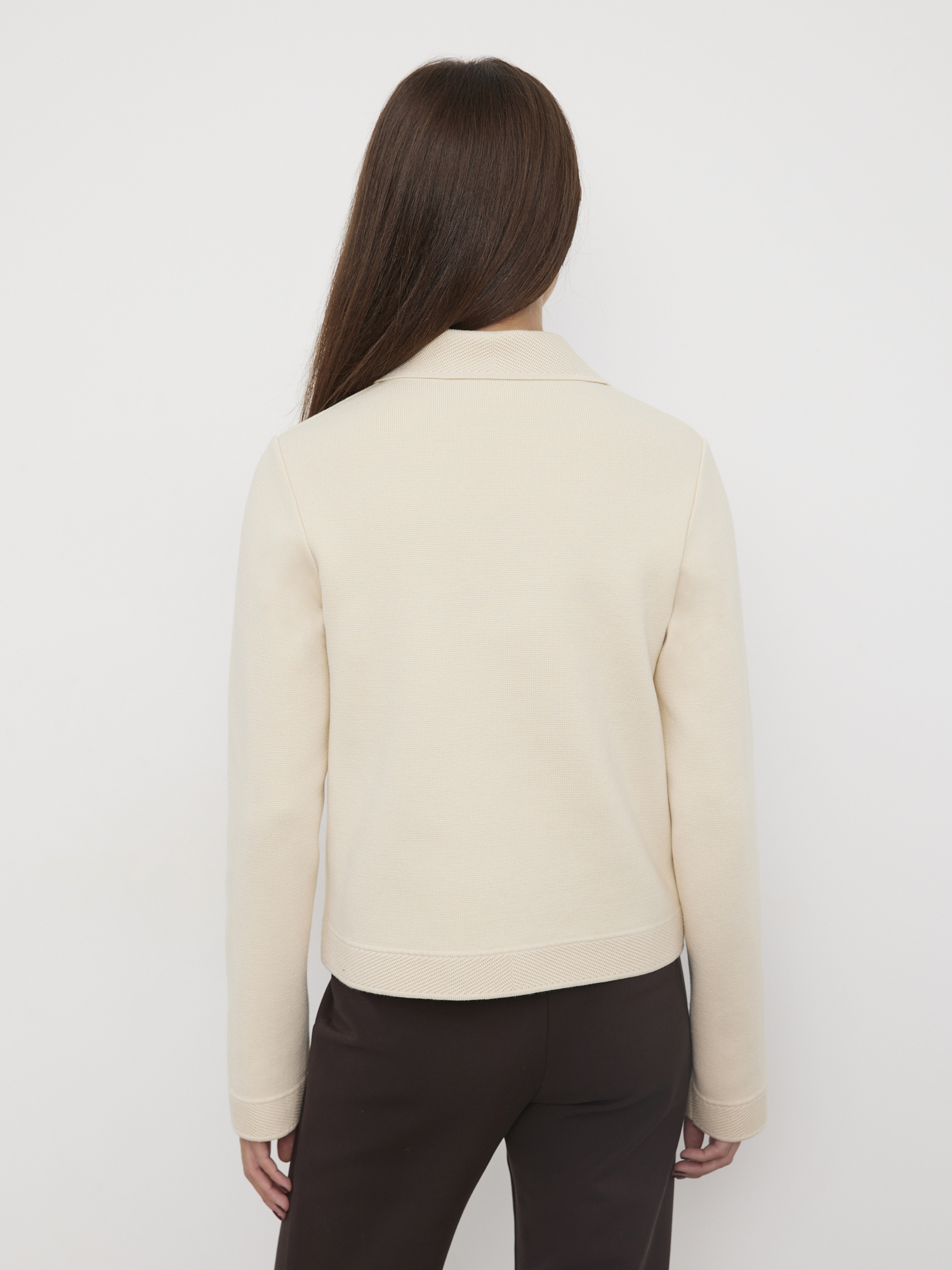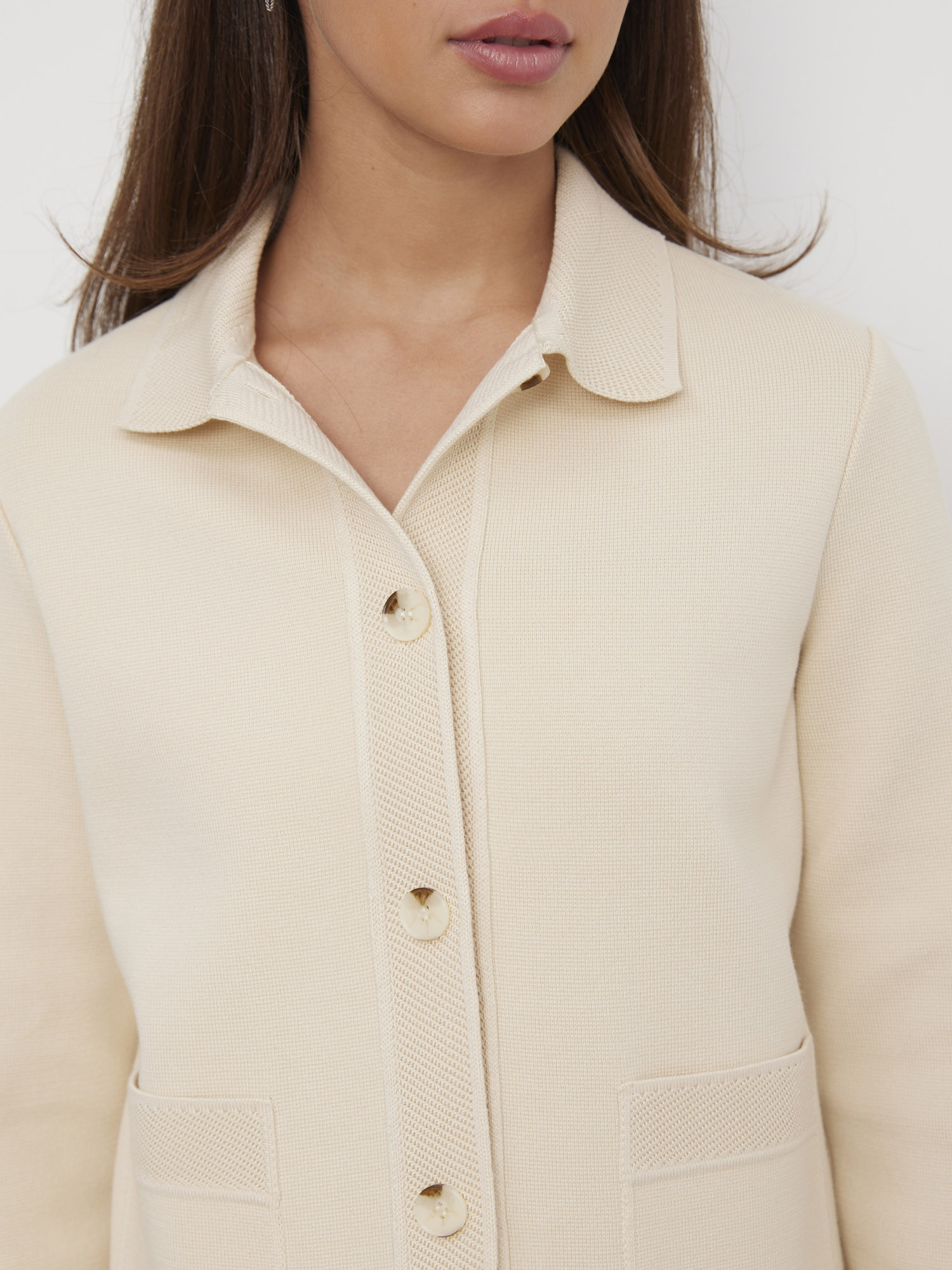 Кроп длина этого нейтрального хлопкового жакета вдохновляет на интересные сочетания. Чтобы модель не смотрелась скучно, мы прибегли к контрасту текстур – гладкий трикотаж оттенили рельефной отделкой полочек, воротника и рукавов. Чтобы структура хлопка идеально сохраняла форму, в состав введена шелковистая вискозная нить. Она укрепила переплетение петель и добавила изделию приятной мягкости.