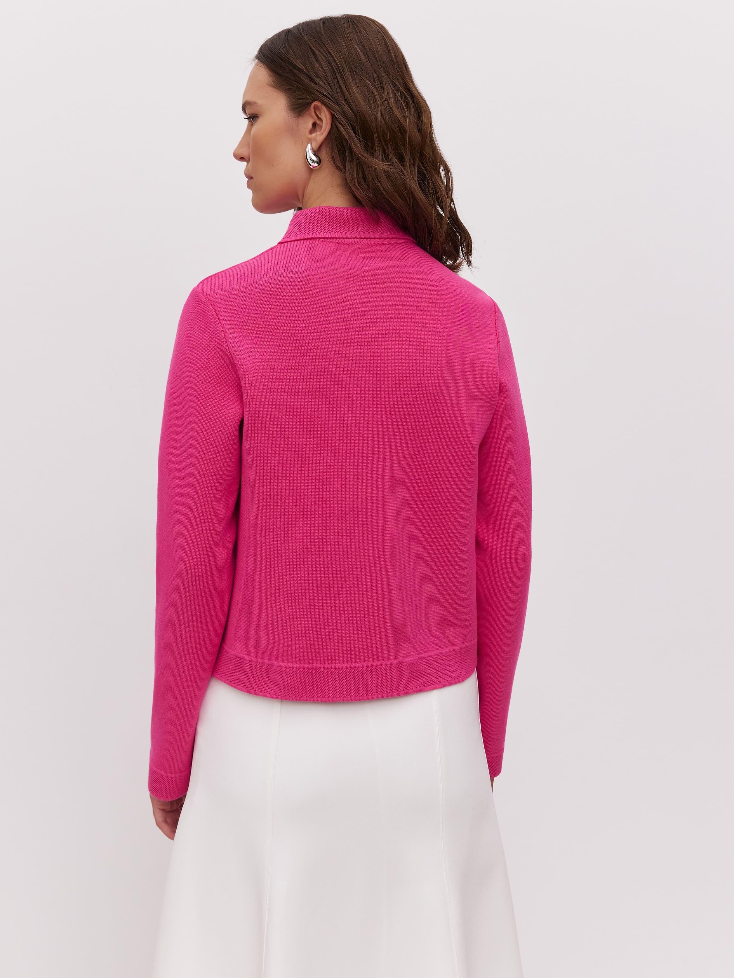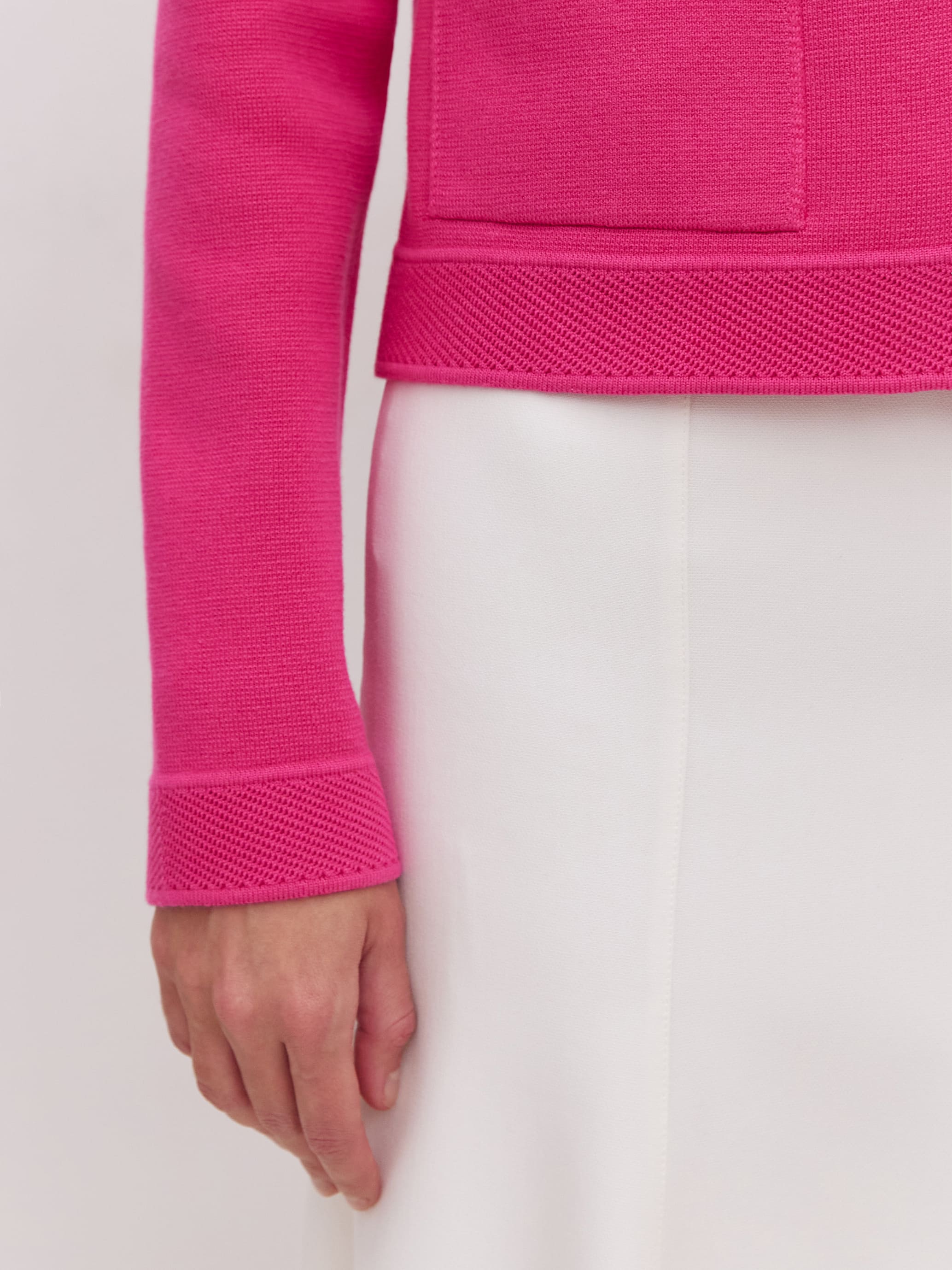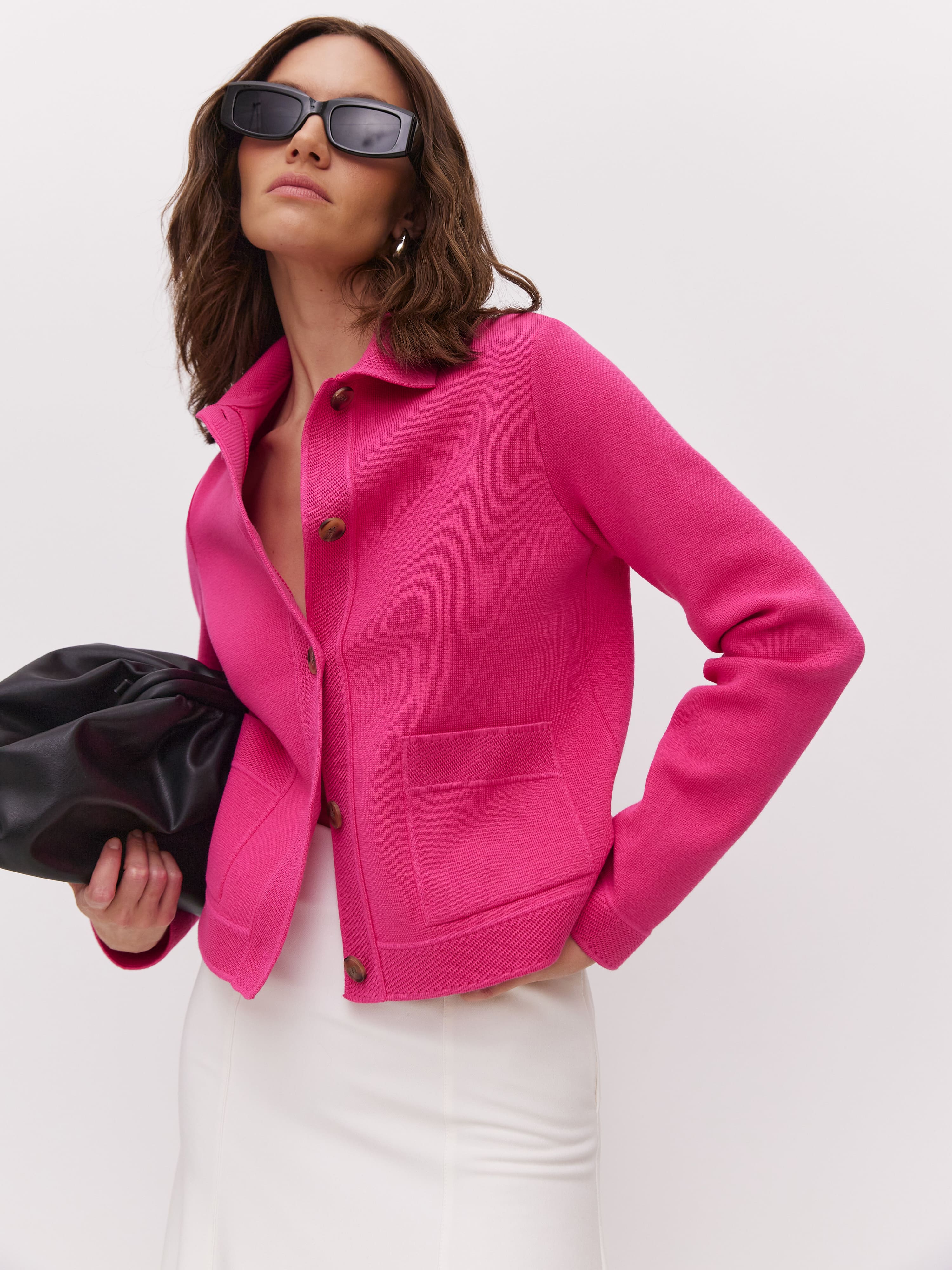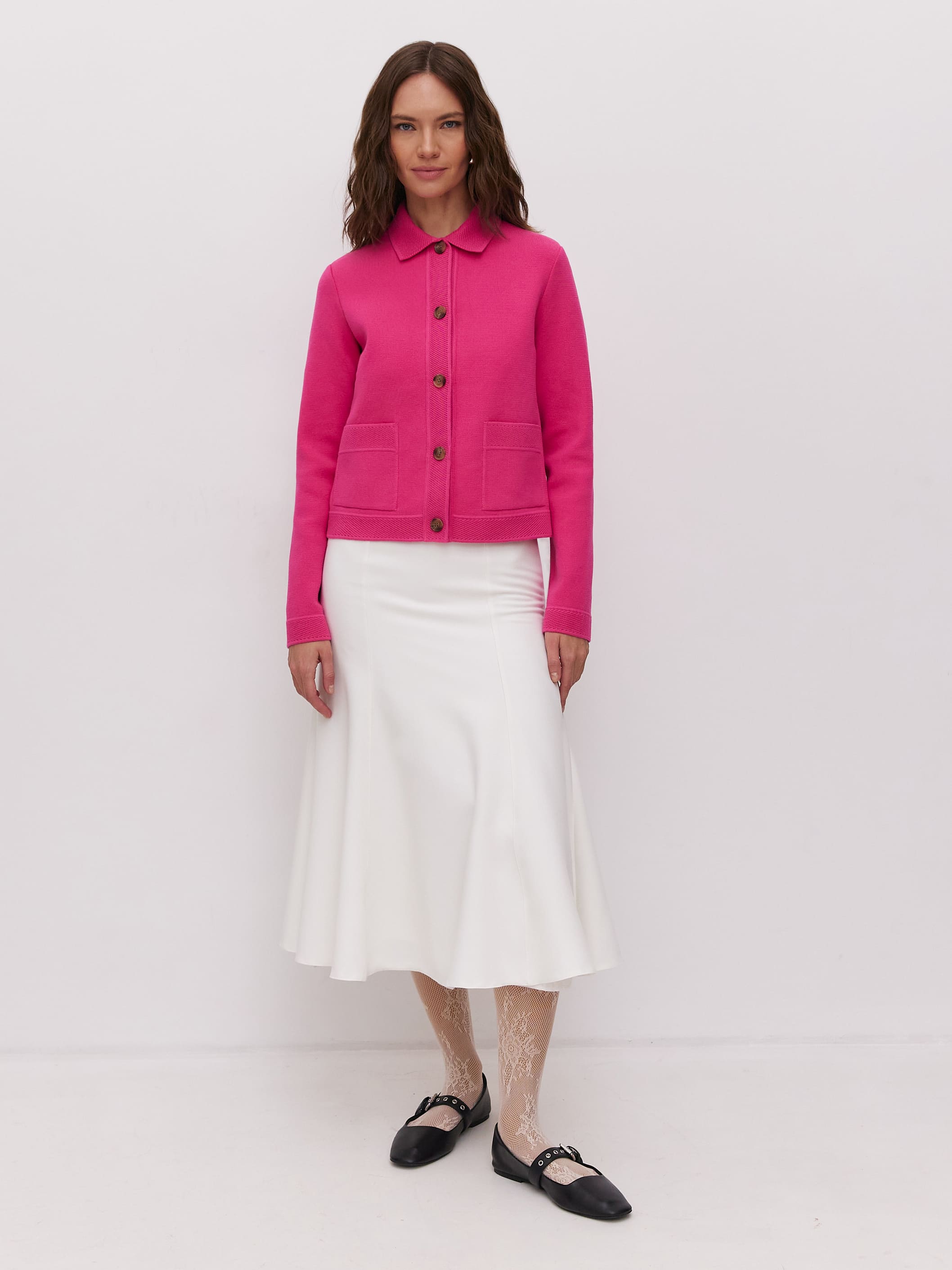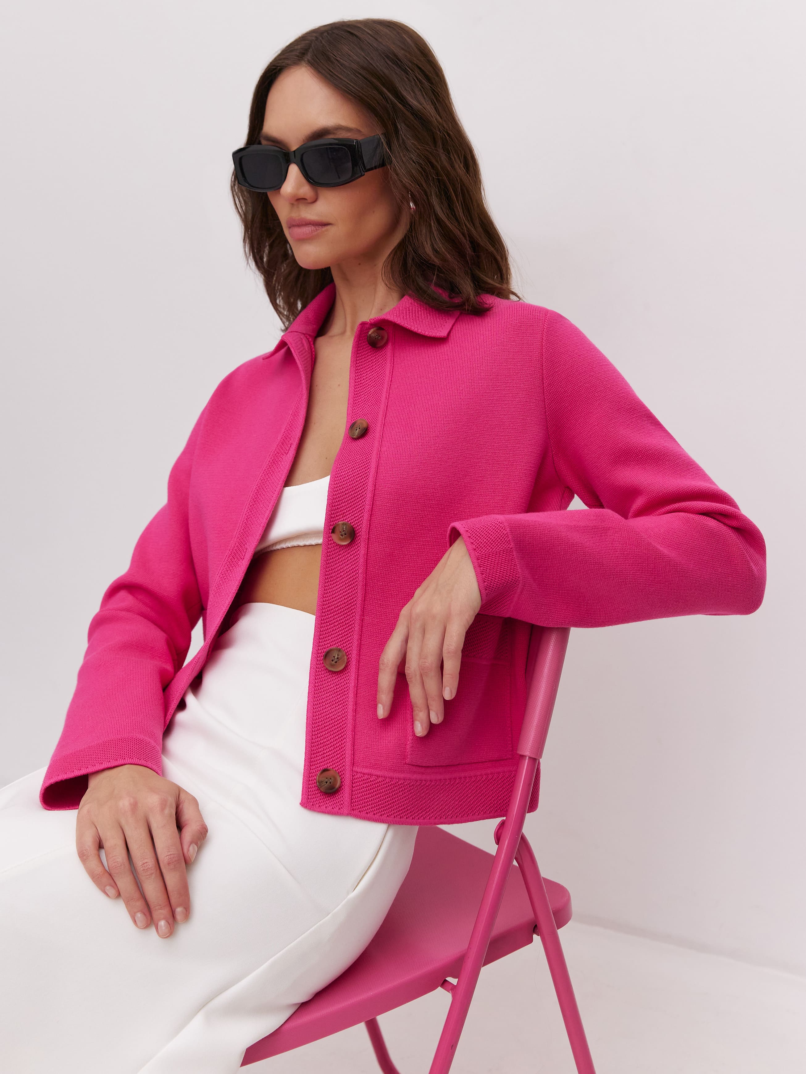 Кроп длина этого нейтрального хлопкового жакета вдохновляет на интересные сочетания. Чтобы модель не смотрелась скучно, мы прибегли к контрасту текстур – гладкий трикотаж оттенили рельефной отделкой полочек, воротника и рукавов. Чтобы структура хлопка идеально сохраняла форму, в состав введена шелковистая вискозная нить. Она укрепила переплетение петель и добавила изделию приятной мягкости.