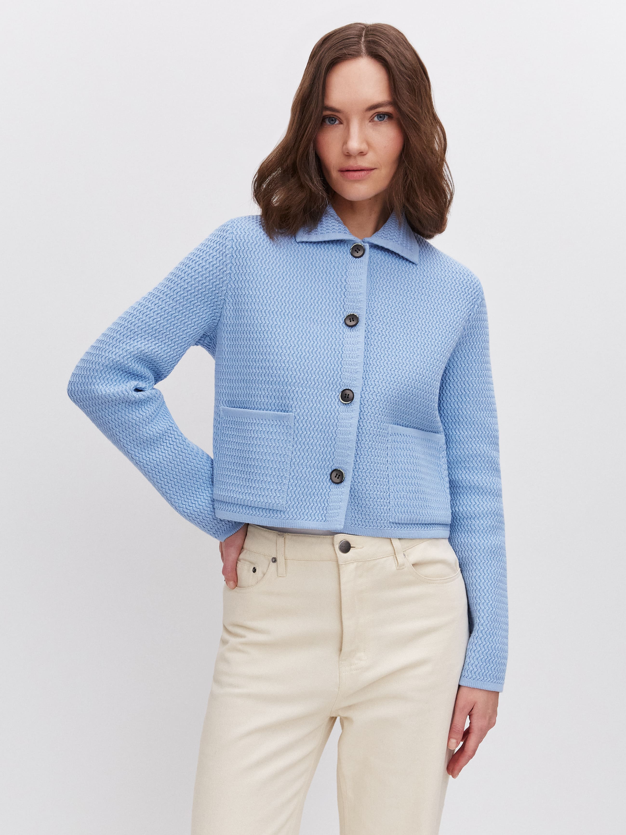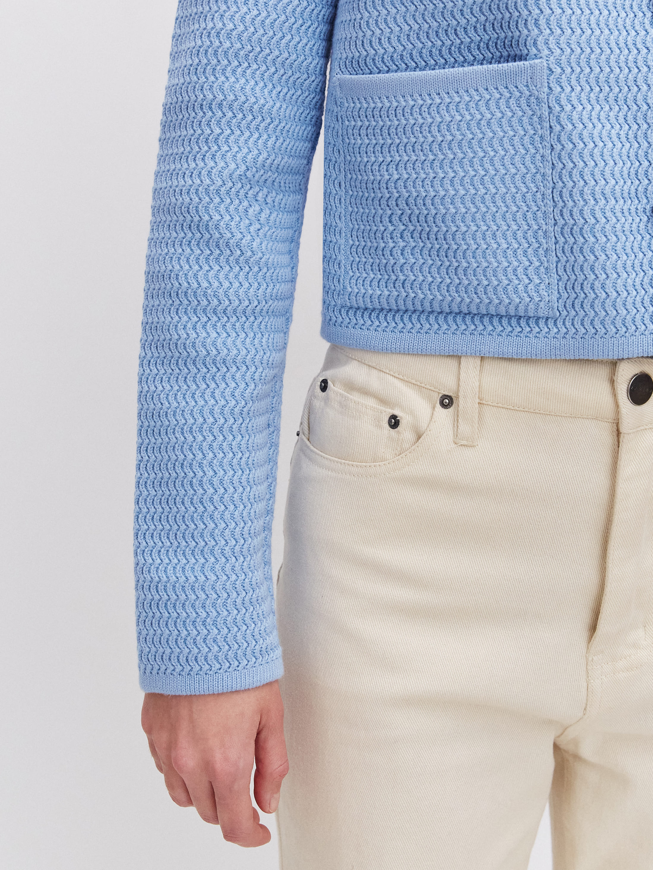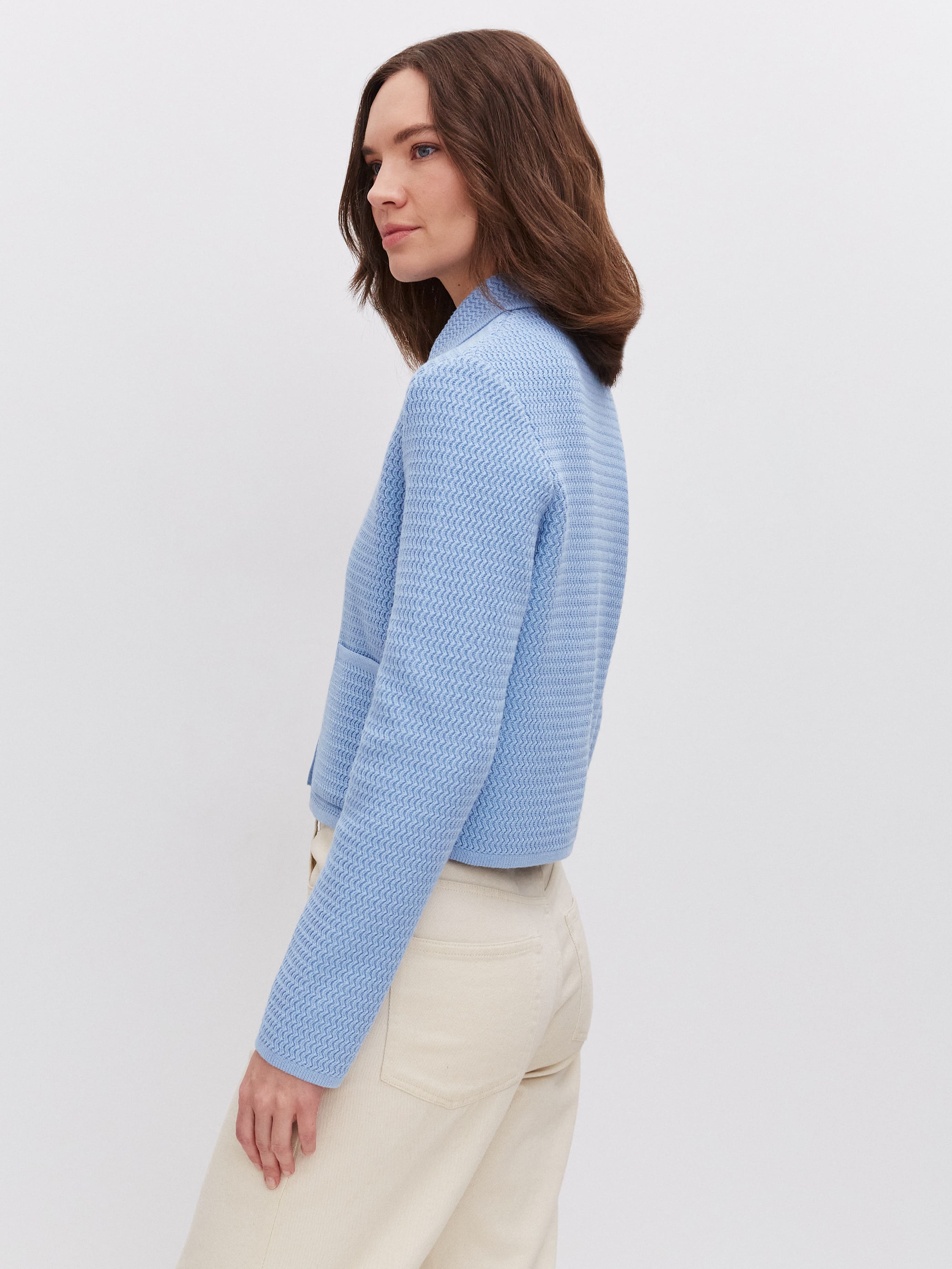 Облегченный мини-жакет, пришедший на смену тяжелым пиджакам из текстиля. Модель в стиле элегантных 60-х выполнена из нежного длинноволокнистого хлопка. Рельефная текстура трикотажа оттеняется контрастным рядом пуговиц. Добавление в пряжу небольшого количества полиамида позволило отказаться от подклада, стабилизирующего форму изделия. В итоге кроп-жакет прекрасно держит силуэт и сохраняет изумительную воздухопроницаемость, что открывает ему дорогу в весенне-летний гардероб.