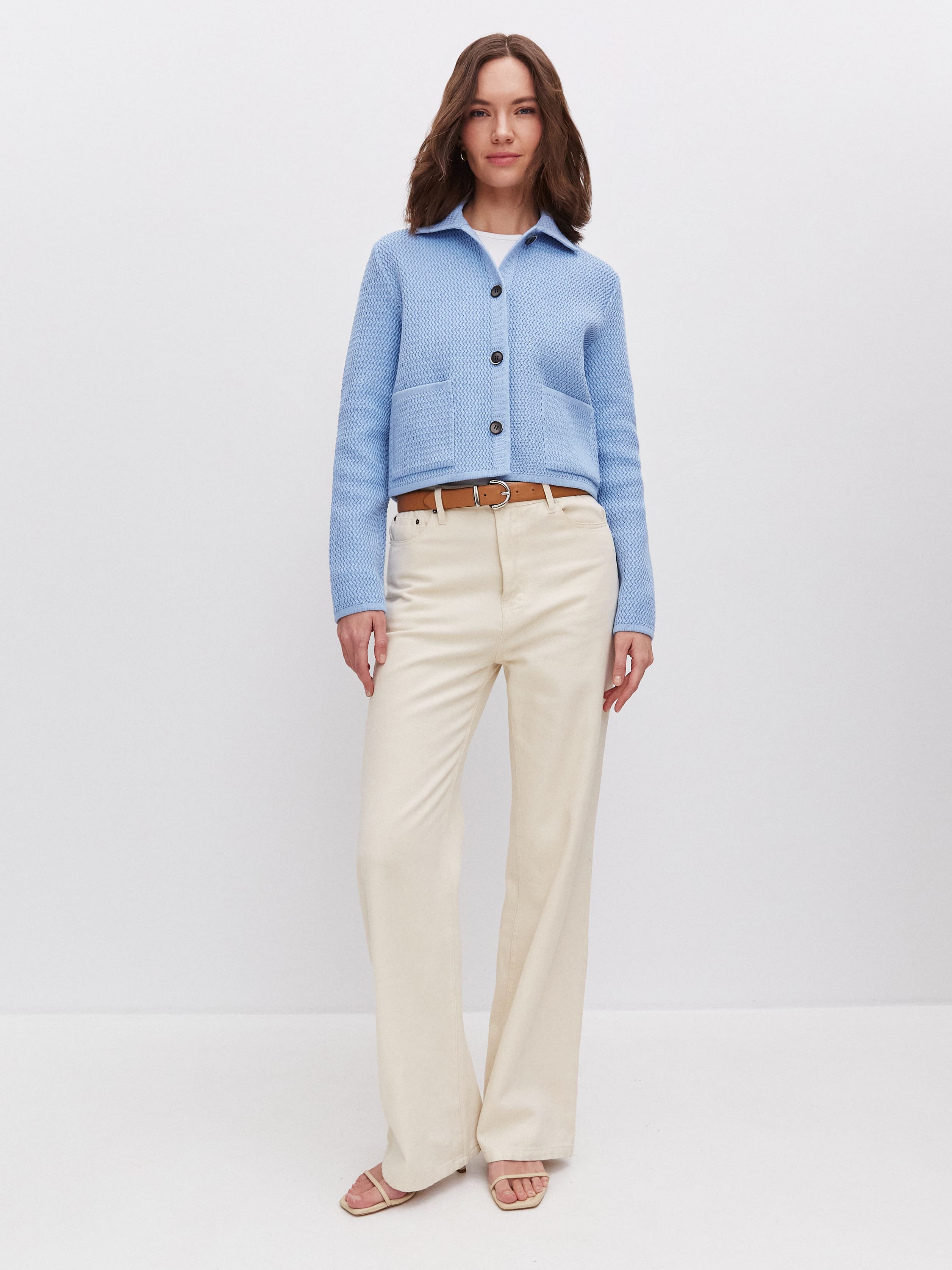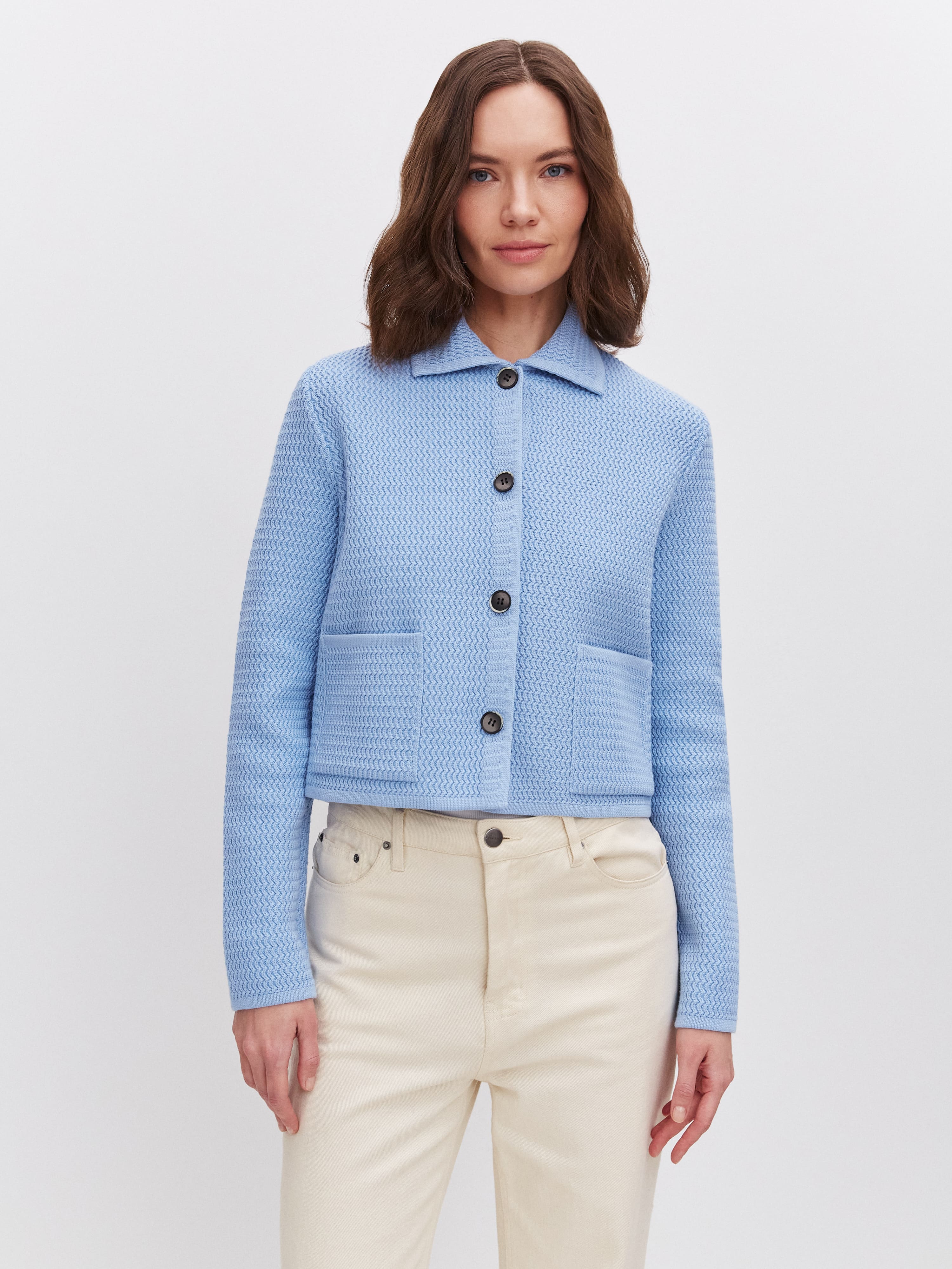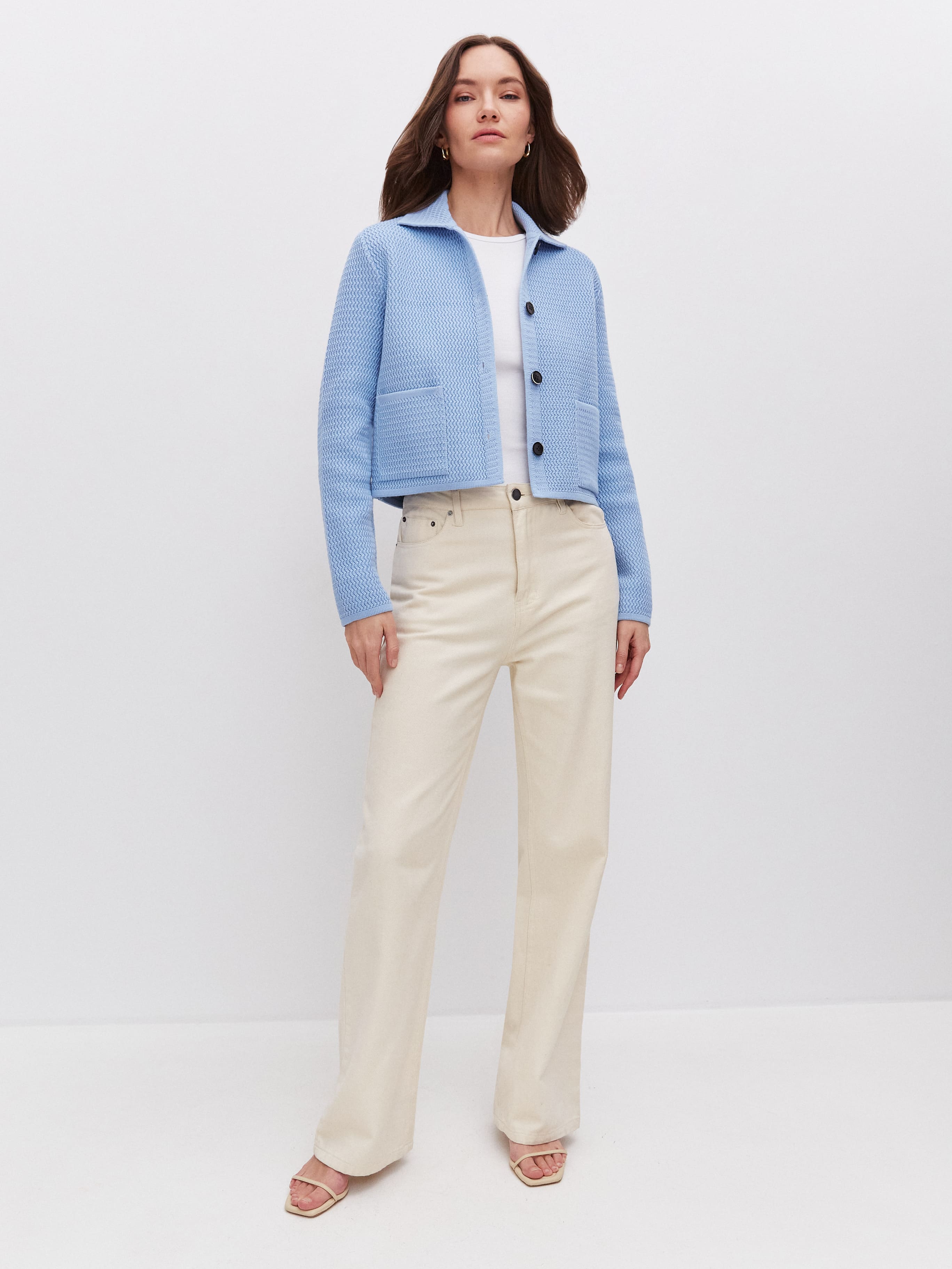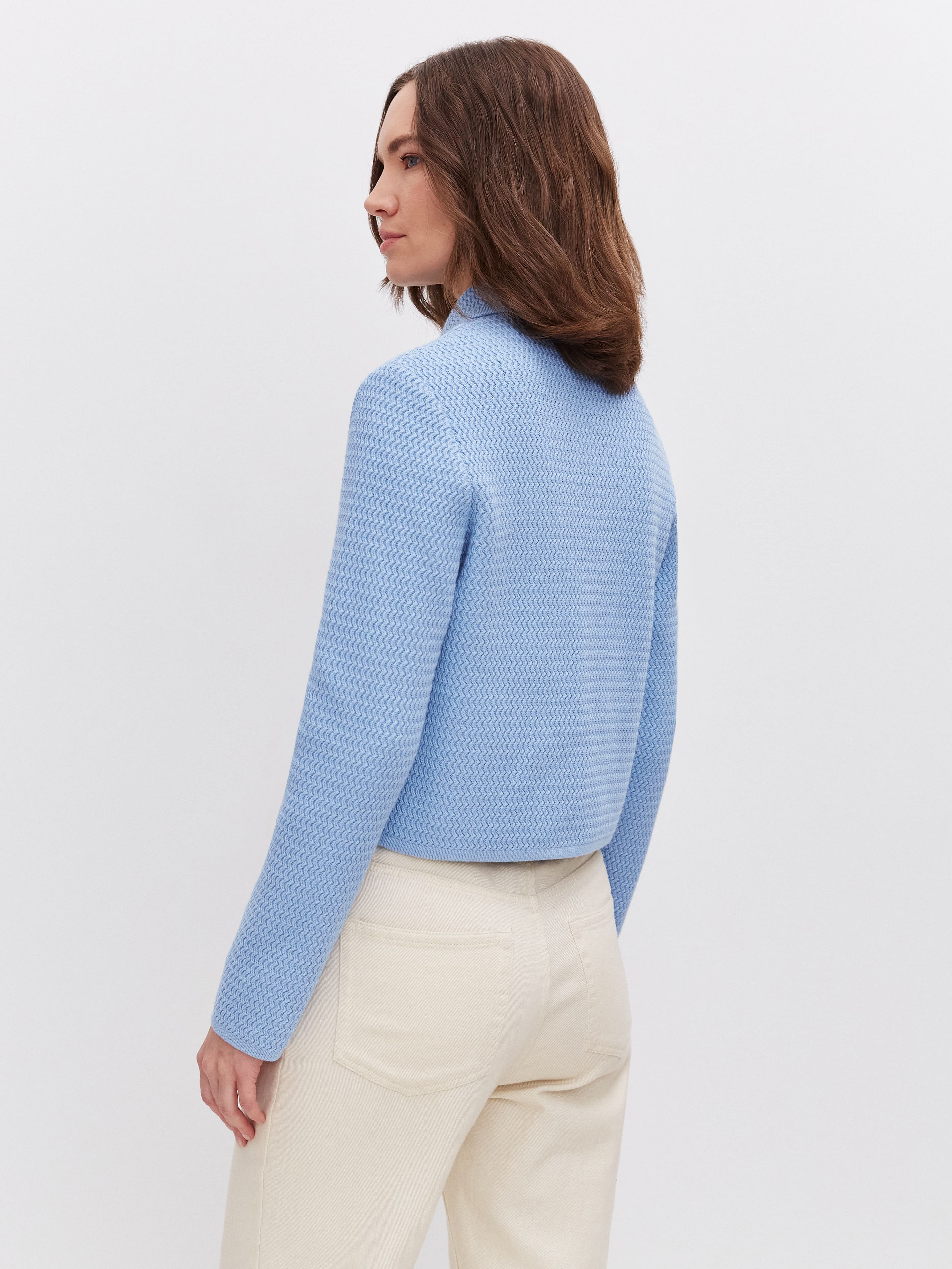 Облегченный мини-жакет, пришедший на смену тяжелым пиджакам из текстиля. Модель в стиле элегантных 60-х выполнена из нежного длинноволокнистого хлопка. Рельефная текстура трикотажа оттеняется контрастным рядом пуговиц. Добавление в пряжу небольшого количества полиамида позволило отказаться от подклада, стабилизирующего форму изделия. В итоге кроп-жакет прекрасно держит силуэт и сохраняет изумительную воздухопроницаемость, что открывает ему дорогу в весенне-летний гардероб.