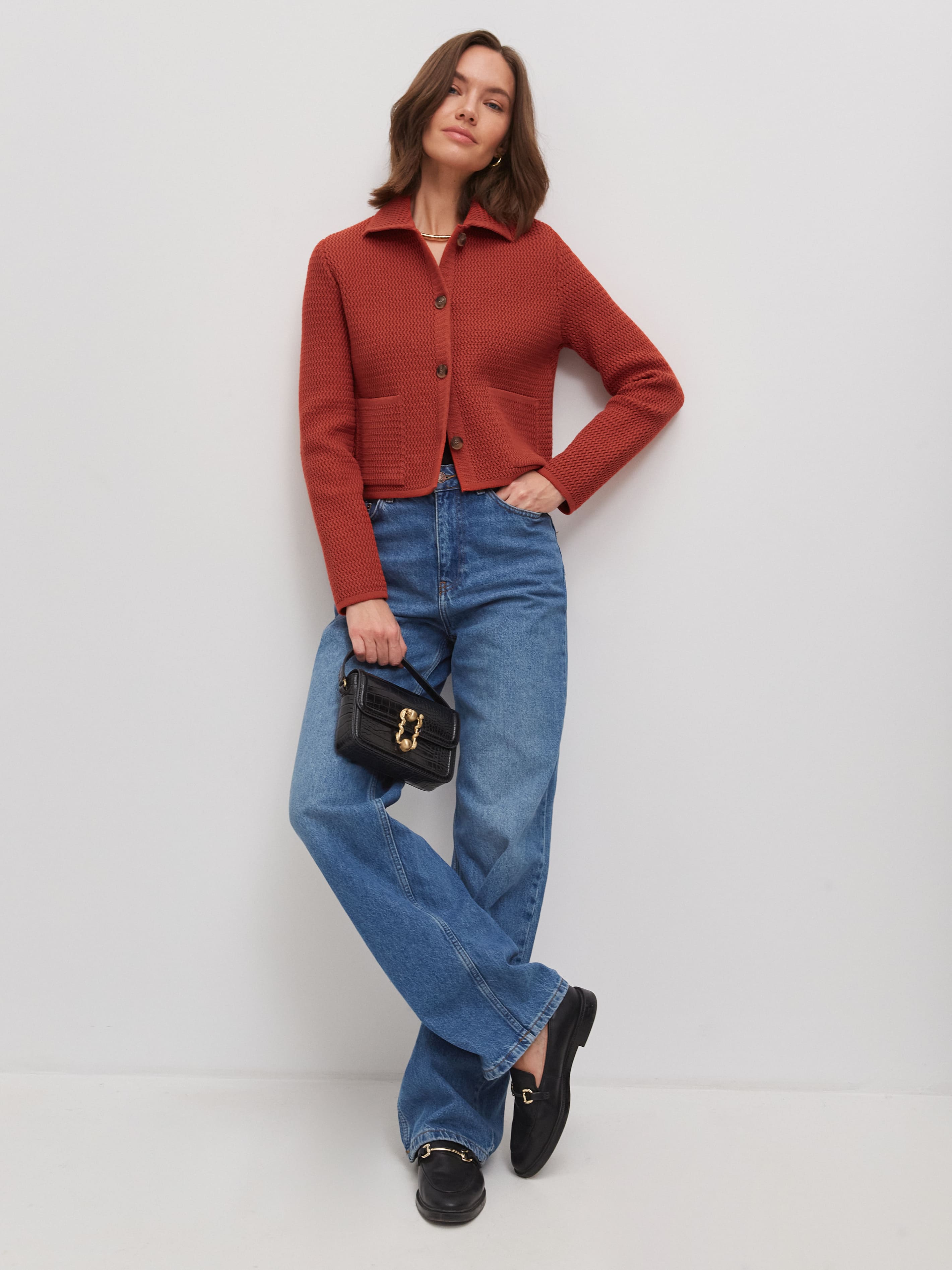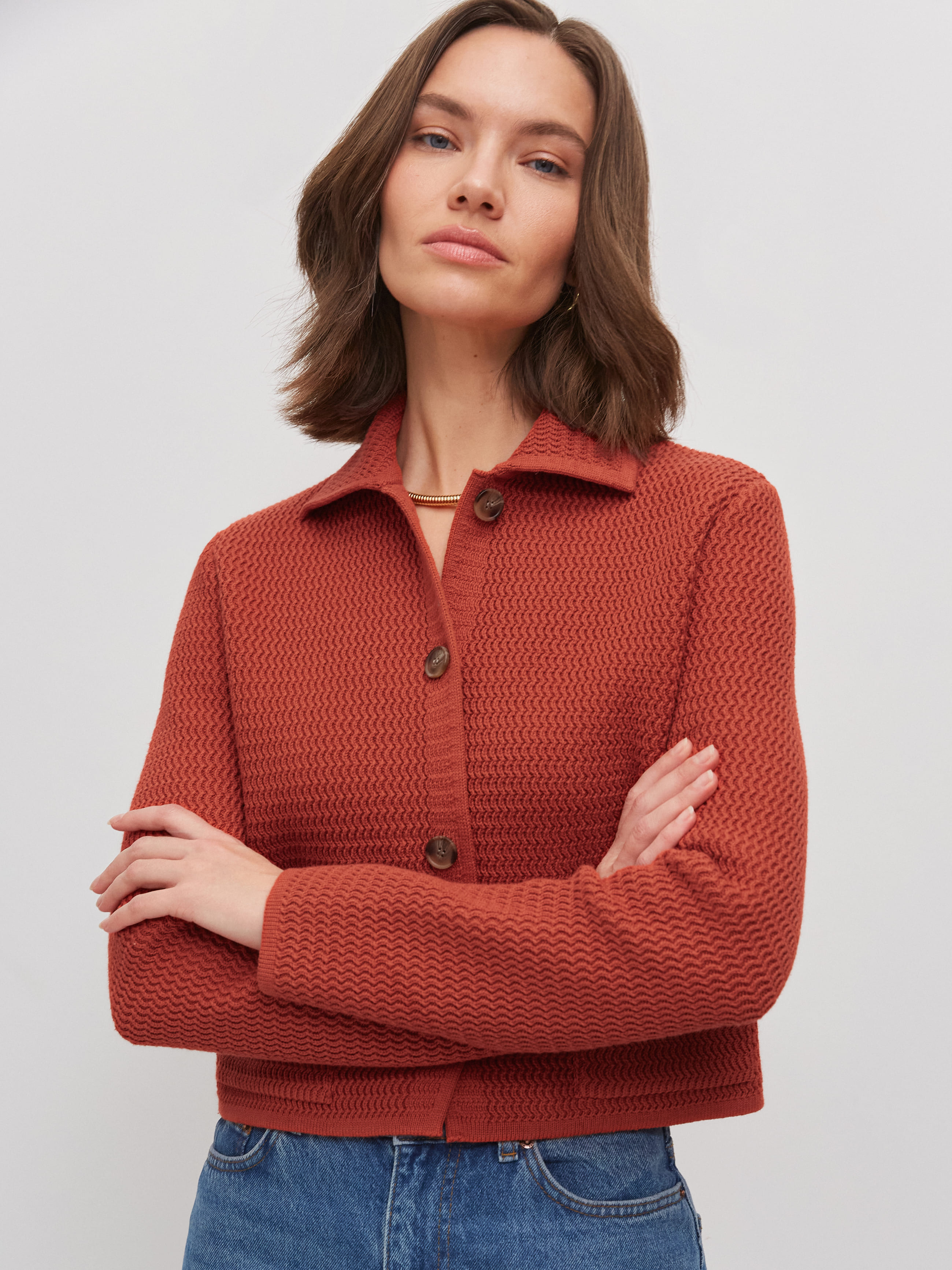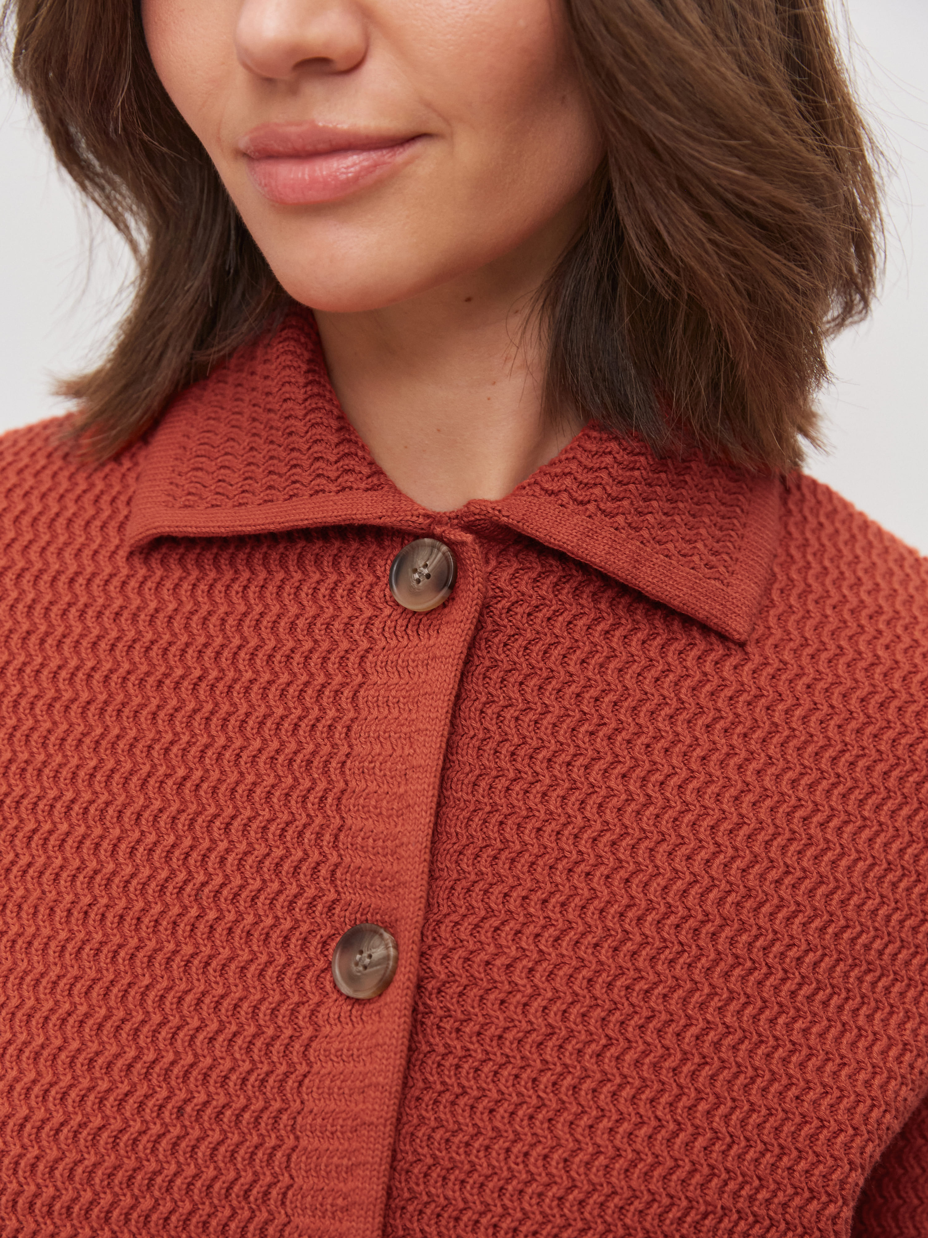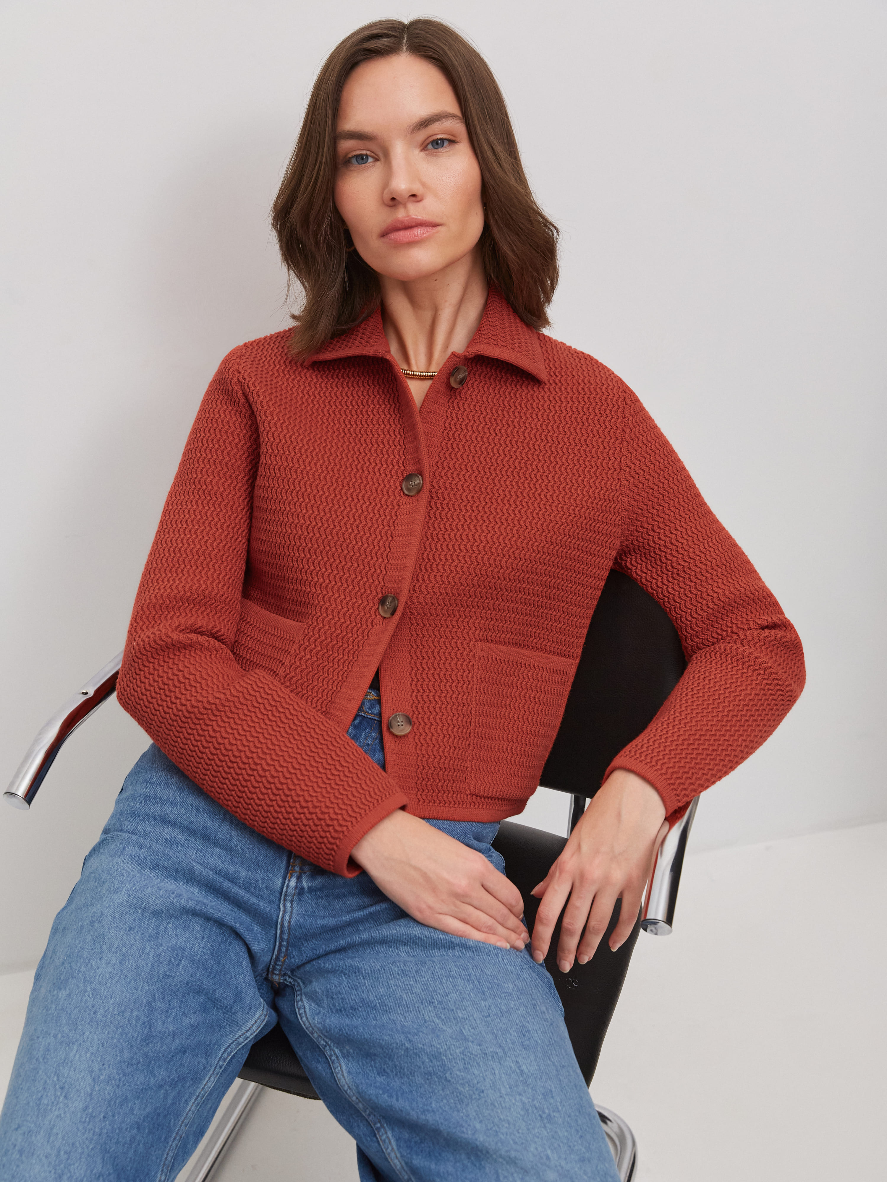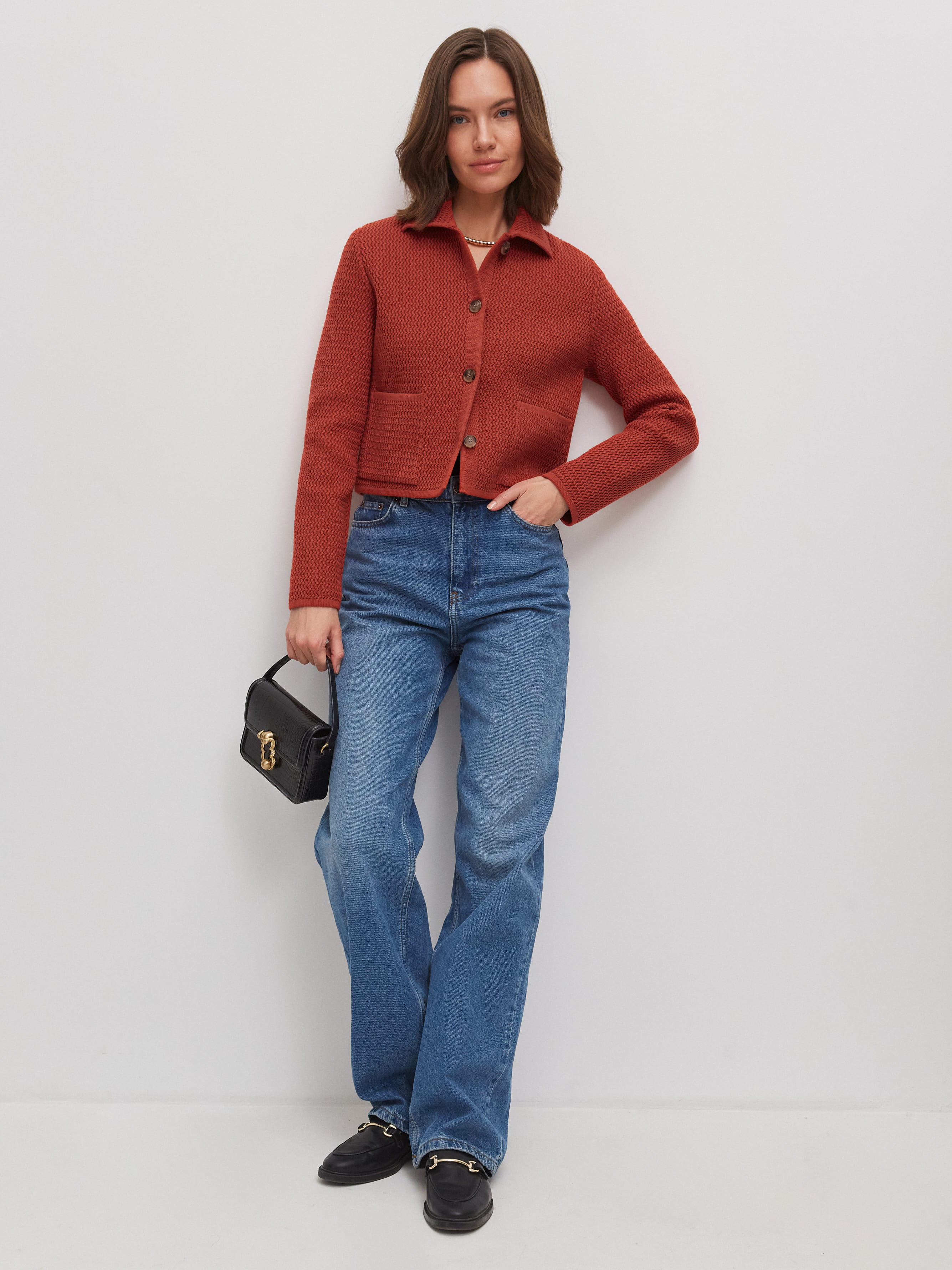 Облегченный мини-жакет, пришедший на смену тяжелым пиджакам из текстиля. Модель в стиле элегантных 60-х выполнена из нежного длинноволокнистого хлопка. Рельефная текстура трикотажа оттеняется контрастным рядом пуговиц. Добавление в пряжу небольшого количества полиамида позволило отказаться от подклада, стабилизирующего форму изделия. В итоге кроп-жакет прекрасно держит силуэт и сохраняет изумительную воздухопроницаемость, что открывает ему дорогу в весенне-летний гардероб.