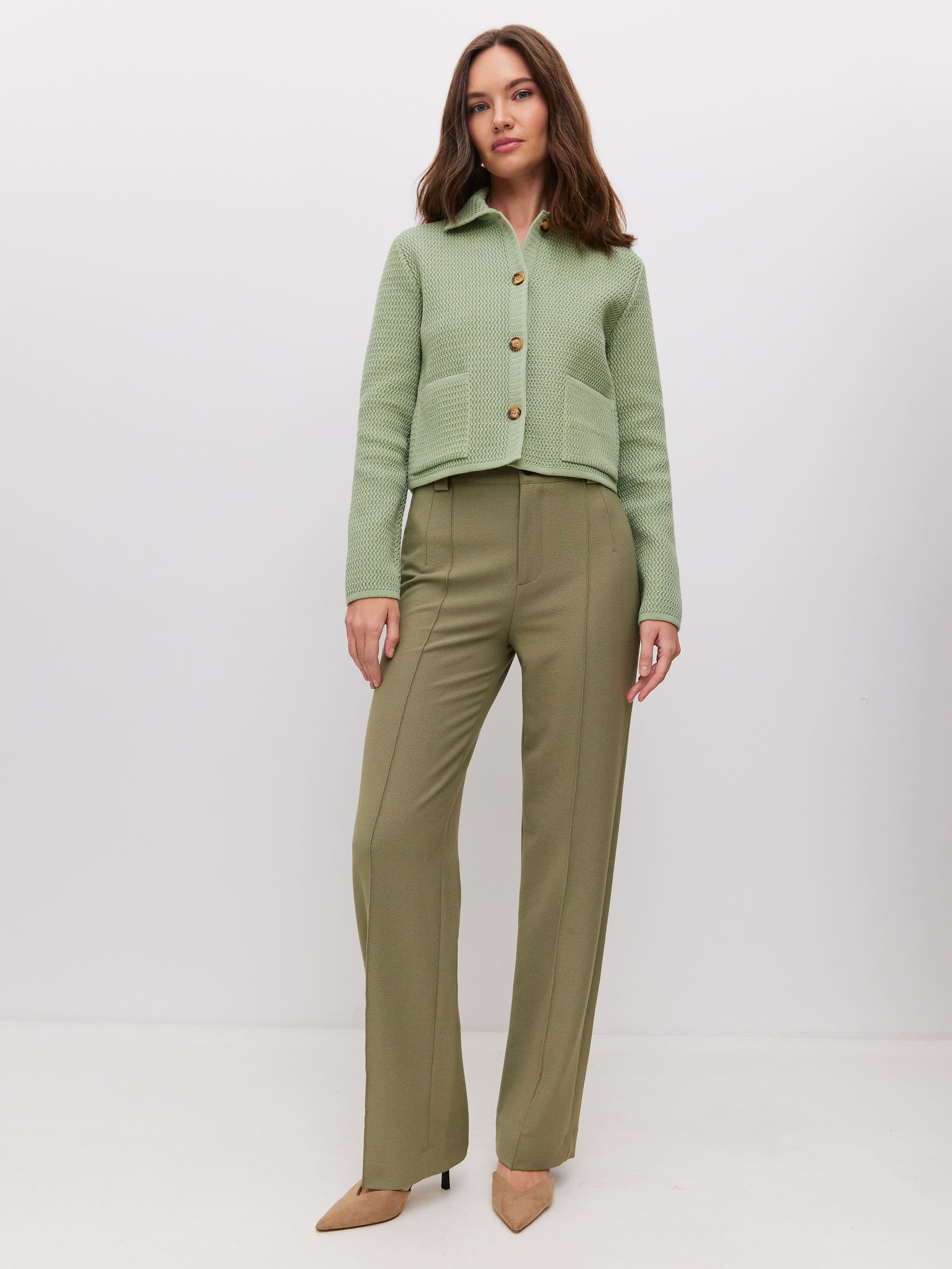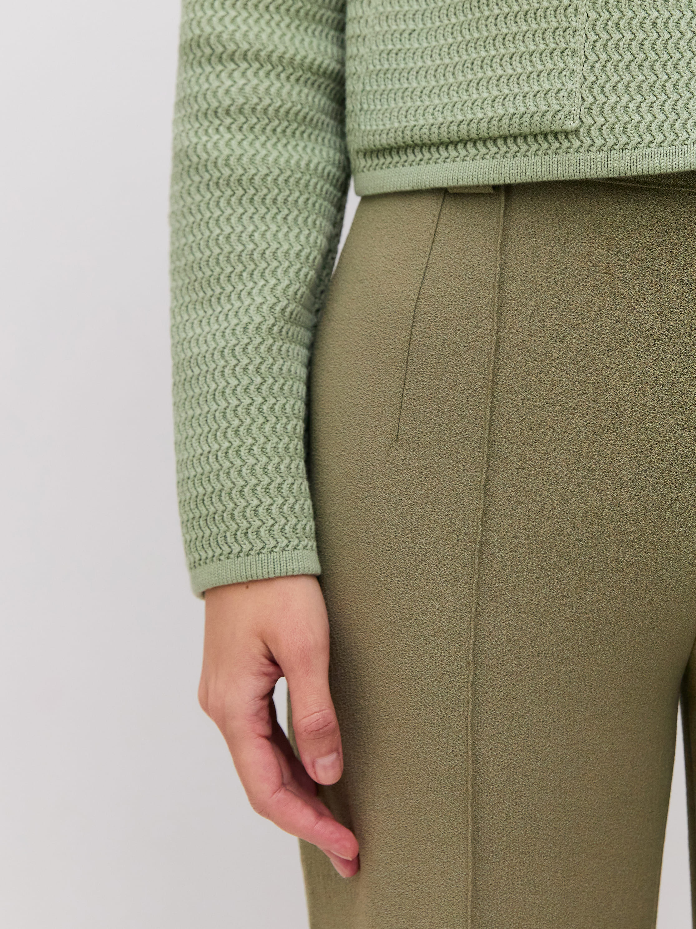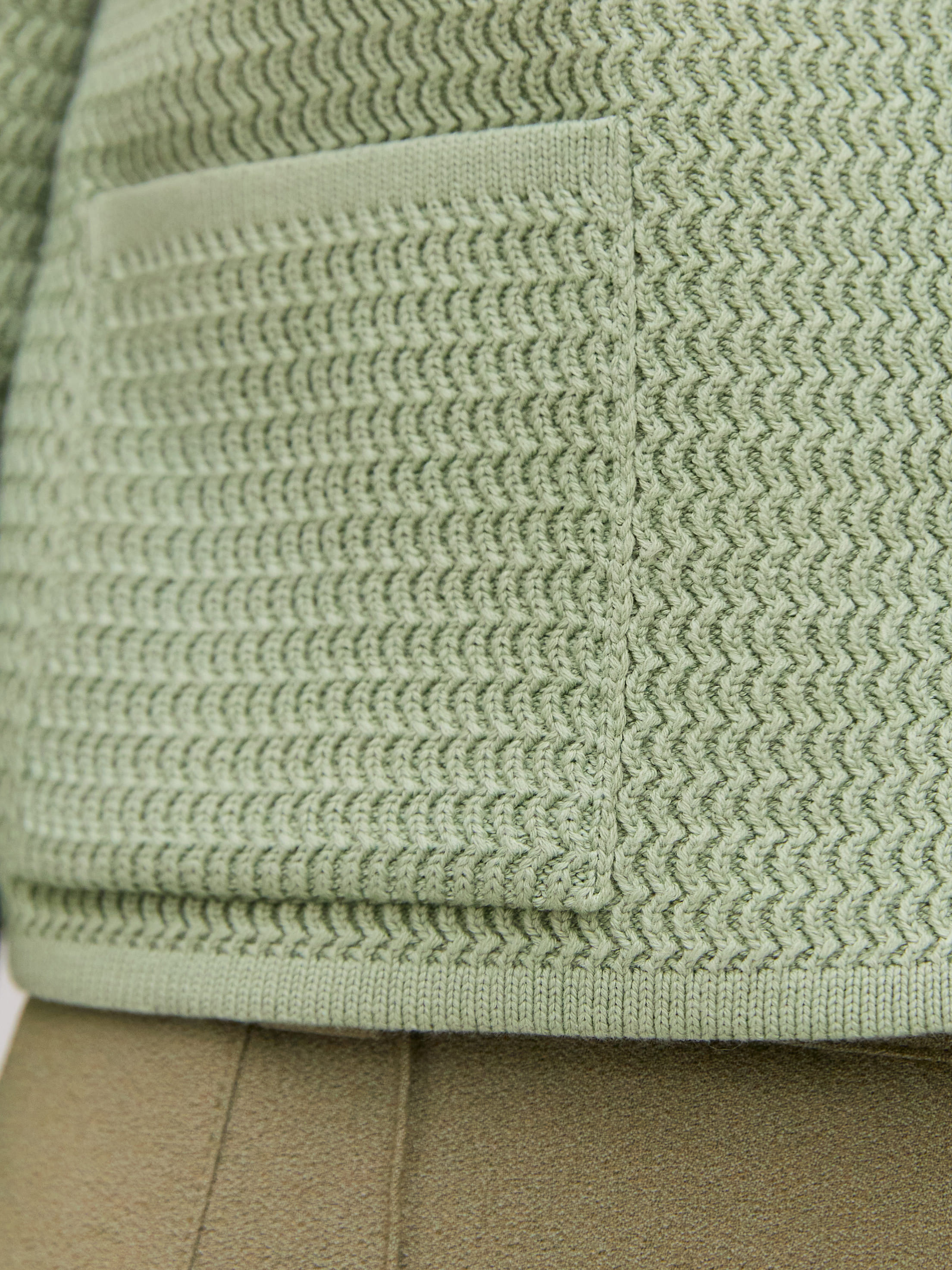 Облегченный мини-жакет, пришедший на смену тяжелым пиджакам из текстиля. Модель в стиле элегантных 60-х выполнена из нежного длинноволокнистого хлопка. Рельефная текстура трикотажа оттеняется контрастным рядом пуговиц. Добавление в пряжу небольшого количества полиамида позволило отказаться от подклада, стабилизирующего форму изделия. В итоге кроп-жакет прекрасно держит силуэт и сохраняет изумительную воздухопроницаемость, что открывает ему дорогу в весенне-летний гардероб.