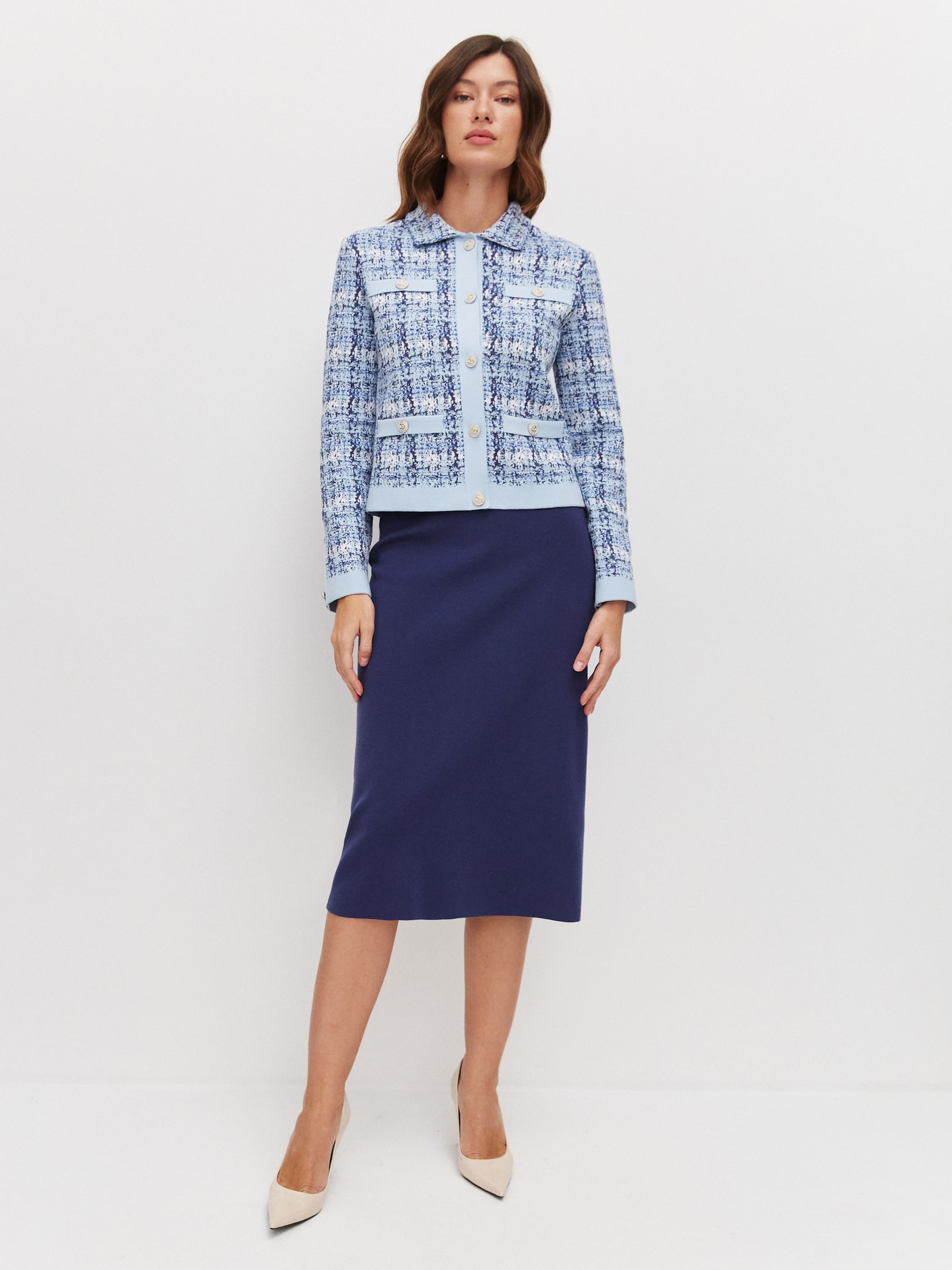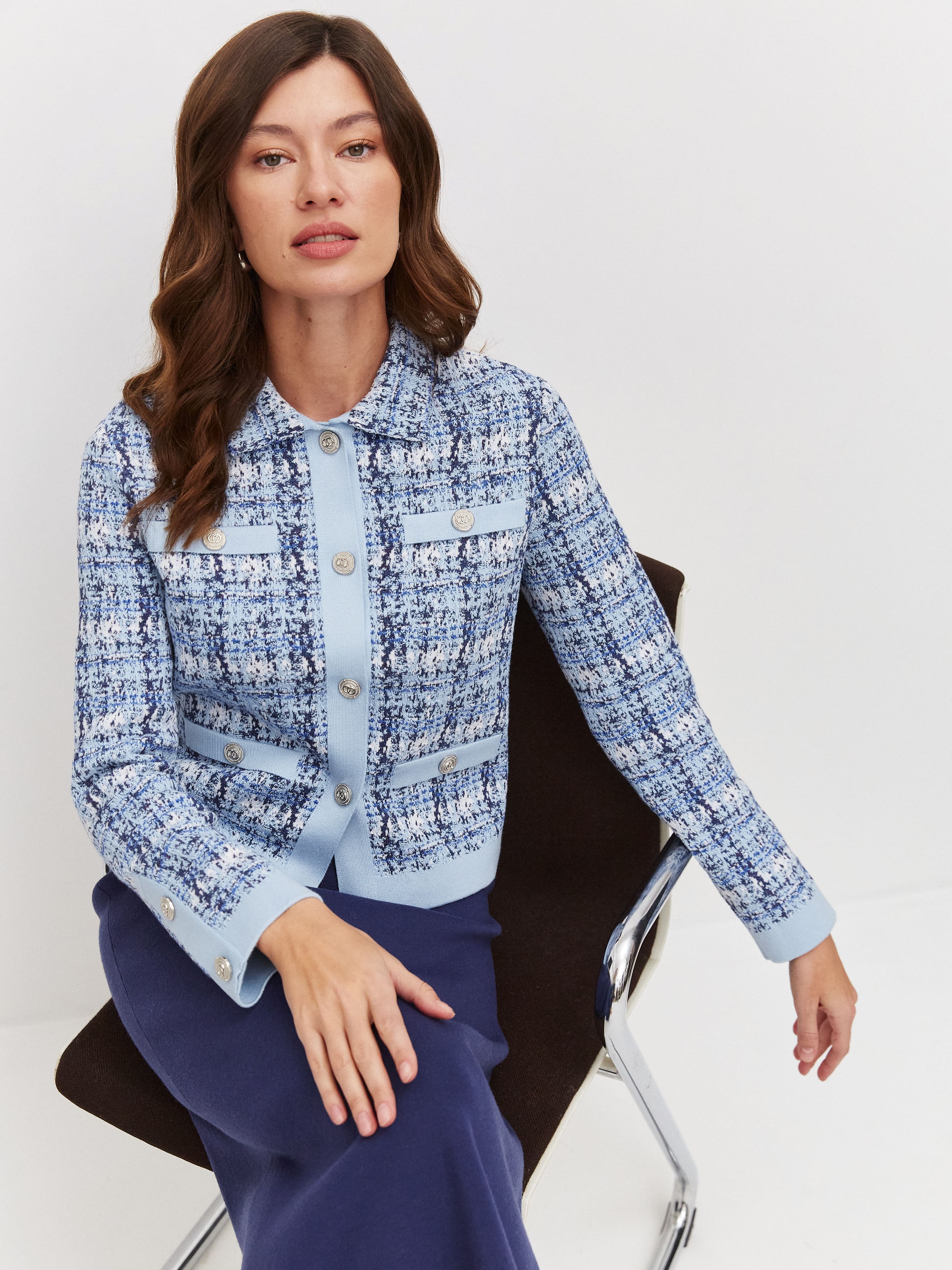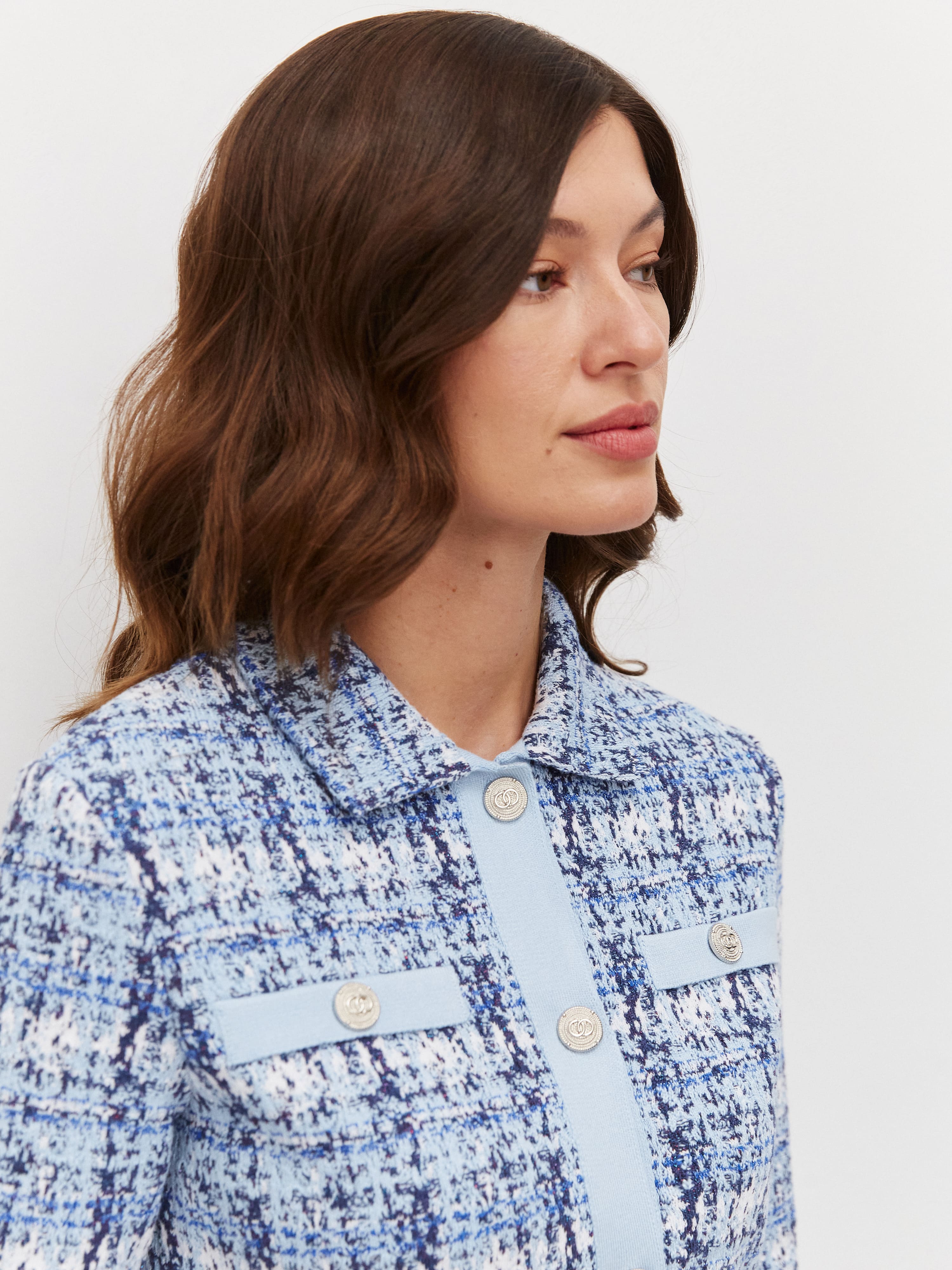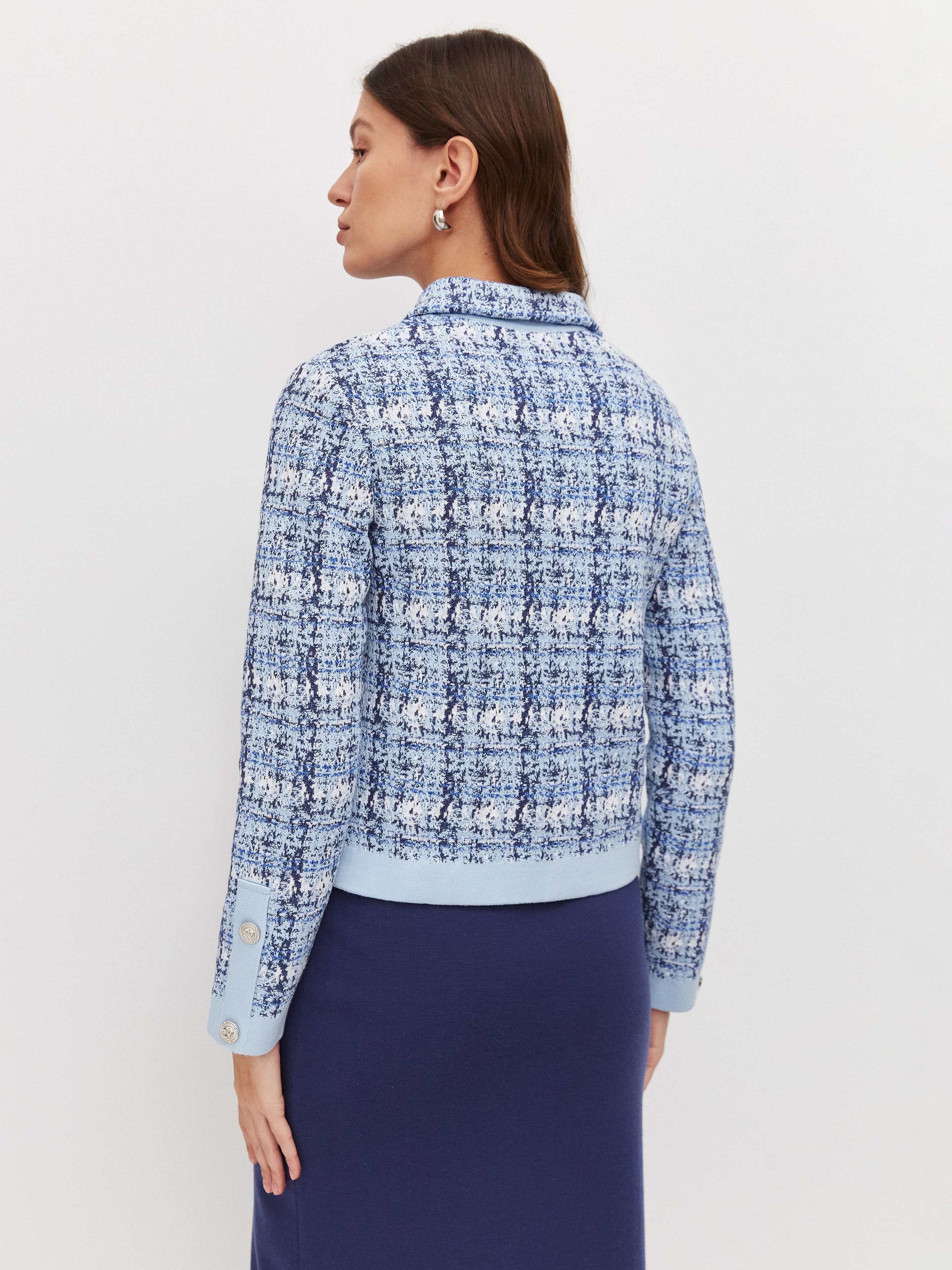 Модель классического жакета с воротничком и акцентными пуговицами в эстетике дома Шанель. Хлопковое полотно пиджака имитирует текстуру французского твида. Переплетение нескольких нитей разной плотности и оттенков создает эффектный градиент на лицевой стороне изделия. Стильную выразительность жакету придает отделка – края полочек, планка и карманные листочки из гладкого контрастного трикотажа. Пиджак не дублирован подкладом, поэтому сохраняет максимально дышащую структуру и необходимую пластичность. Собирается в комплект с такой же фактурной юбкой из нашей коллекции и сочетается любым текстильным низом.