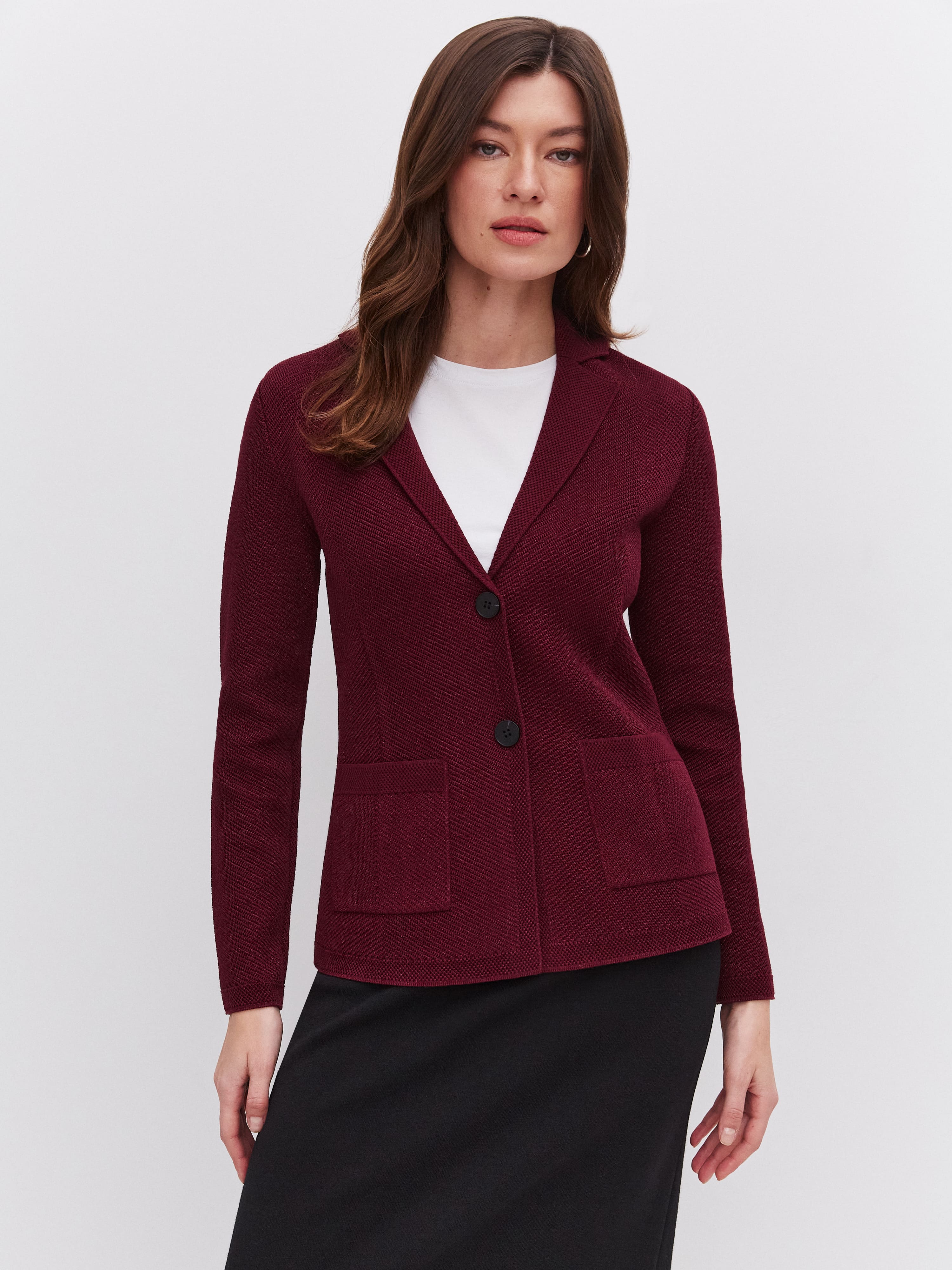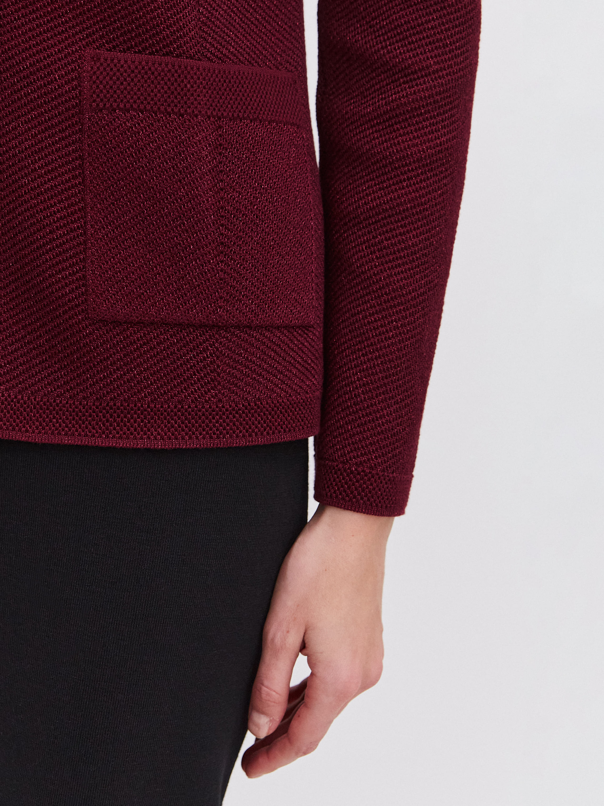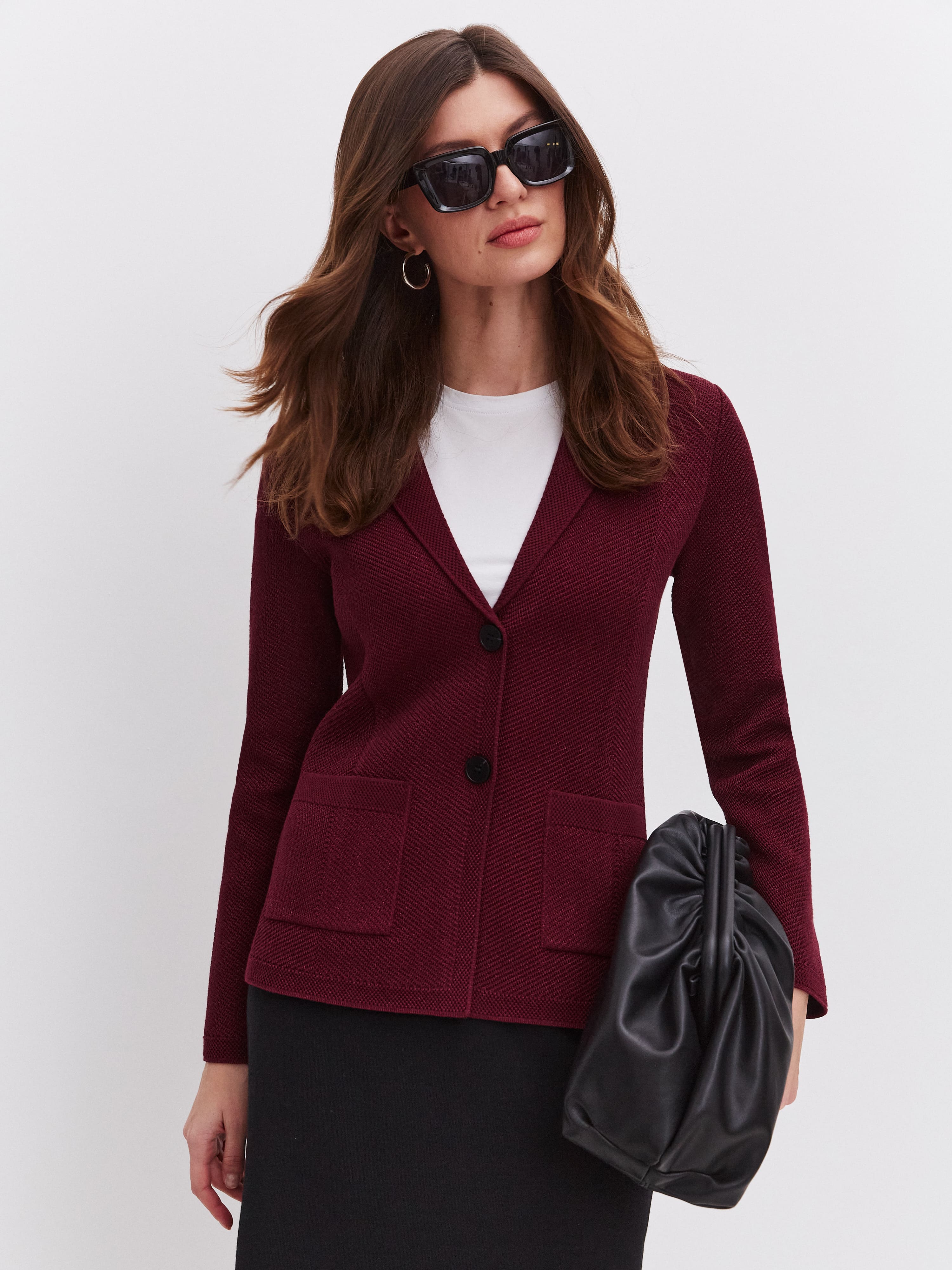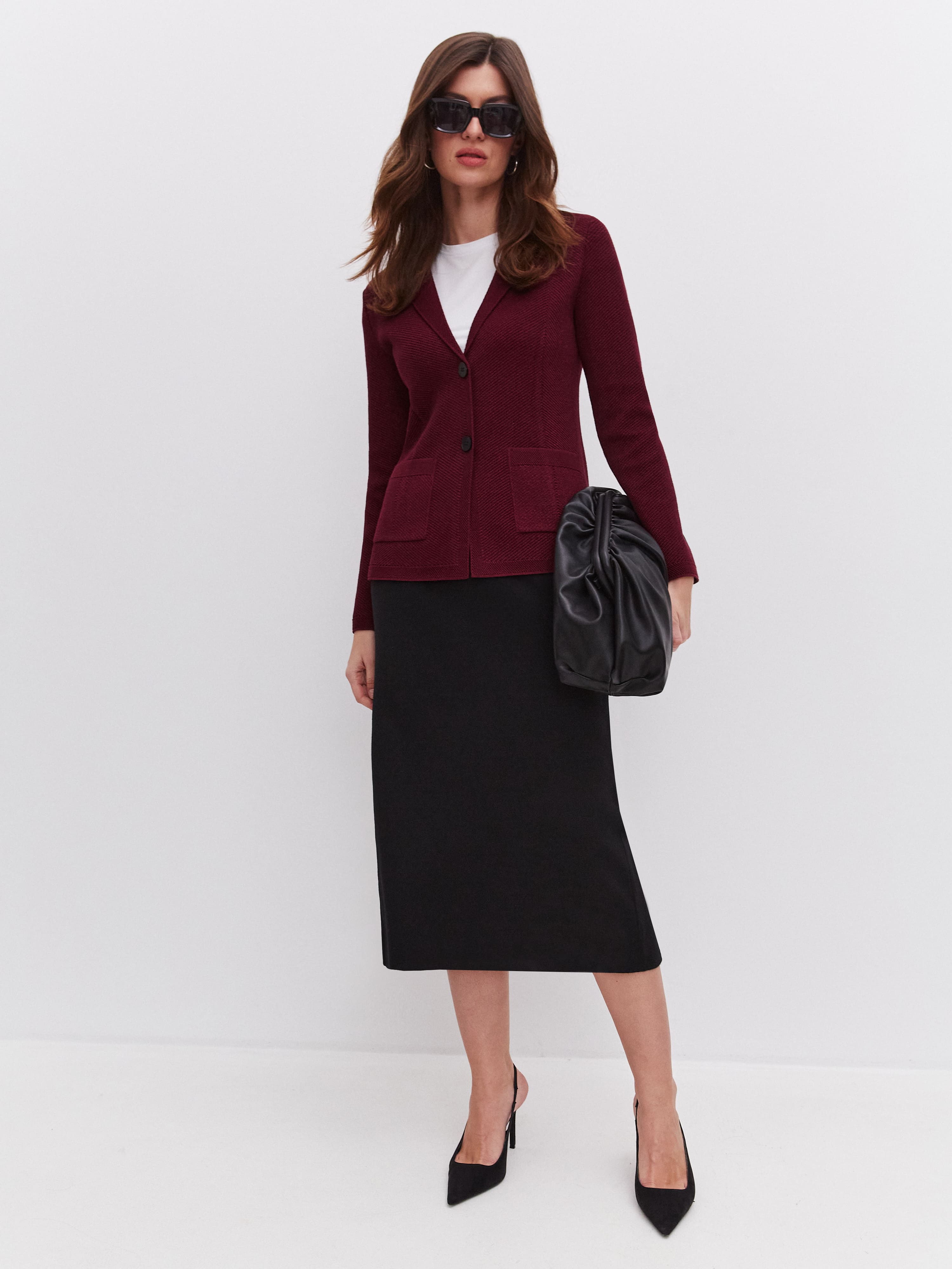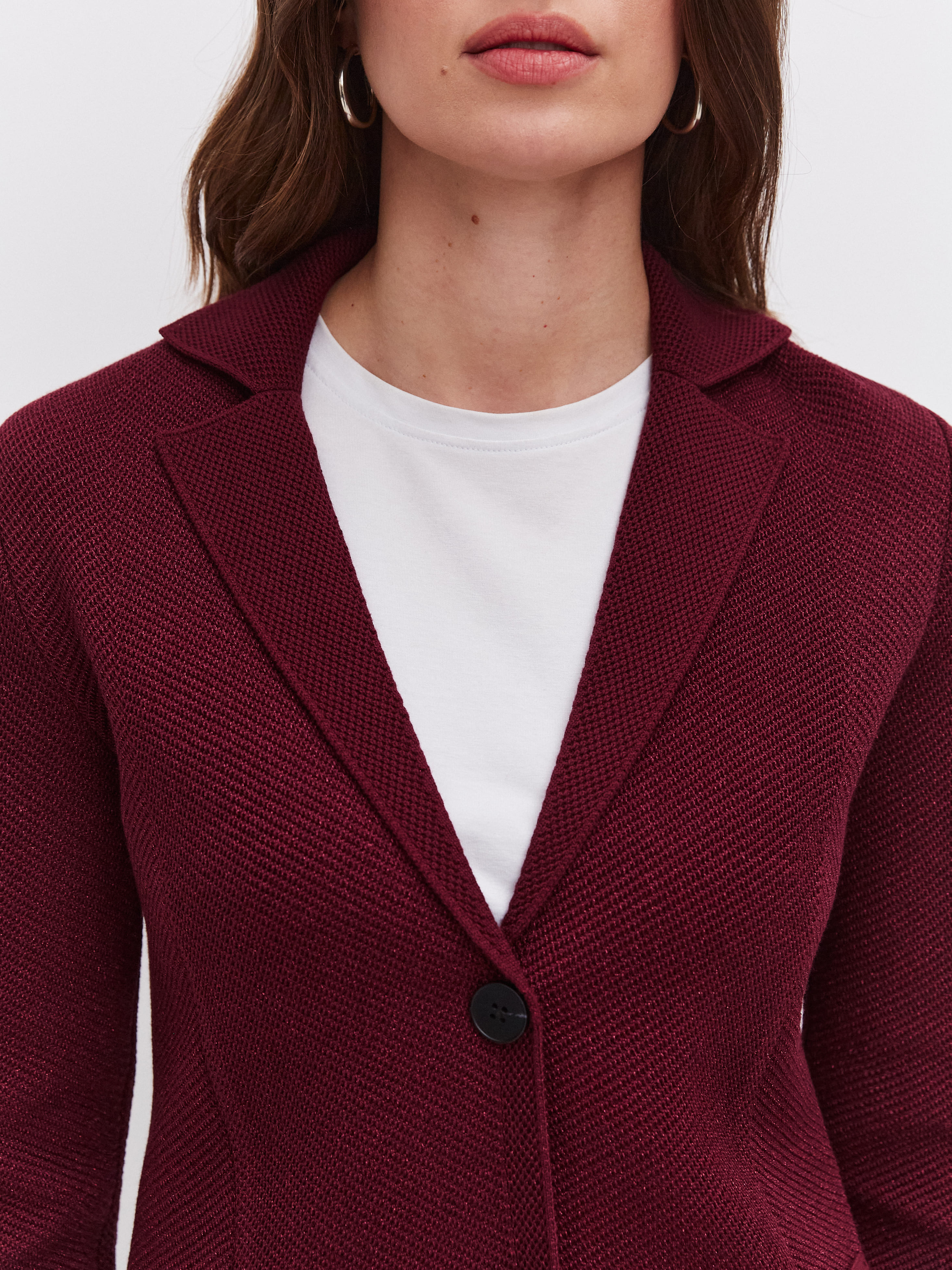 Чтобы придать этому жакету деликатное сияние, мы использовали серебряный люрекс. Соединенный с мягким хлопковым трикотажем, он превратился в приятное на ощупь и формоустойчивое полотно. Контрастная отделка по вороту и карманам пиджака делает его уместным даже в повседневных стилизациях. Подсказка: если нравятся более выразительные металлик-текстуры и радужный блеск, ищите в каталоге жакет Антарес, расшитый AB-пайетками.