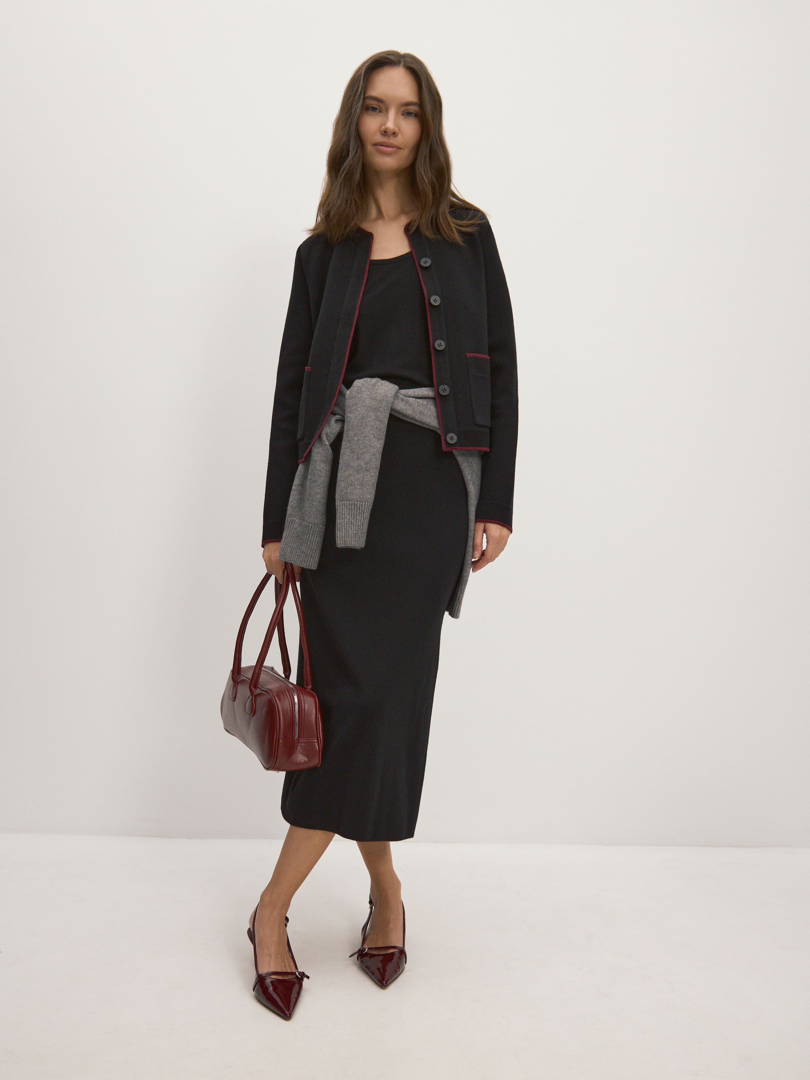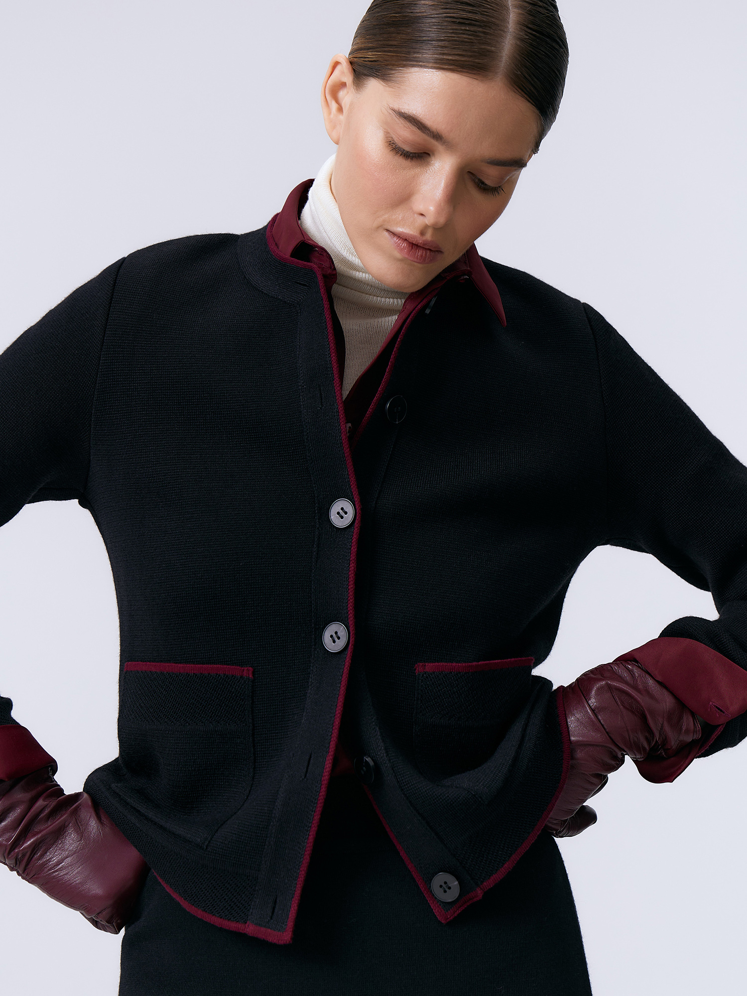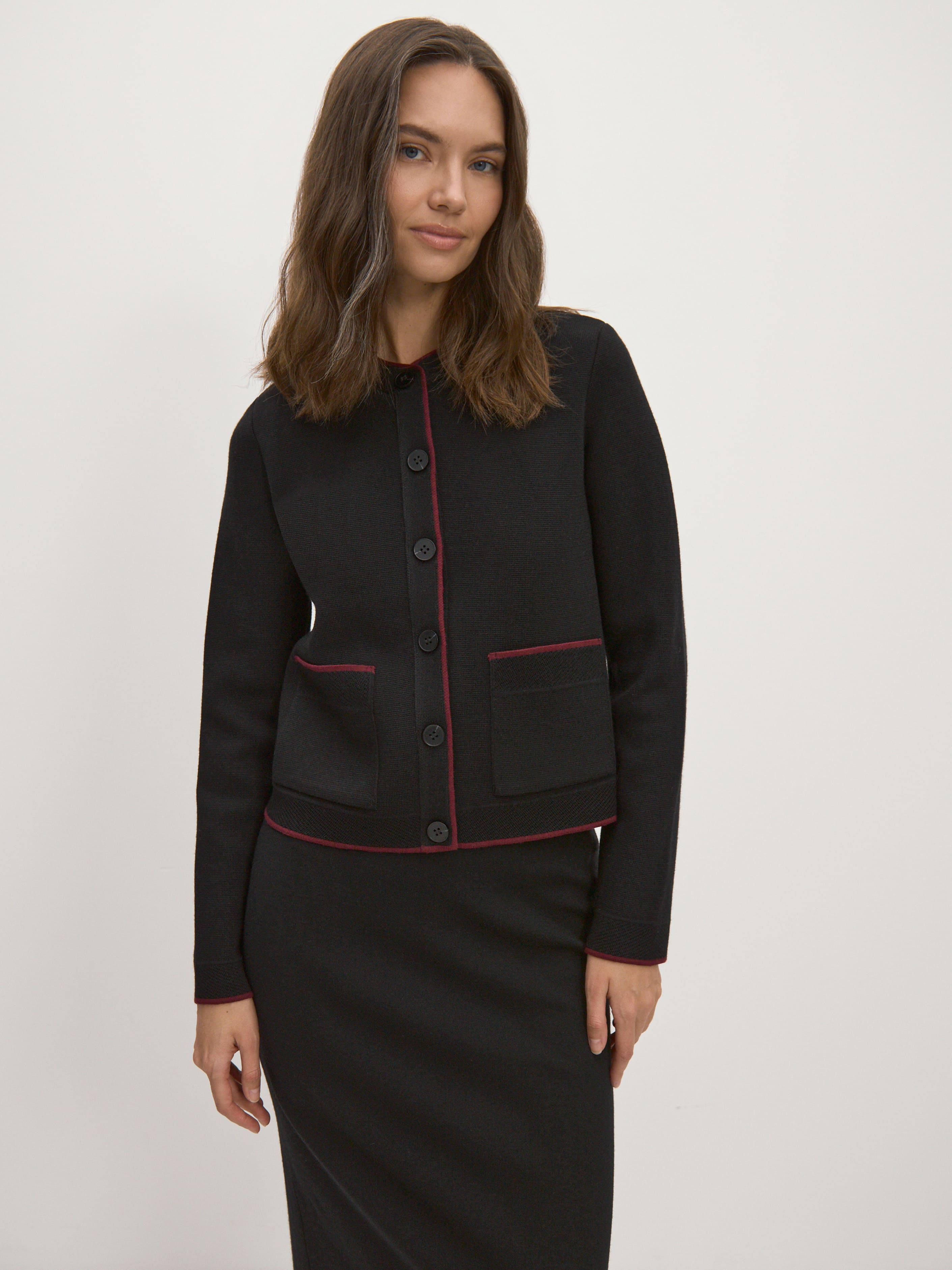 Наш маленький шерстяной жакет создан для ситуаций, когда приходится искать баланс между теплой кофточкой и классикой делового гардероба. Его прямой крой и сдержанная отделка не противоречат офисному дресс-коду. При этом в нем гораздо комфортнее, чем в текстильном пиджаке. Модель выполнена из трикотажа повышенной плотности. Именно он отвечает за стабильность формы и строгий силуэт жакета.