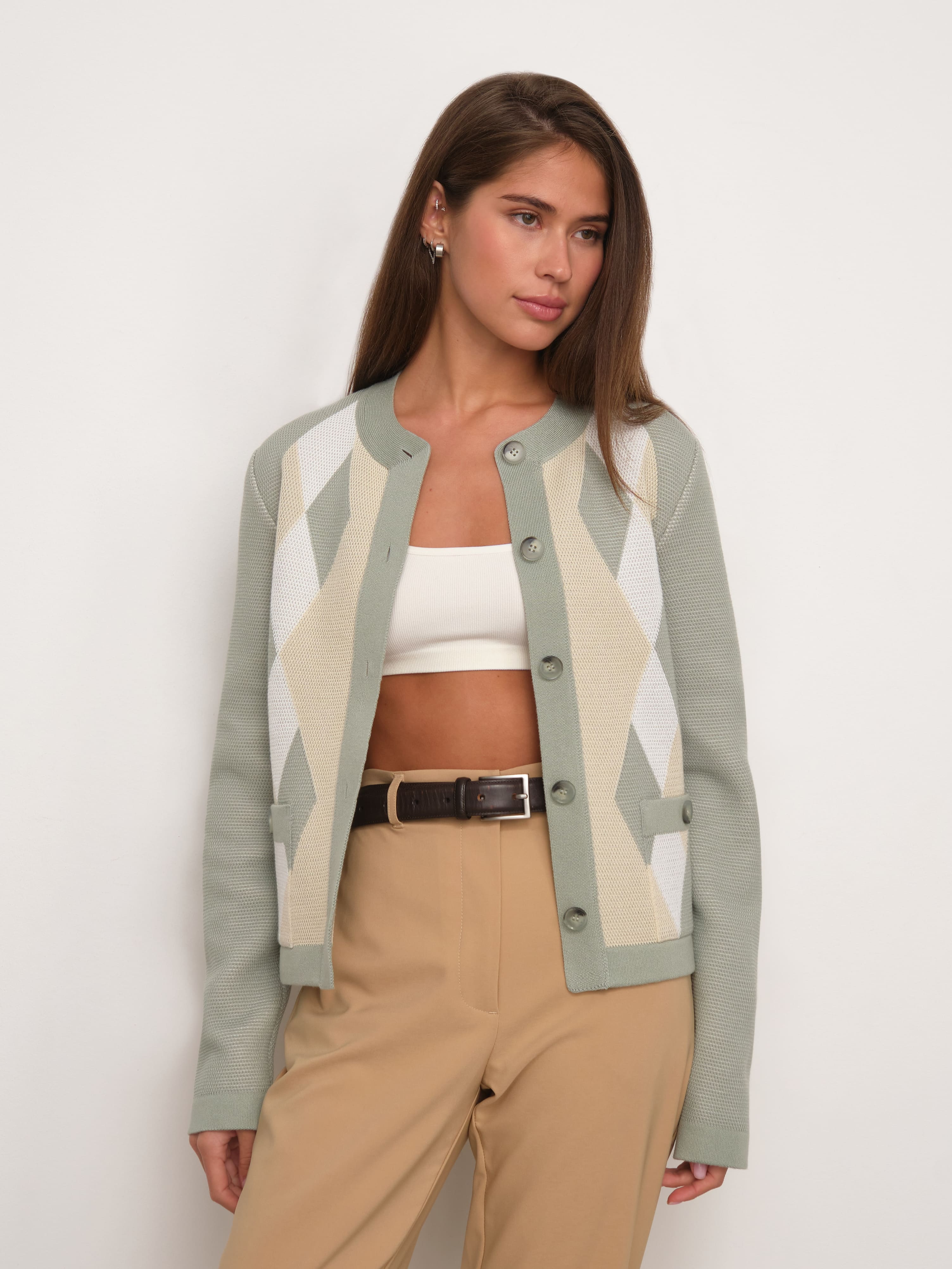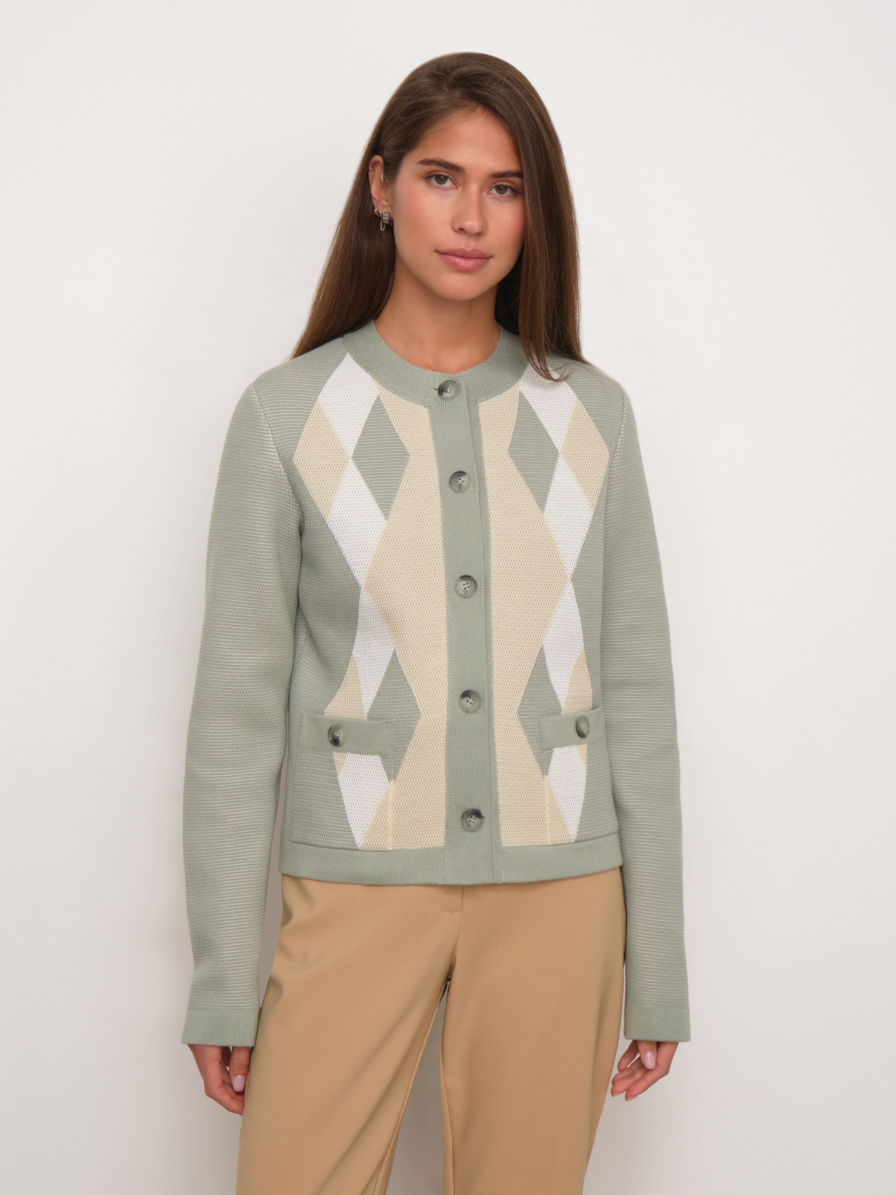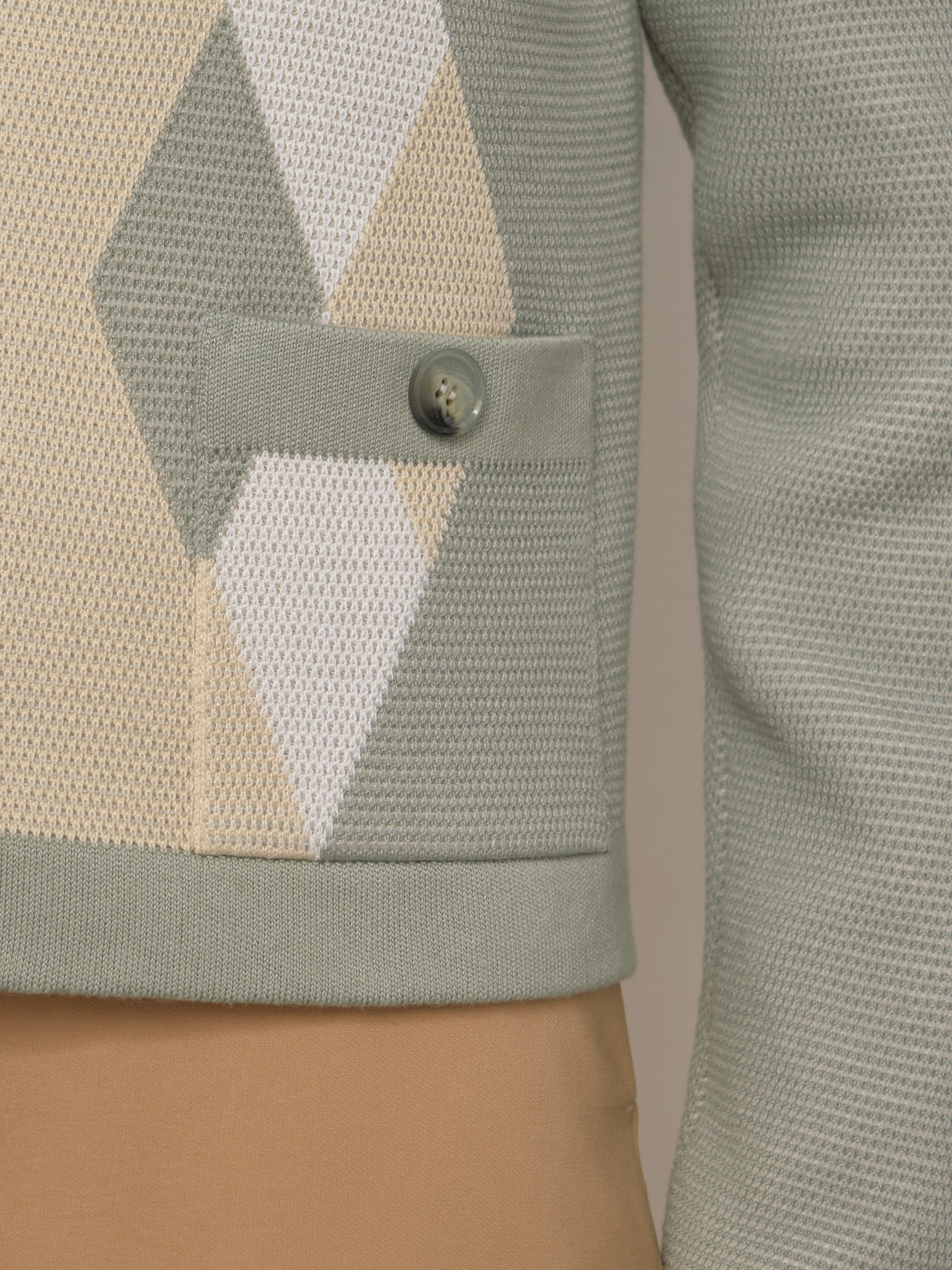 Весенний хлопковый жакет с геометрическим принтом, которого так не хватало вашим офисным капсулам. Мы создали его из премиальной пряжи с включением вискозы и слегка поиграли с техникой вязания. Присмотритесь к петелькам. Они располагаются послойно, что дает эффект объемной текстуры и формирует двойной оттенок трикотажного полотна. Модель доступна в нежных пастельных и строгих базовых расцветках.