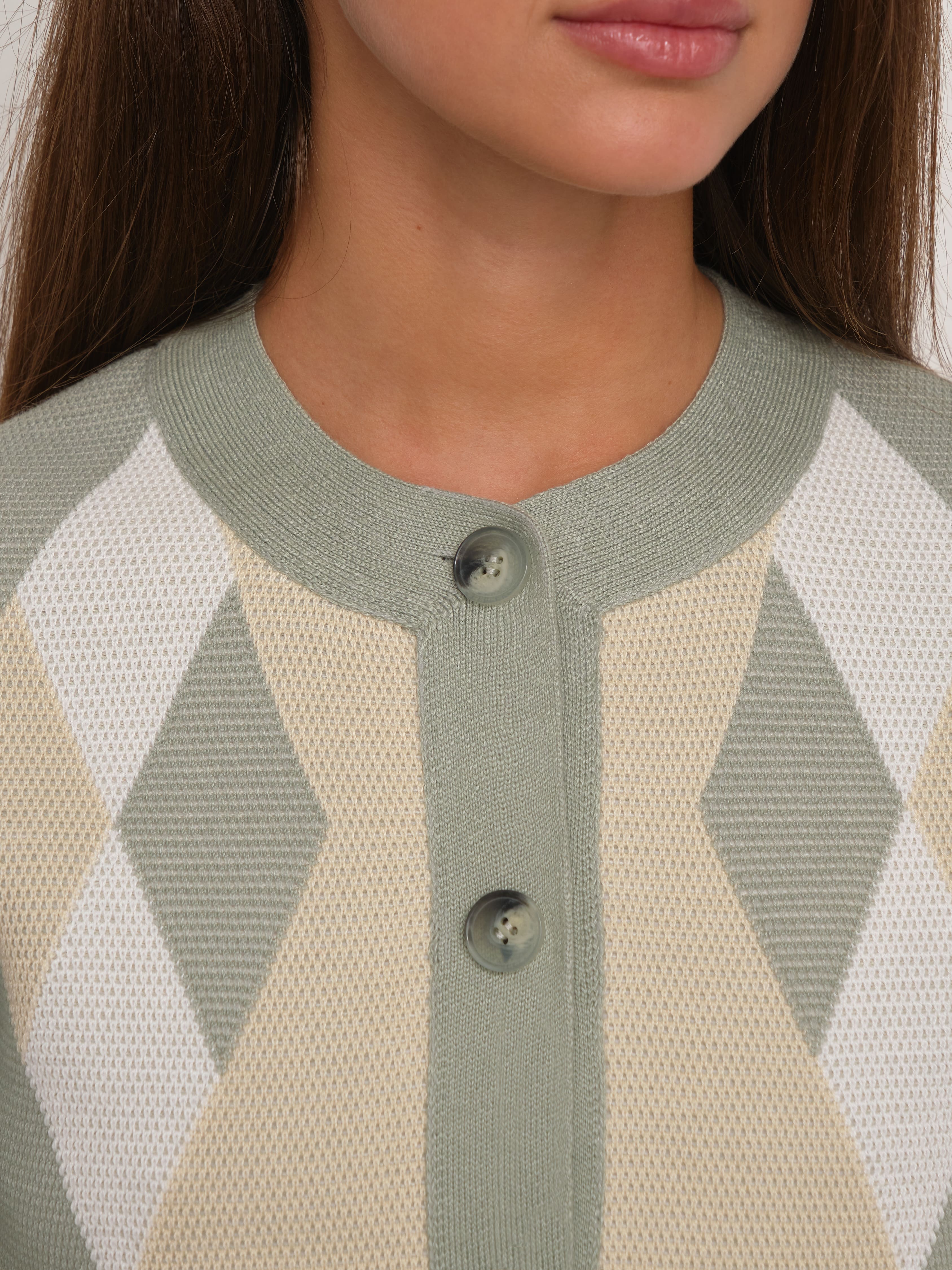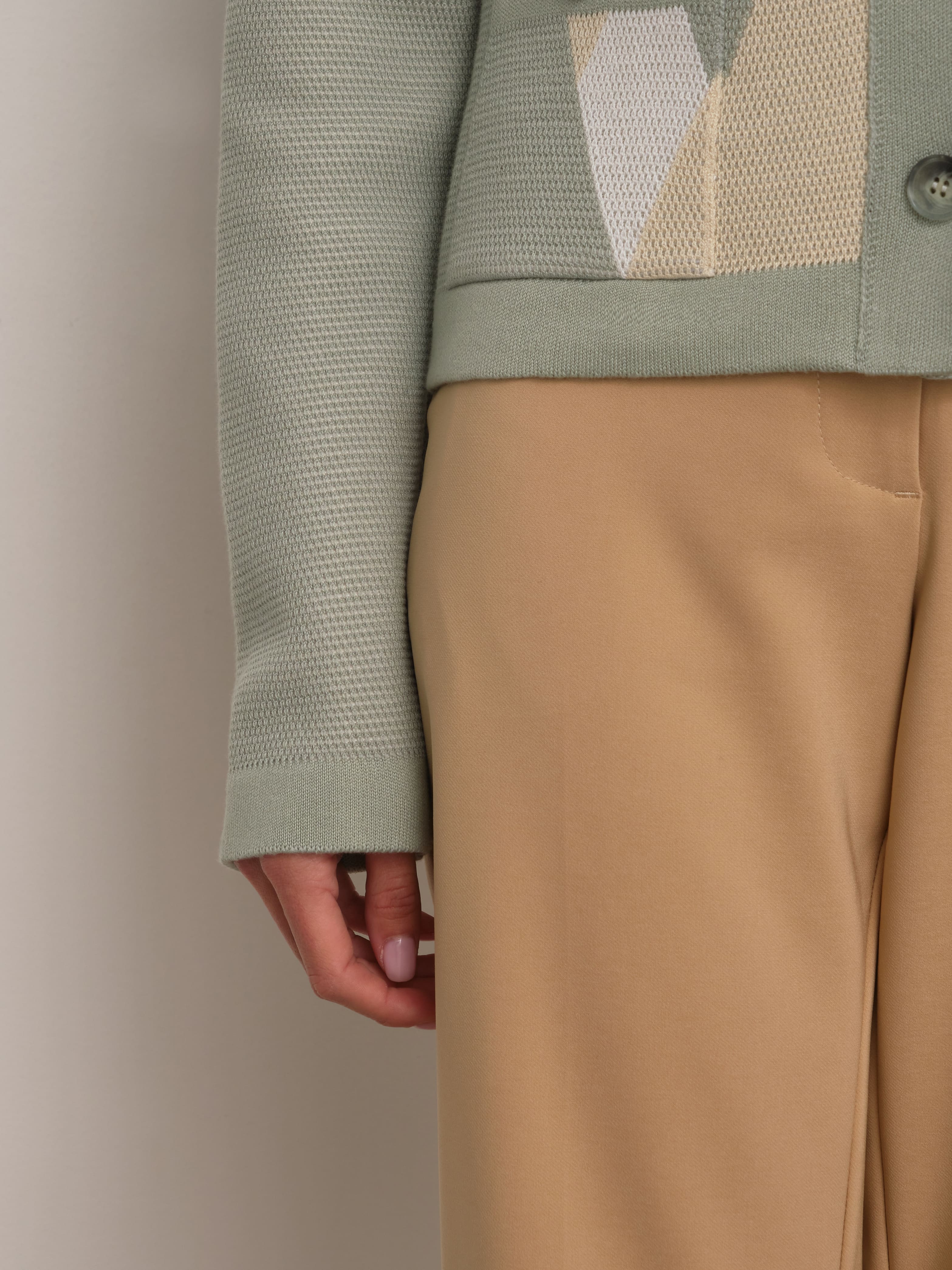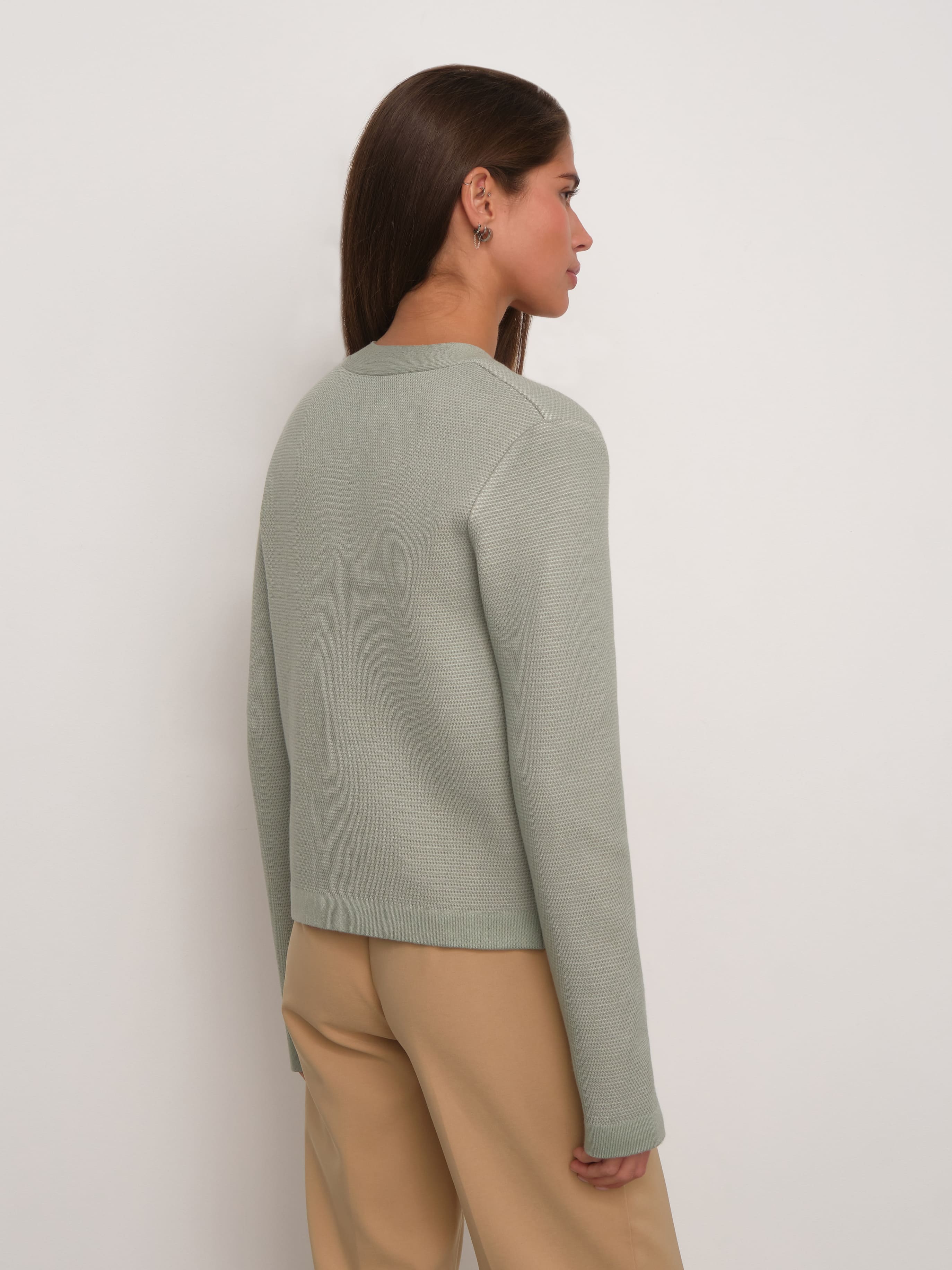 Весенний хлопковый жакет с геометрическим принтом, которого так не хватало вашим офисным капсулам. Мы создали его из премиальной пряжи с включением вискозы и слегка поиграли с техникой вязания. Присмотритесь к петелькам. Они располагаются послойно, что дает эффект объемной текстуры и формирует двойной оттенок трикотажного полотна. Модель доступна в нежных пастельных и строгих базовых расцветках.
