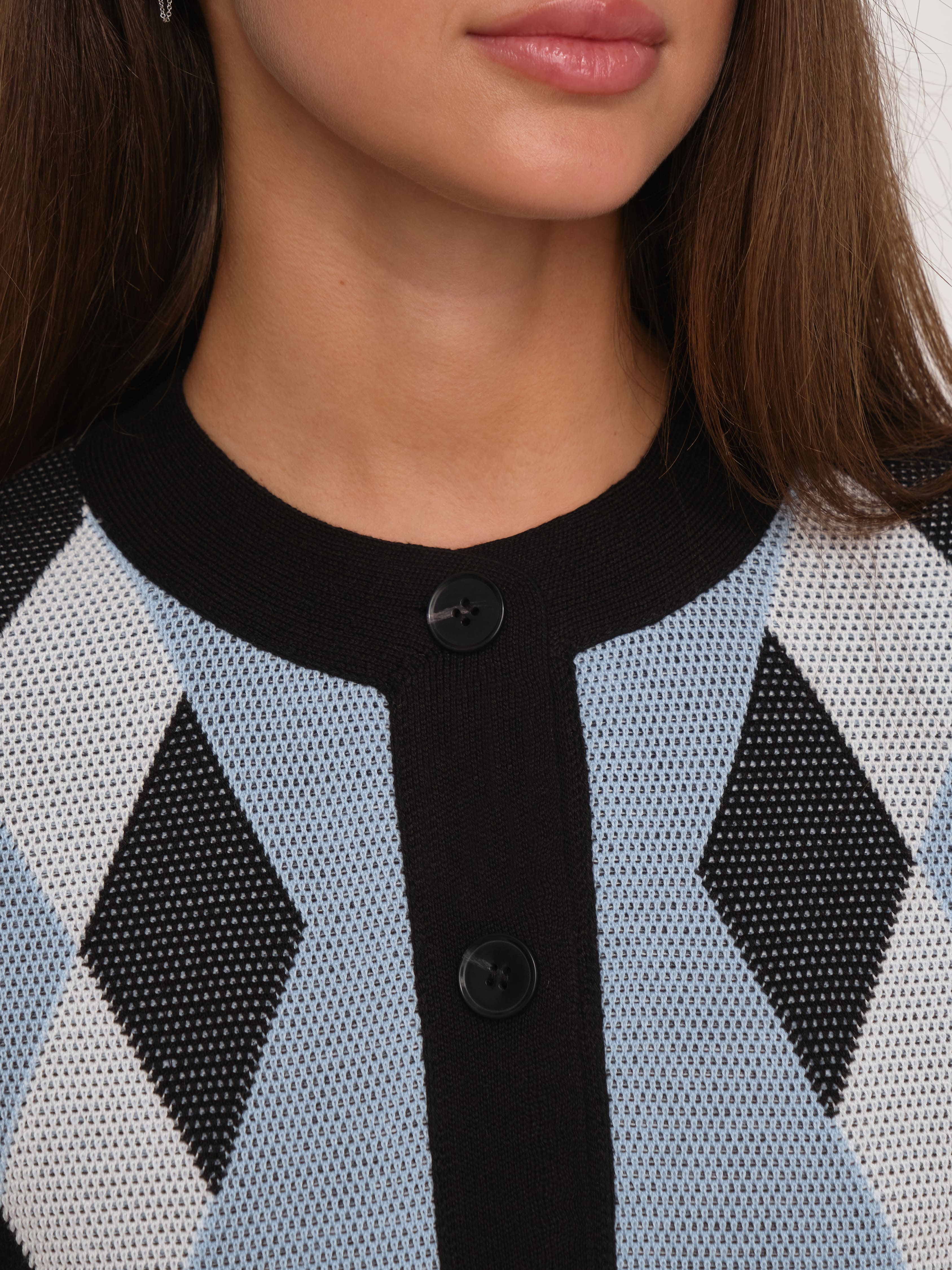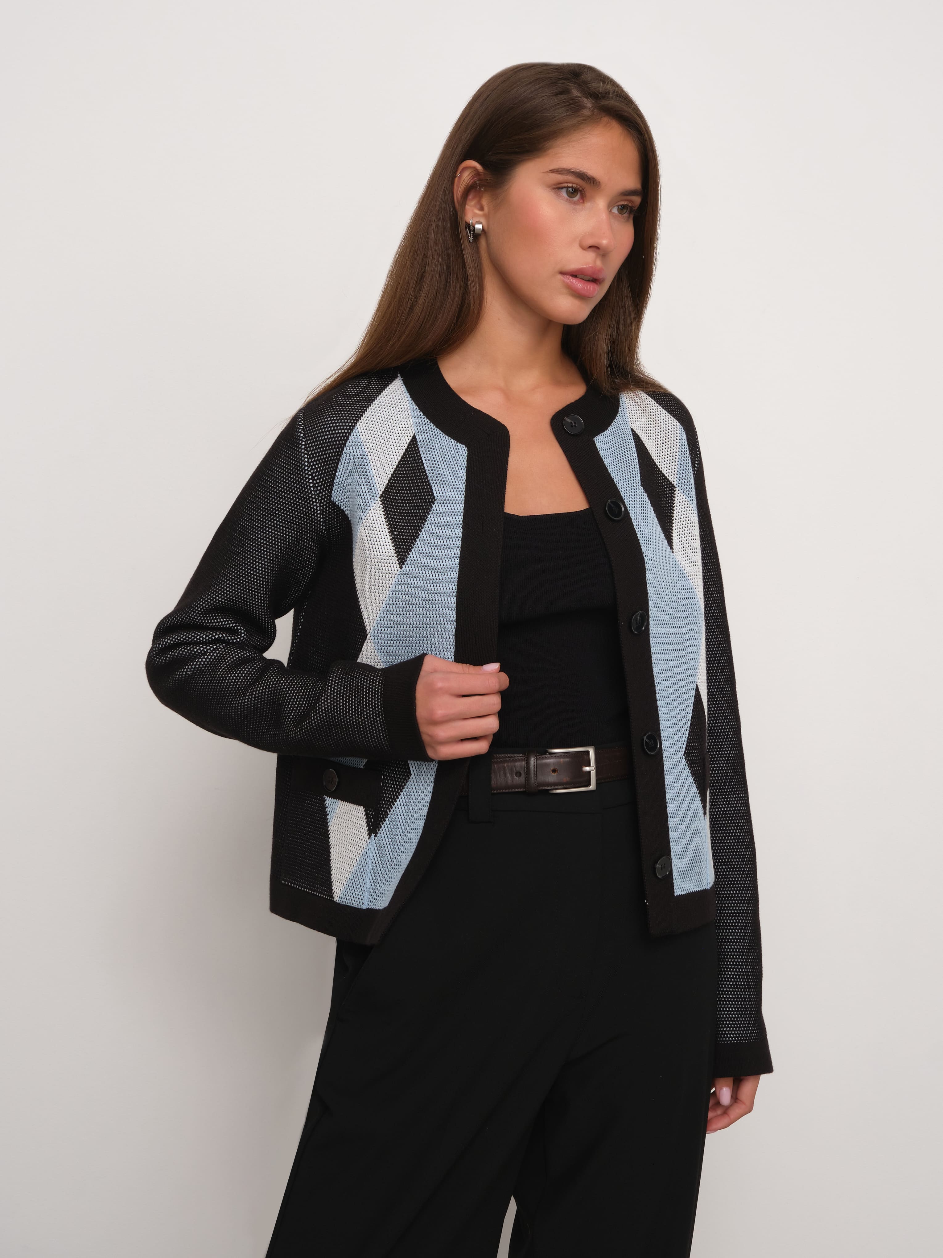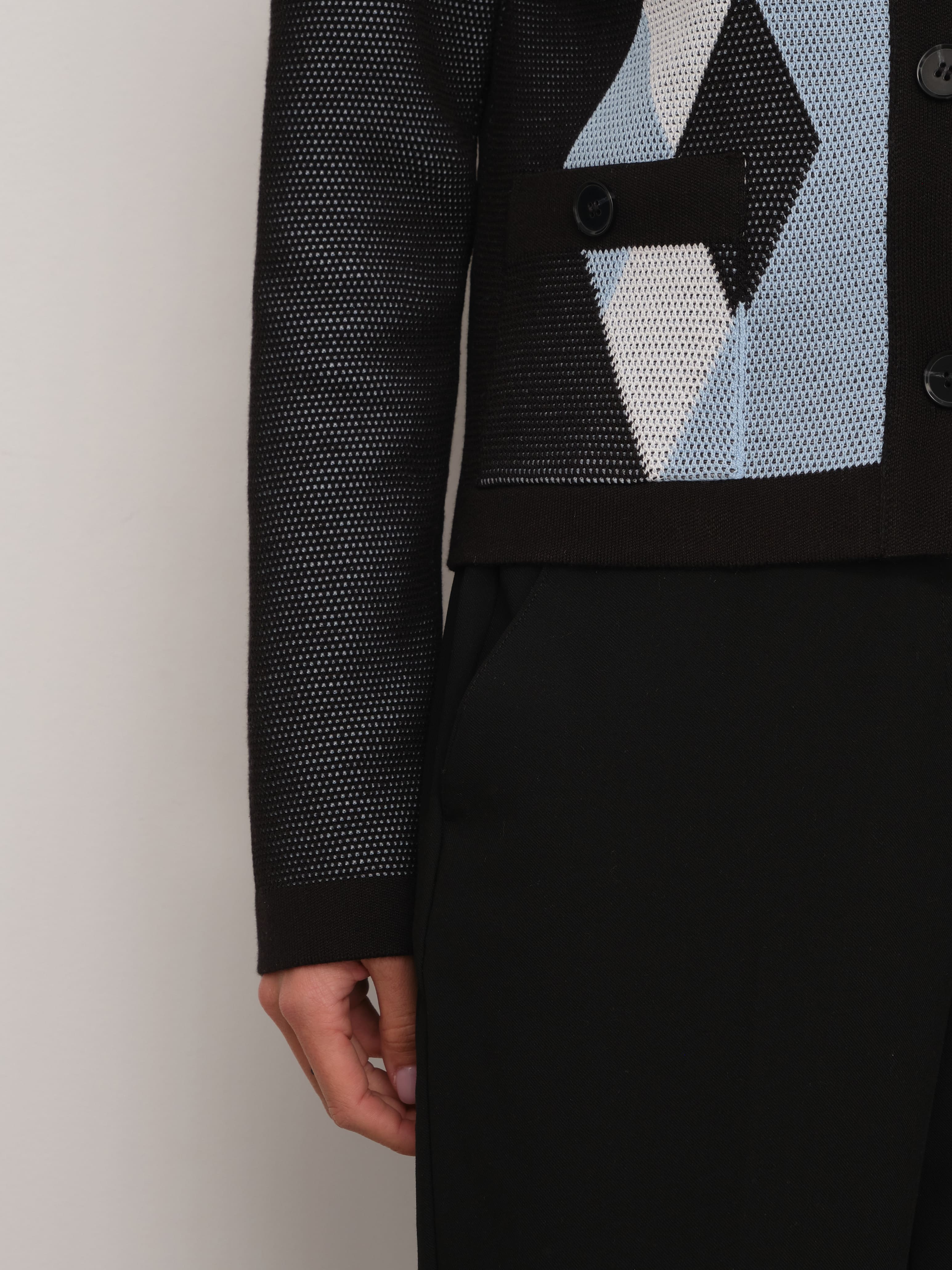 Весенний хлопковый жакет с геометрическим принтом, которого так не хватало вашим офисным капсулам. Мы создали его из премиальной пряжи с включением вискозы и слегка поиграли с техникой вязания. Присмотритесь к петелькам. Они располагаются послойно, что дает эффект объемной текстуры и формирует двойной оттенок трикотажного полотна. Модель доступна в нежных пастельных и строгих базовых расцветках.