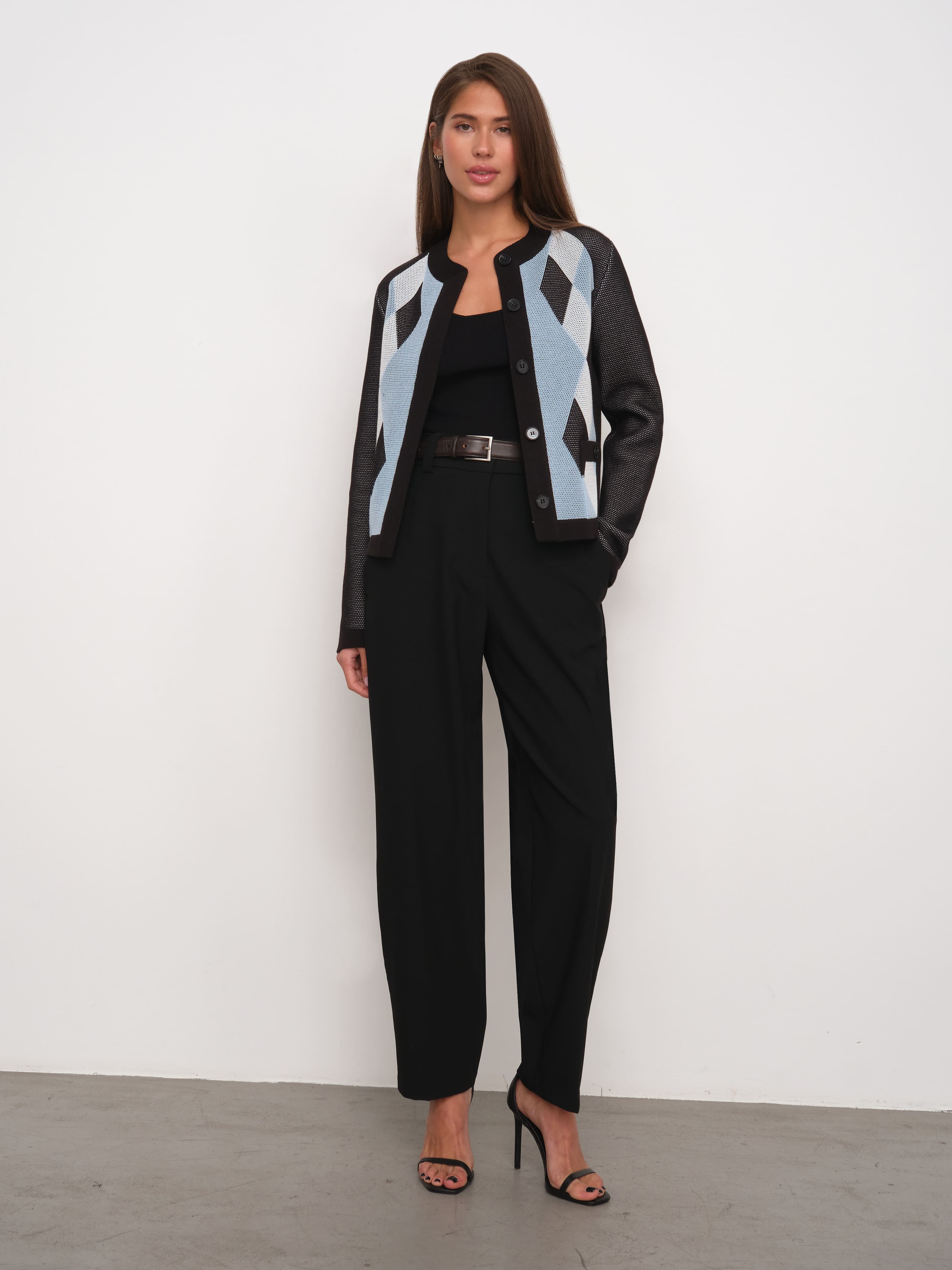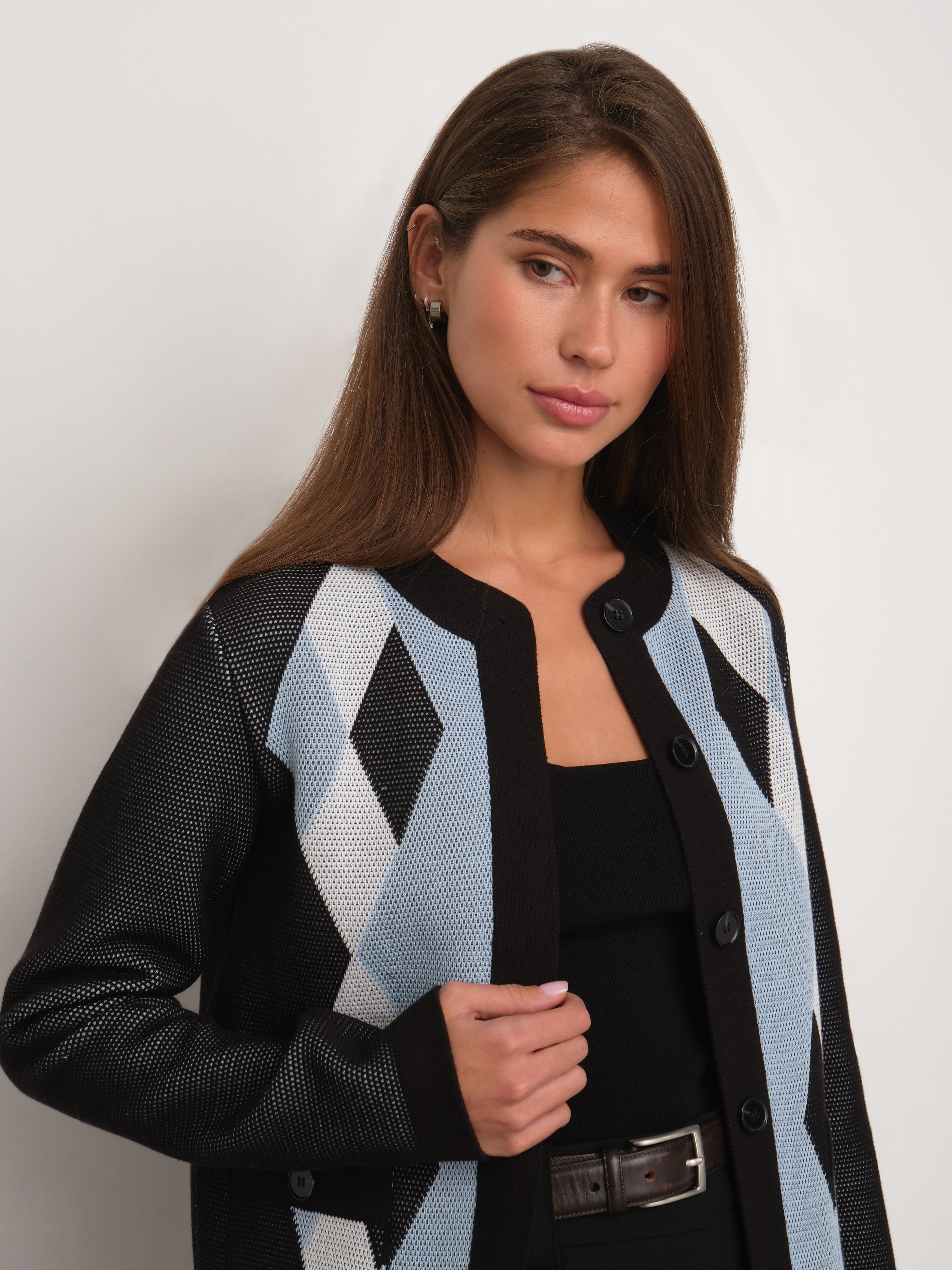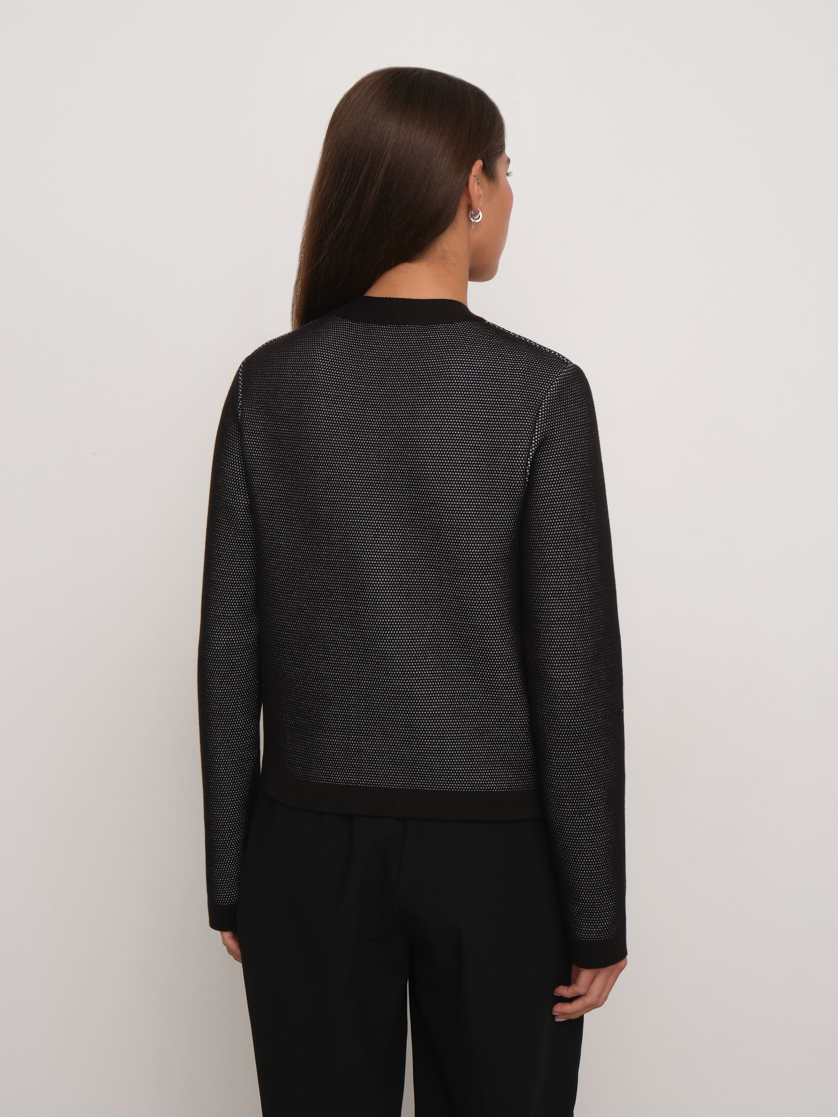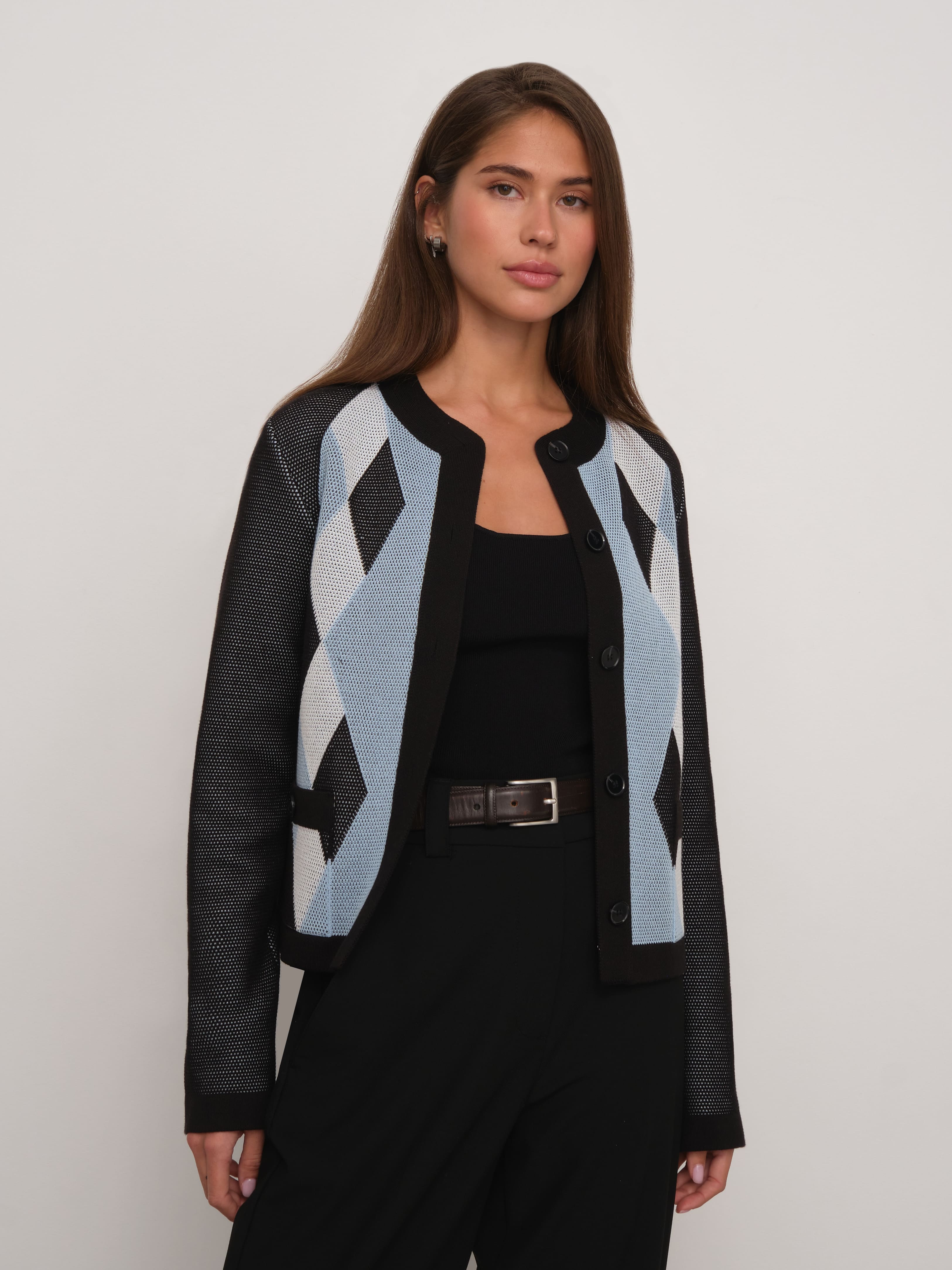 Весенний хлопковый жакет с геометрическим принтом, которого так не хватало вашим офисным капсулам. Мы создали его из премиальной пряжи с включением вискозы и слегка поиграли с техникой вязания. Присмотритесь к петелькам. Они располагаются послойно, что дает эффект объемной текстуры и формирует двойной оттенок трикотажного полотна. Модель доступна в нежных пастельных и строгих базовых расцветках.