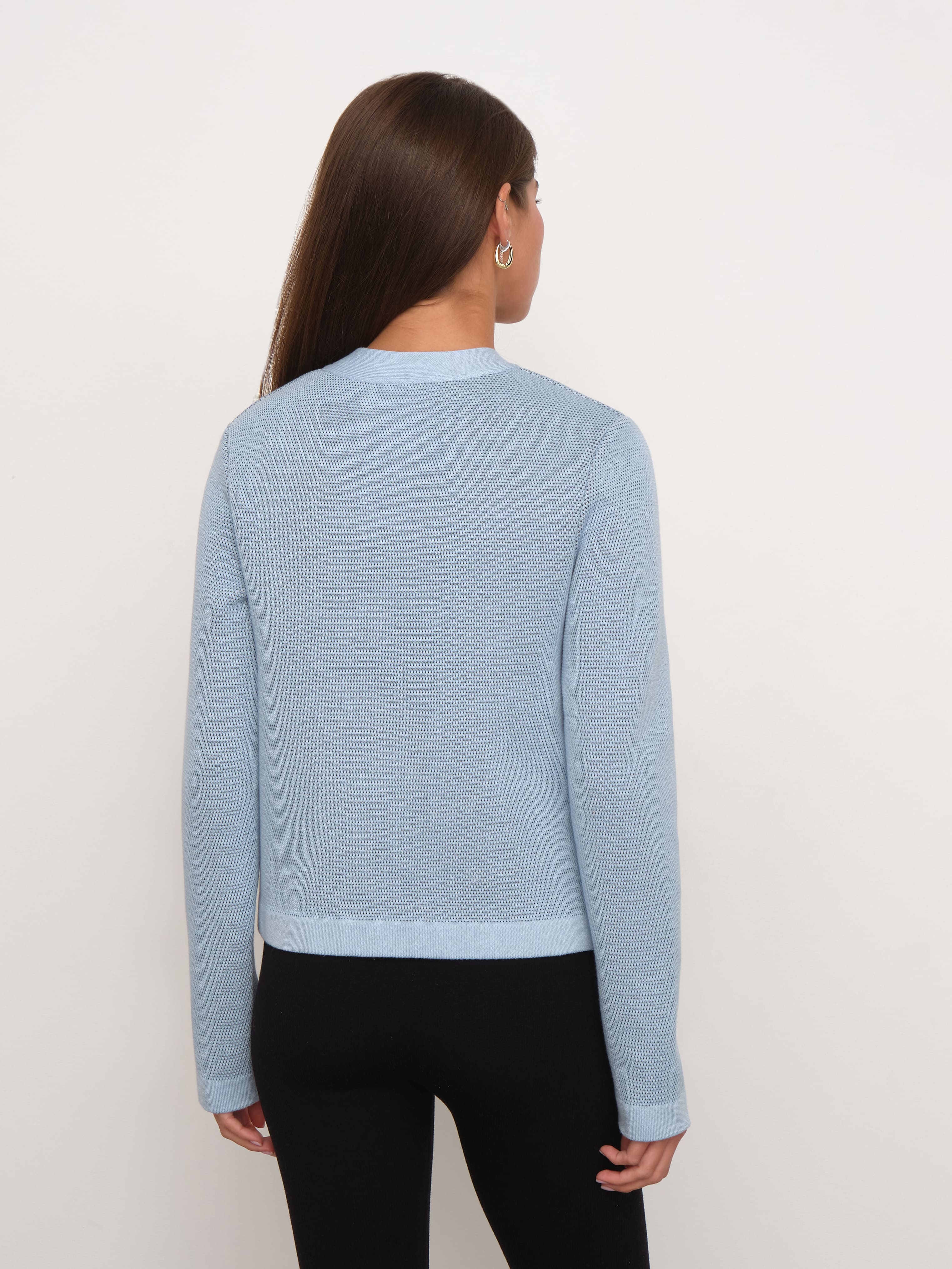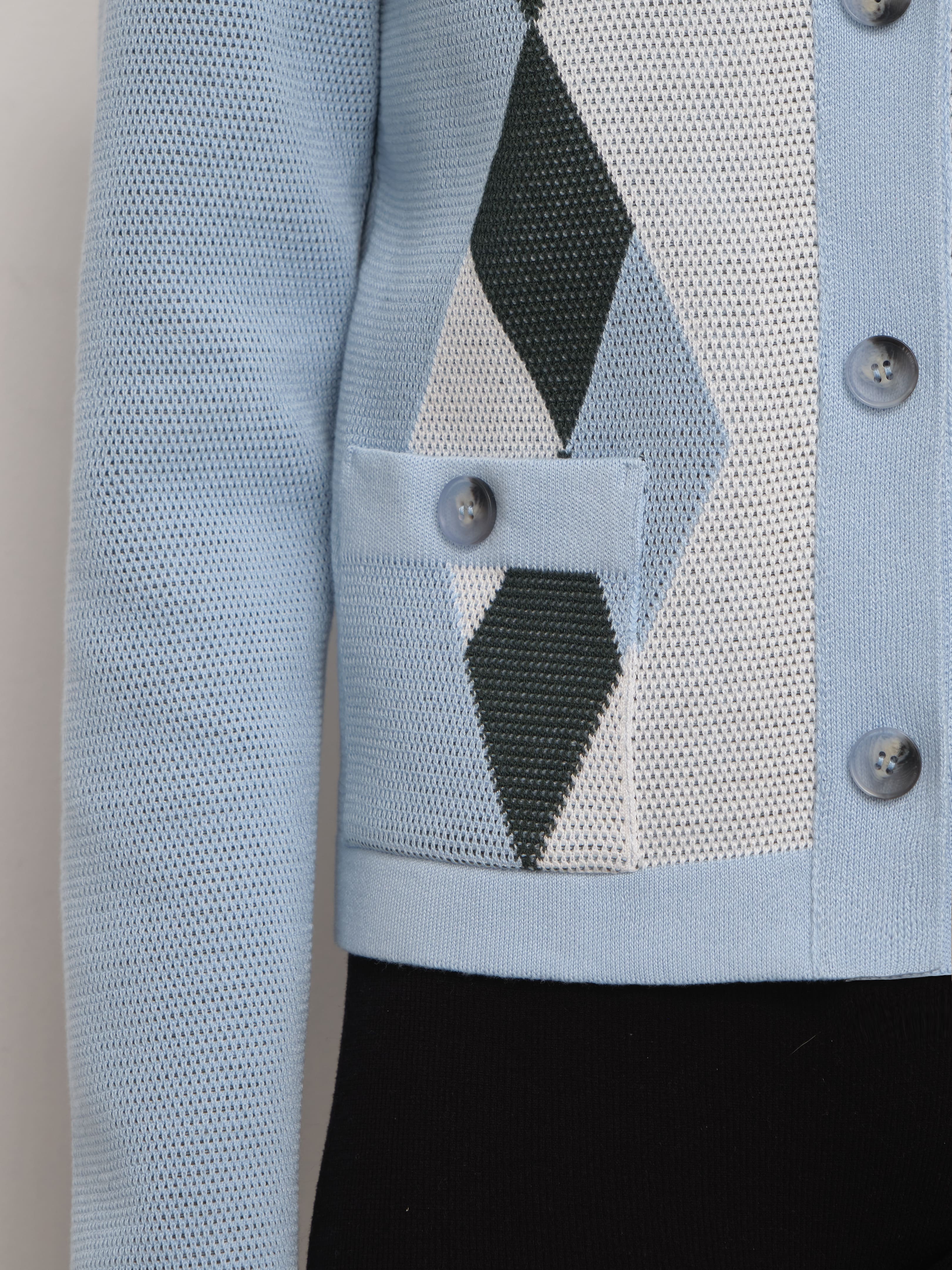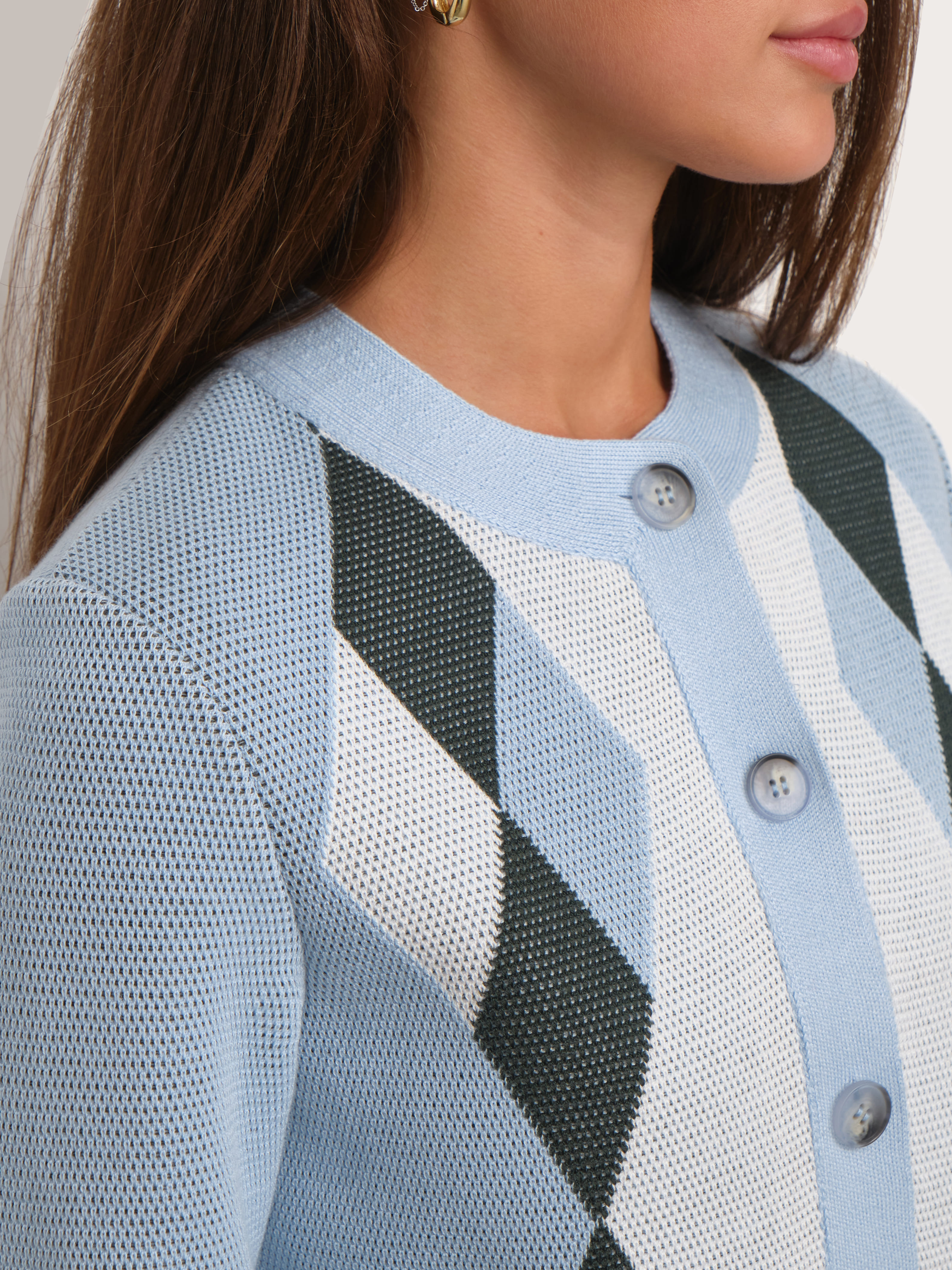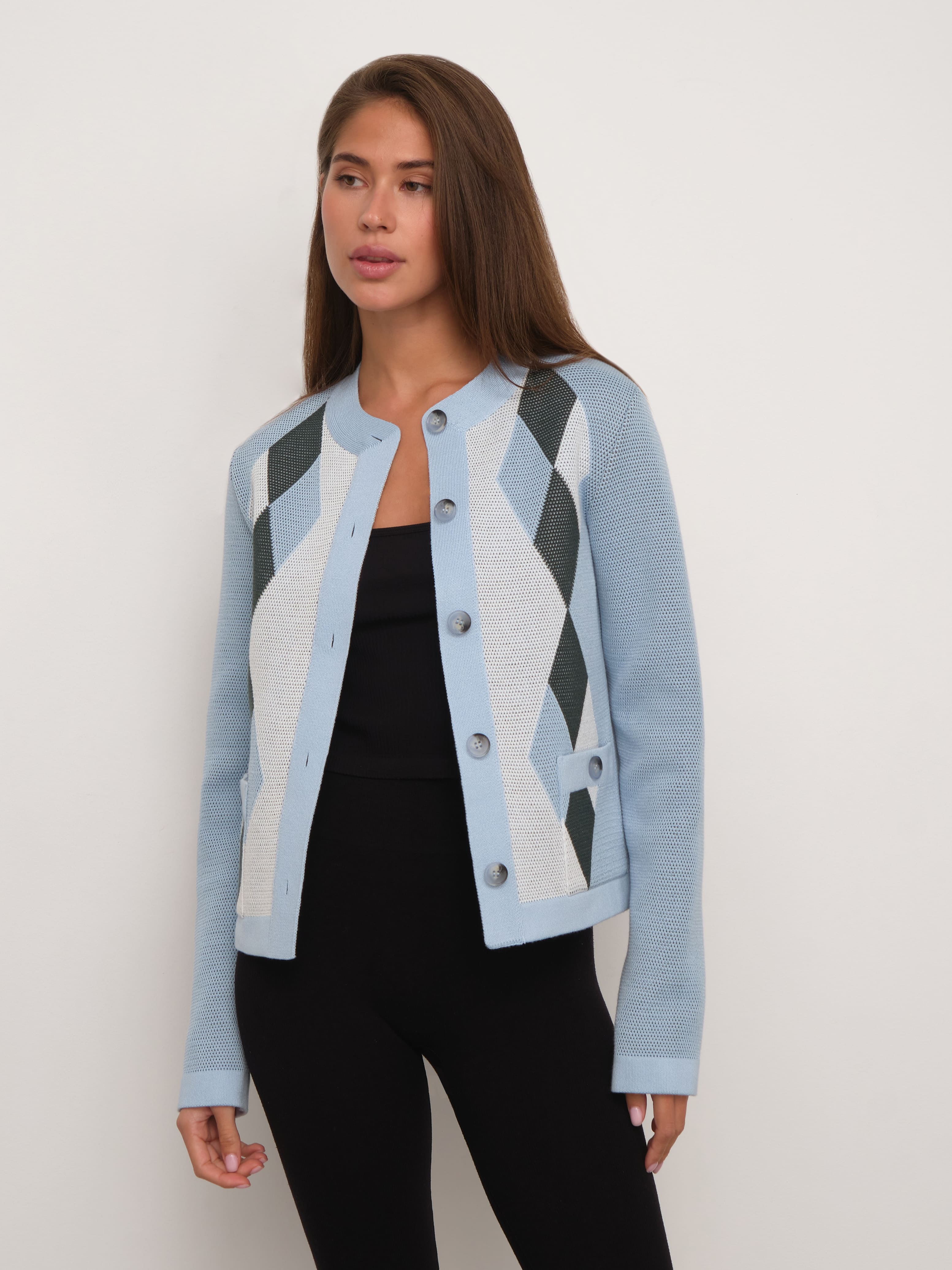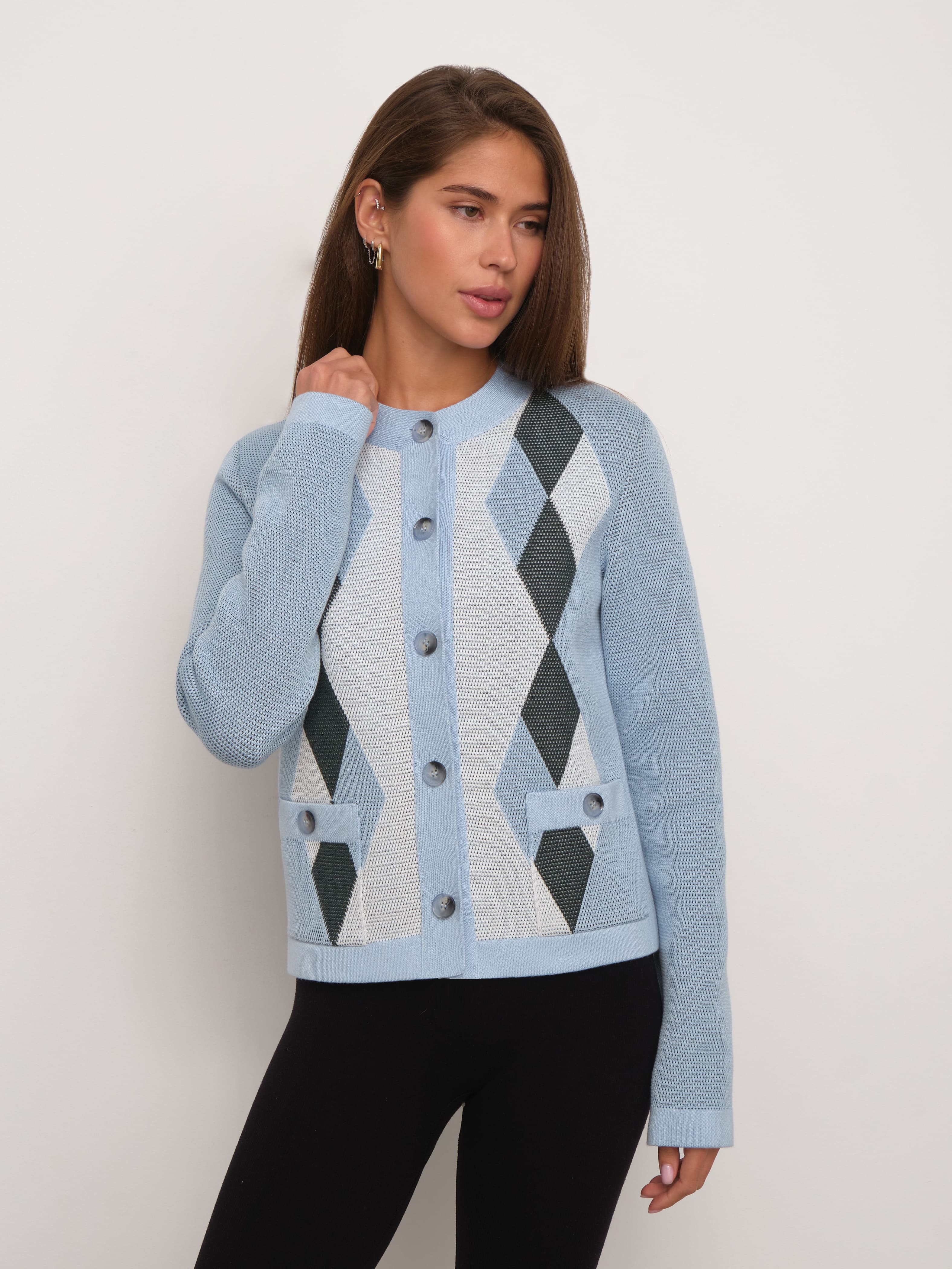 Весенний хлопковый жакет с геометрическим принтом, которого так не хватало вашим офисным капсулам. Мы создали его из премиальной пряжи с включением вискозы и слегка поиграли с техникой вязания. Присмотритесь к петелькам. Они располагаются послойно, что дает эффект объемной текстуры и формирует двойной оттенок трикотажного полотна. Модель доступна в нежных пастельных и строгих базовых расцветках.