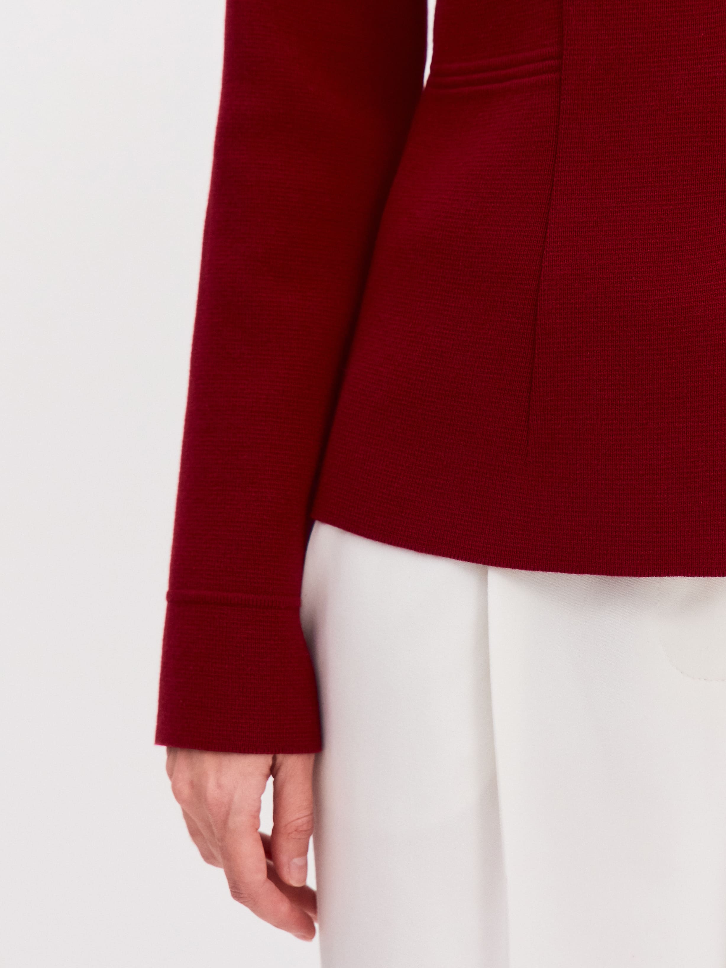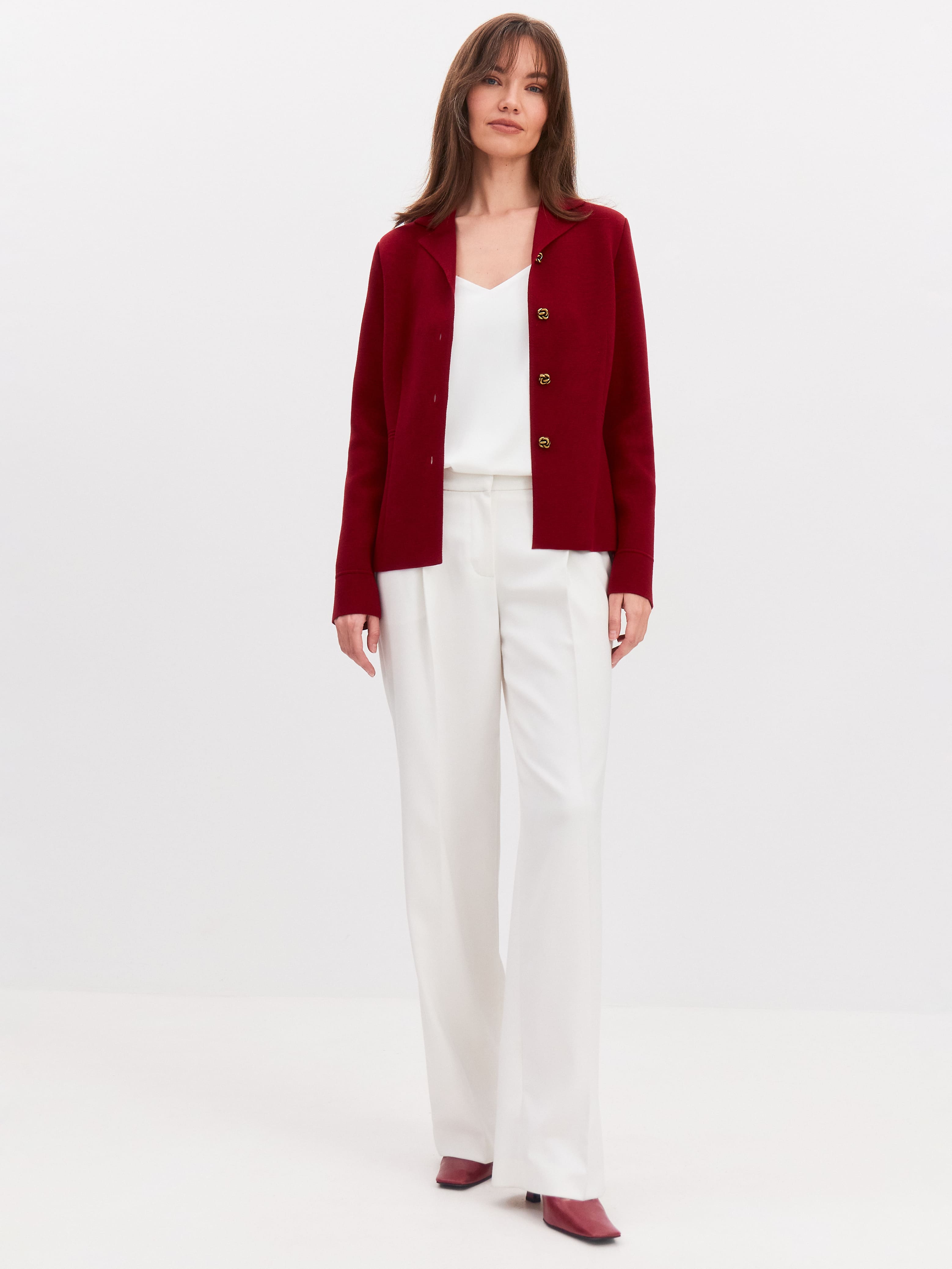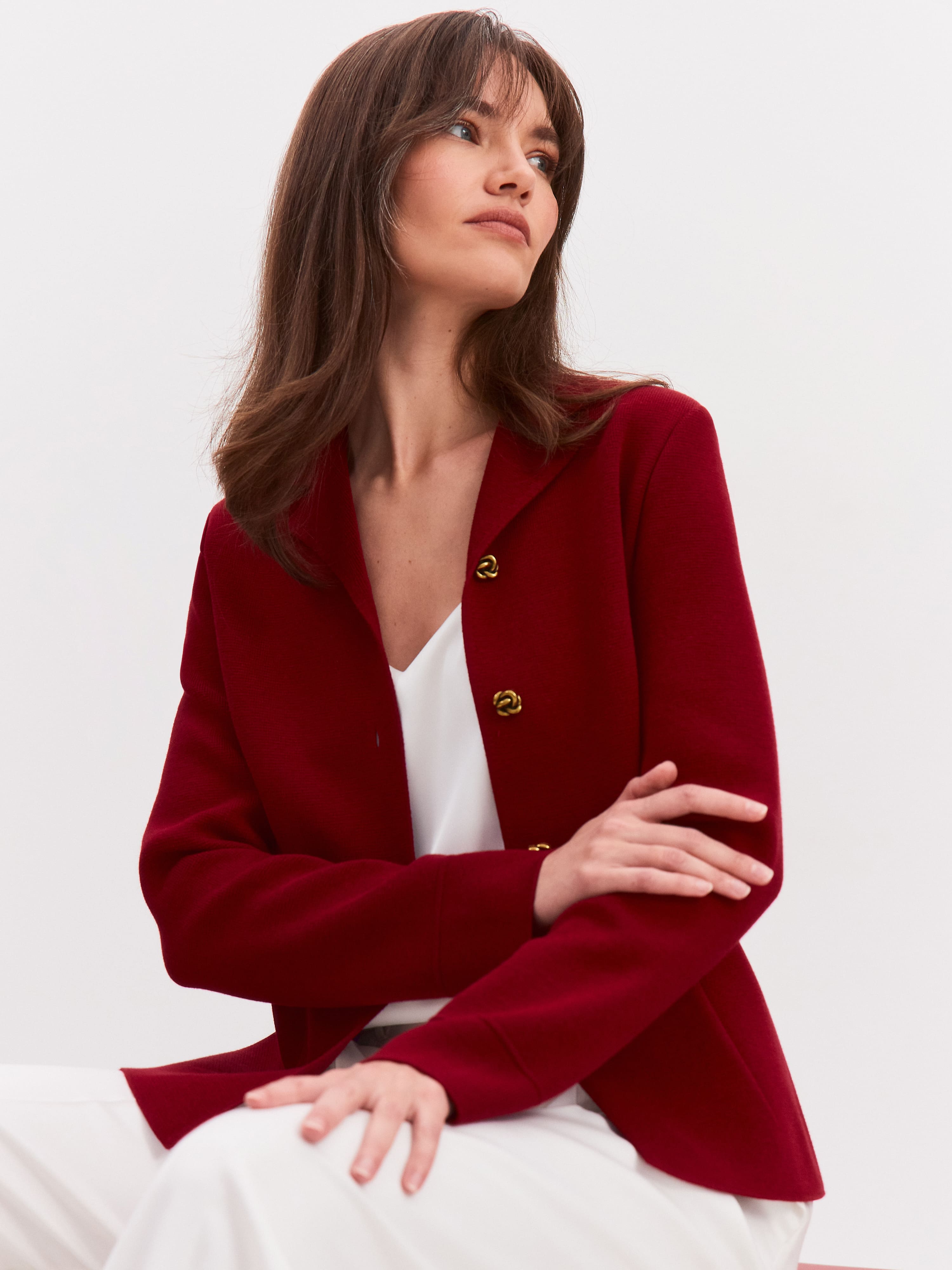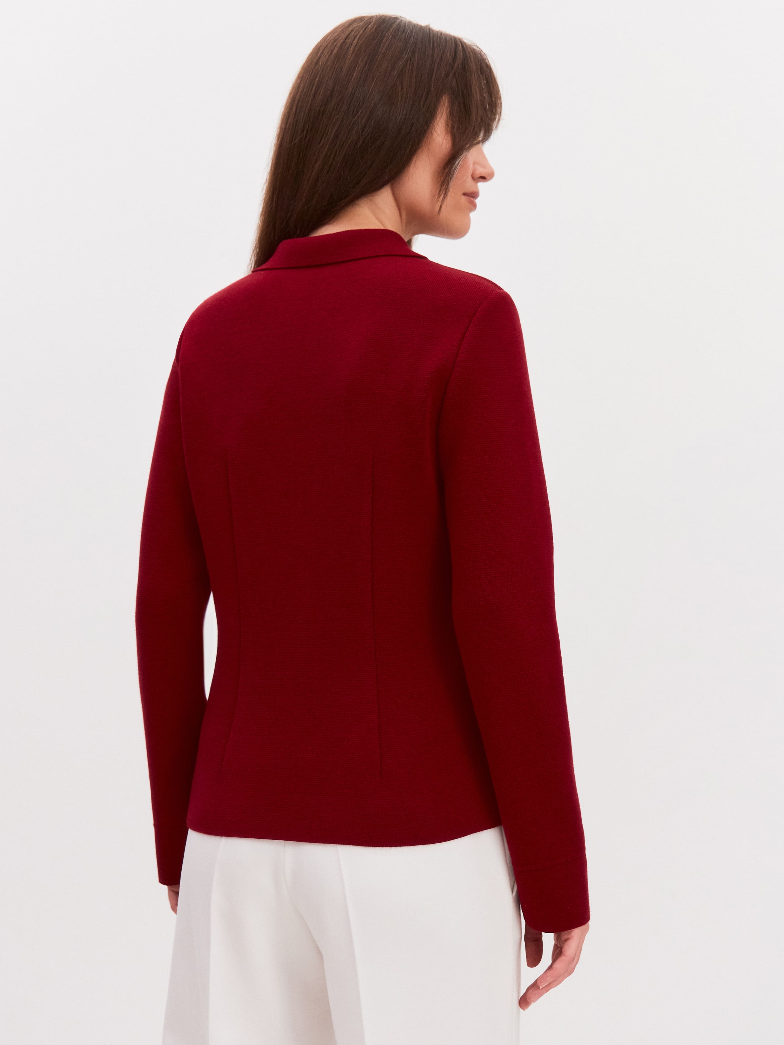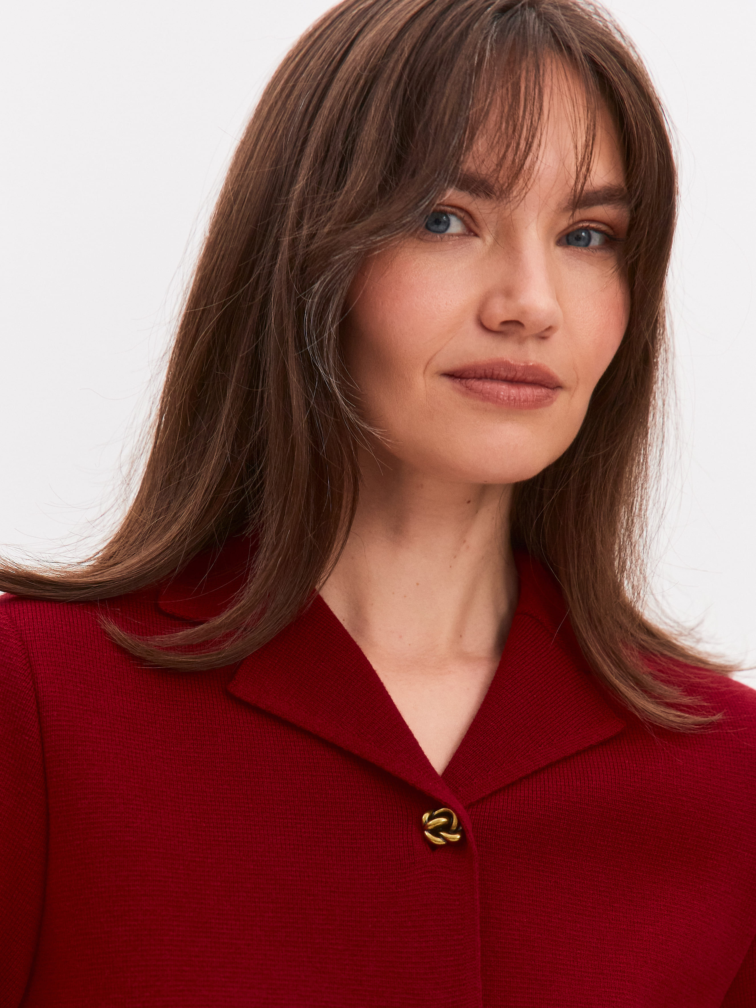 Удлиненный жакет с английским воротником, детализированный объемными пуговицами-узелками. Прилегающий крой с вертикальными вытачками выступает скульптором силуэта. Жакет моделирует плавный изгиб талии, сохраняя под собой место для легкого нижнего слоя. Графичные лацканы воротника и рельефная отделка придают образу легкую торжественность. Модель изготовлена из вязаного трикотажа высокой плотности. Эта особенность позволяет жакету сохранять безупречный силуэт и устойчивость к пиллингу (катышкам).
