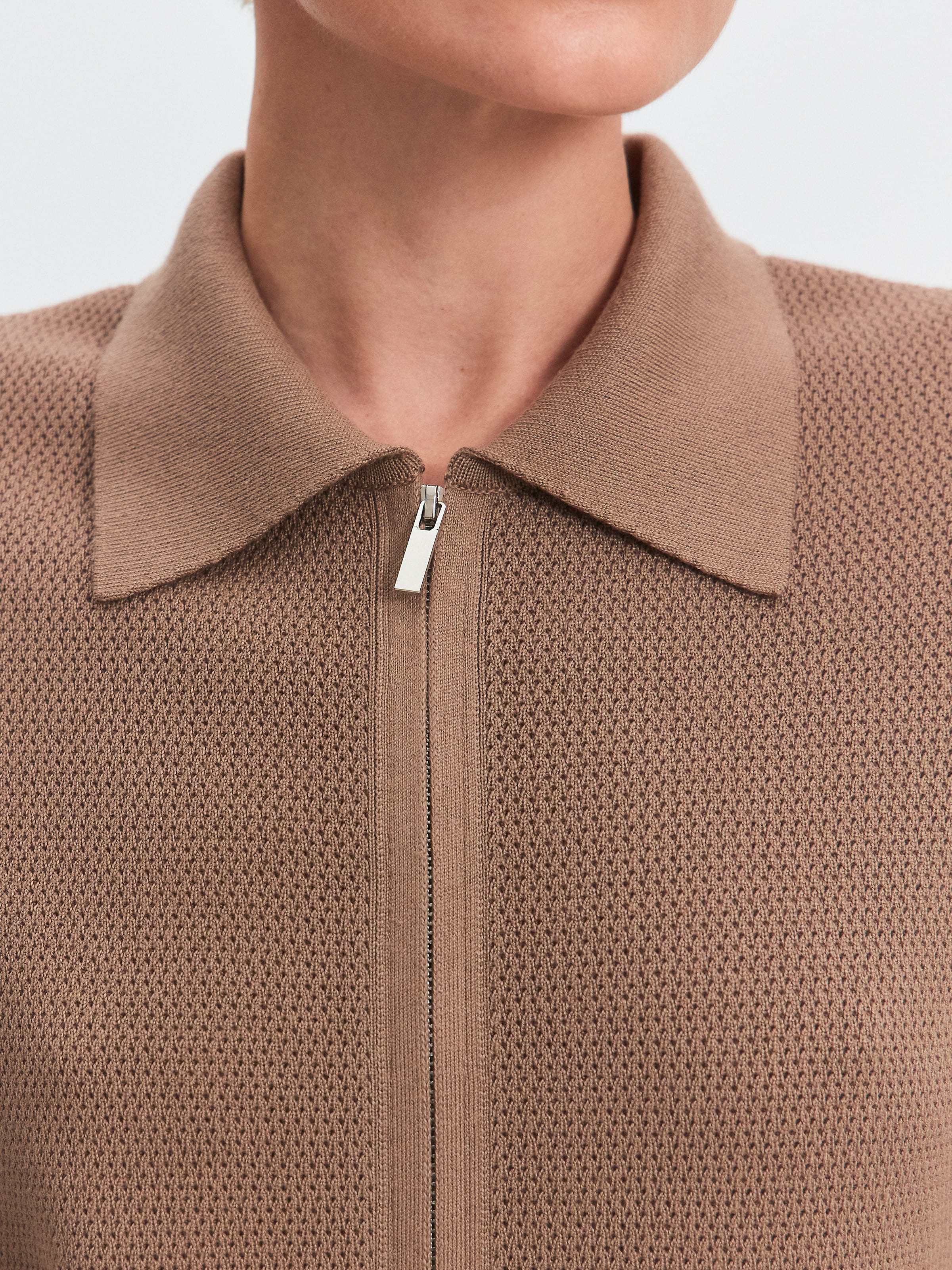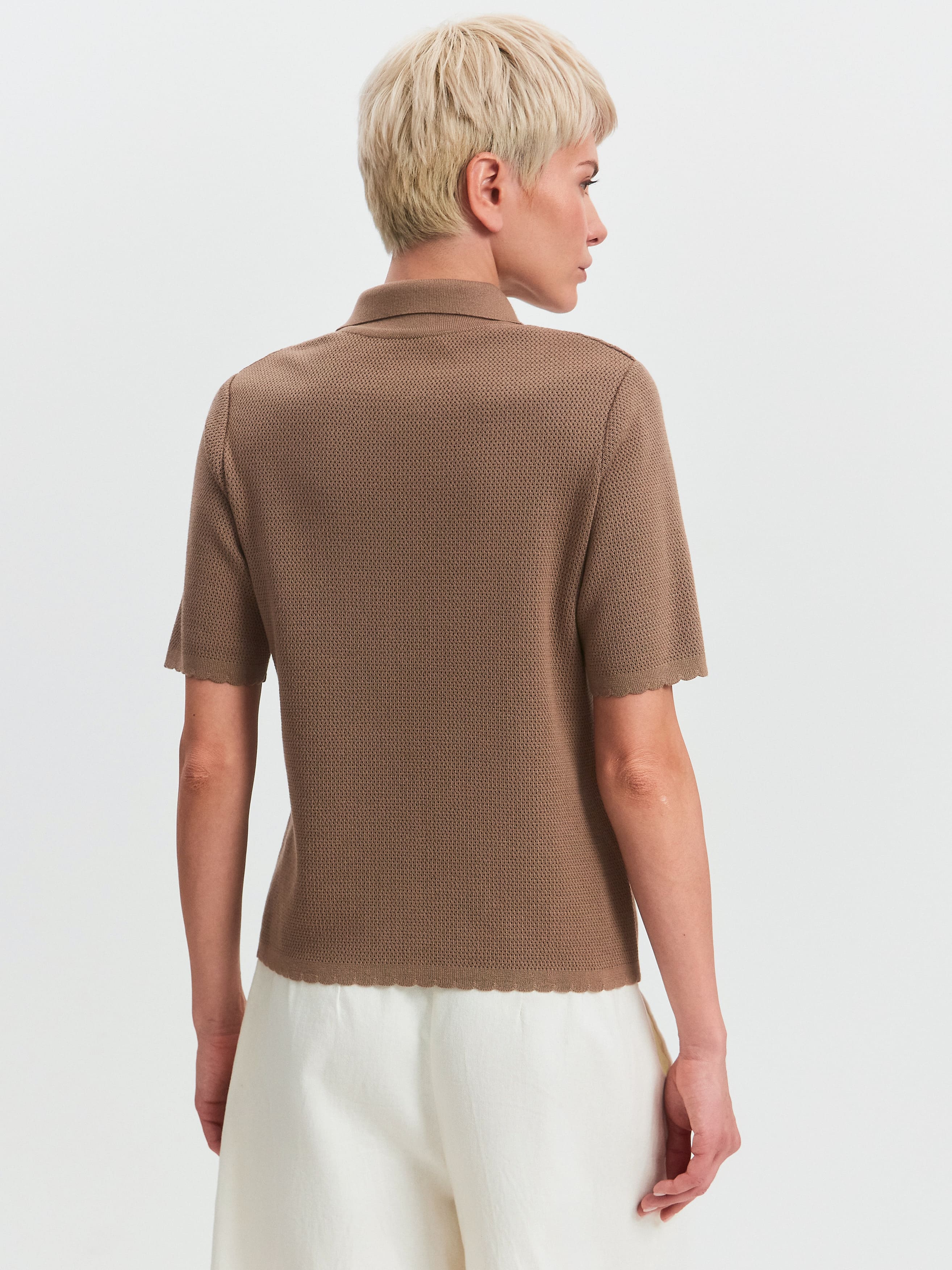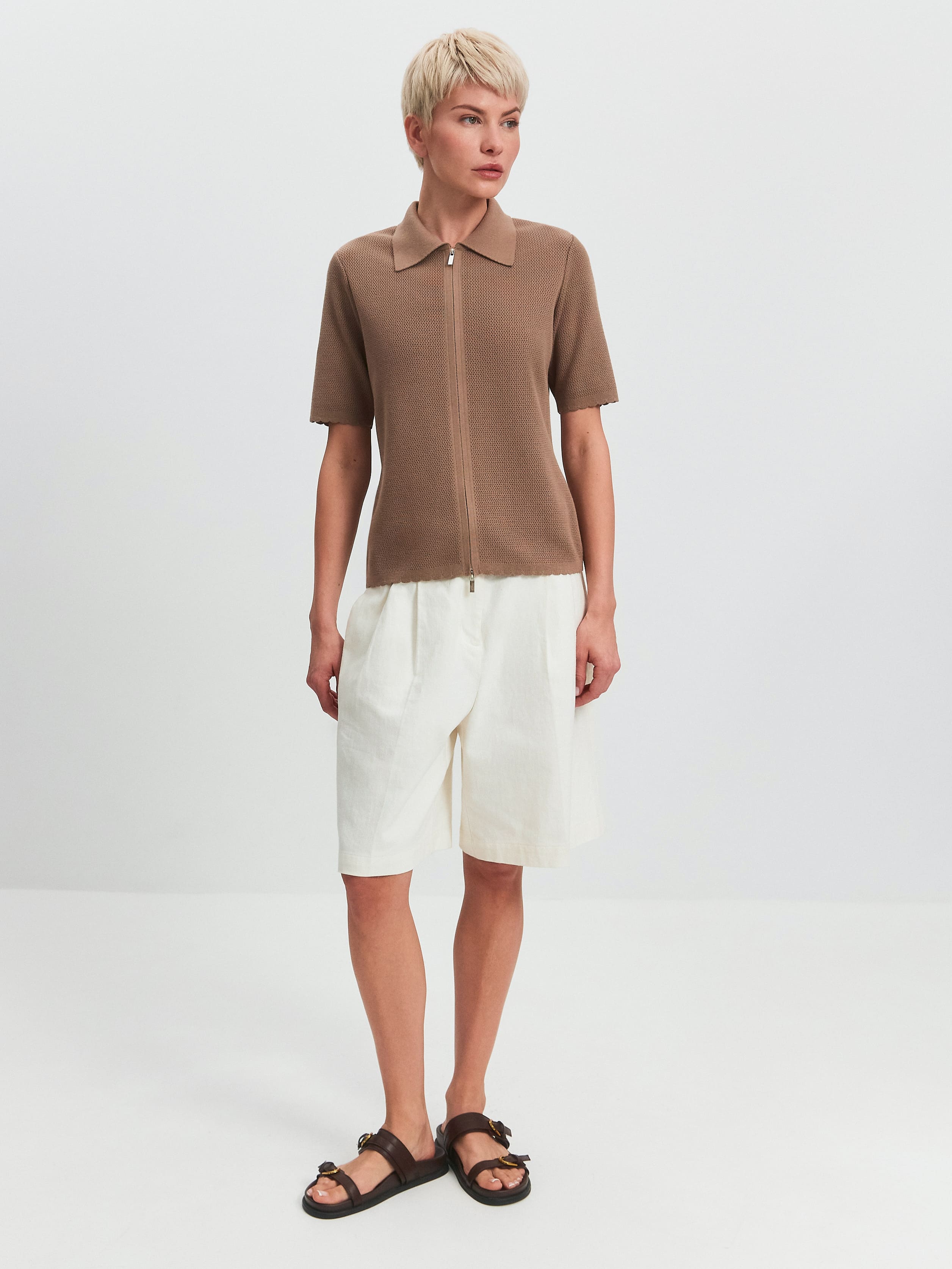 Модель летнего жакета с коротким рукавом и воротником в рубашечном стиле. Выполнена из ажурной хлопко-вискозы. Жакет на металлической молнии с двумя замками, которые расстегиваются в разных направлениях. Рукава, спинка и полочки декорированы кокетливым волнистым краем. За счет пористой структуры трикотаж не блокирует движение воздуха в волокнах и дольше сохраняет ощущение нежного холодка на коже. Оптимальная модель верха для отпускных и летних городских капсул, требующих предельно легких, дышащих вещей.