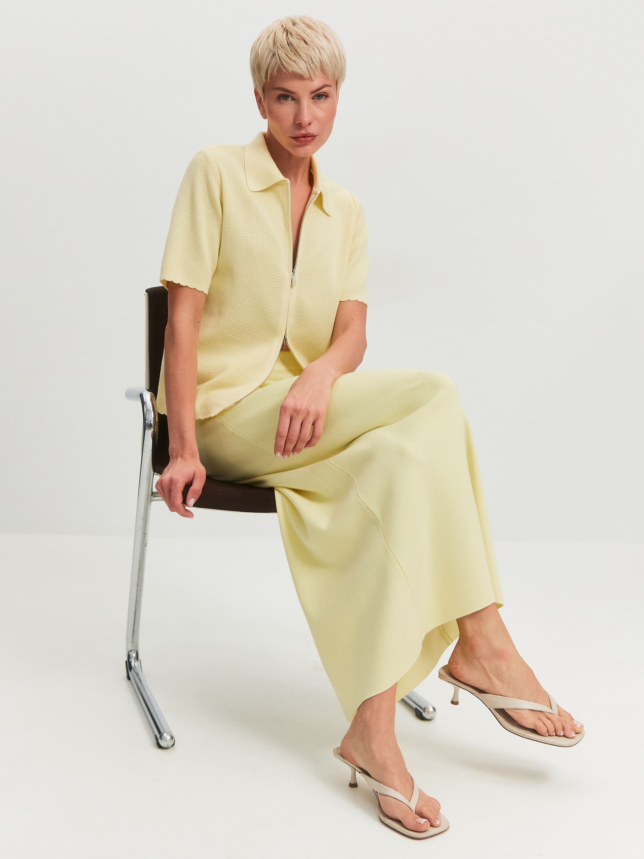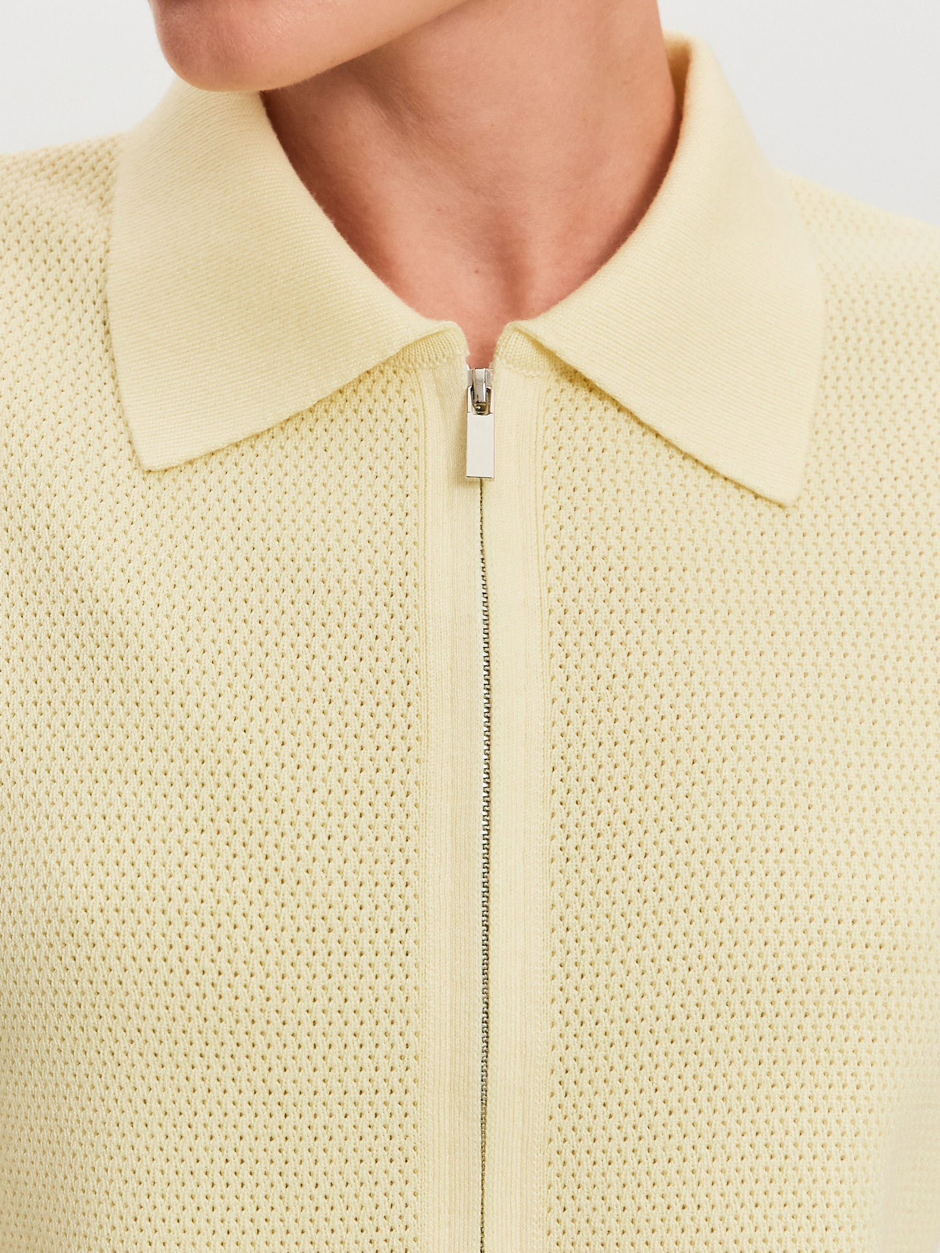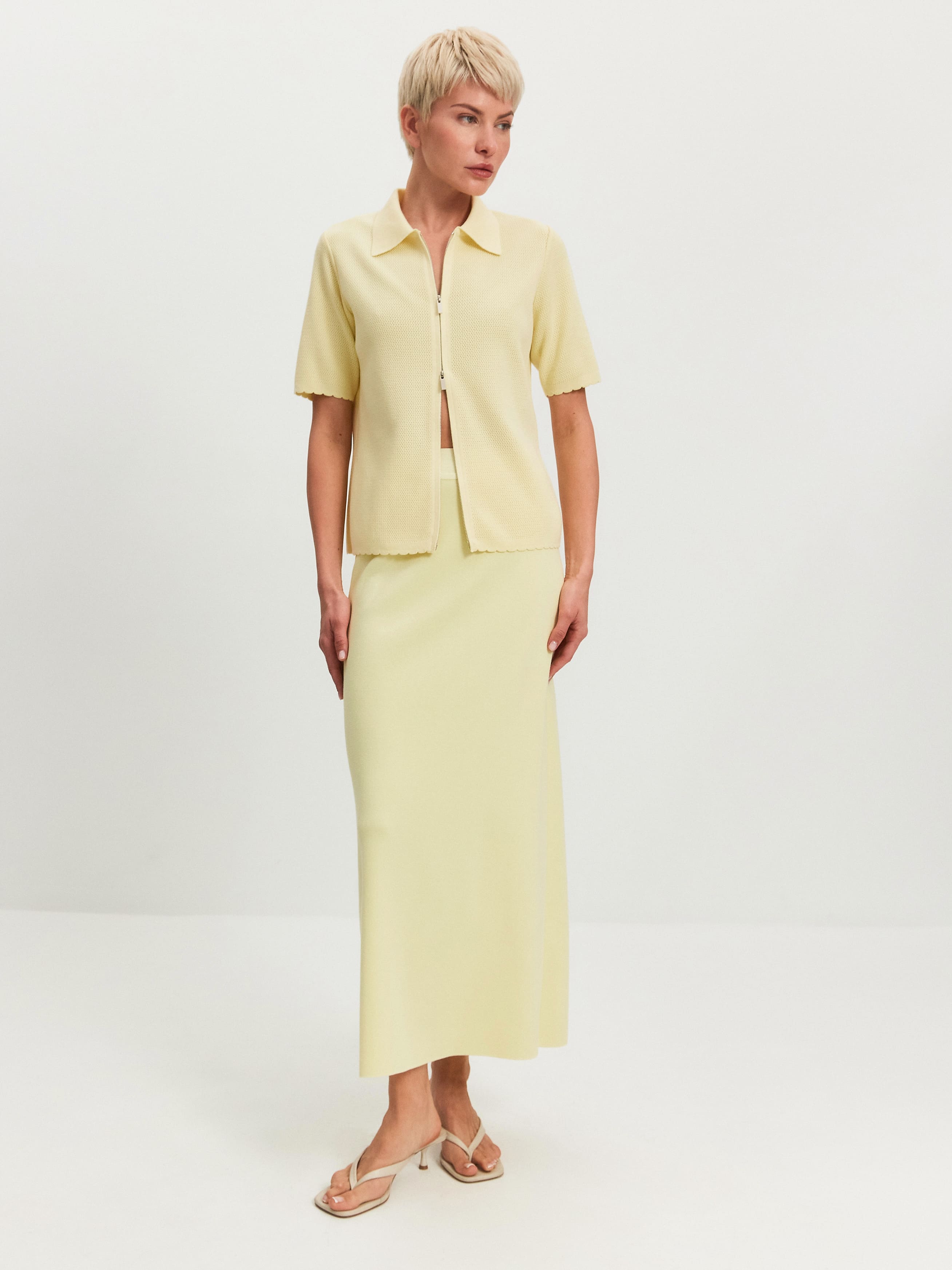 Модель летнего жакета с коротким рукавом и воротником в рубашечном стиле. Выполнена из ажурной хлопко-вискозы. Жакет на металлической молнии с двумя замками, которые расстегиваются в разных направлениях. Рукава, спинка и полочки декорированы кокетливым волнистым краем. За счет пористой структуры трикотаж не блокирует движение воздуха в волокнах и дольше сохраняет ощущение нежного холодка на коже. Оптимальная модель верха для отпускных и летних городских капсул, требующих предельно легких, дышащих вещей.