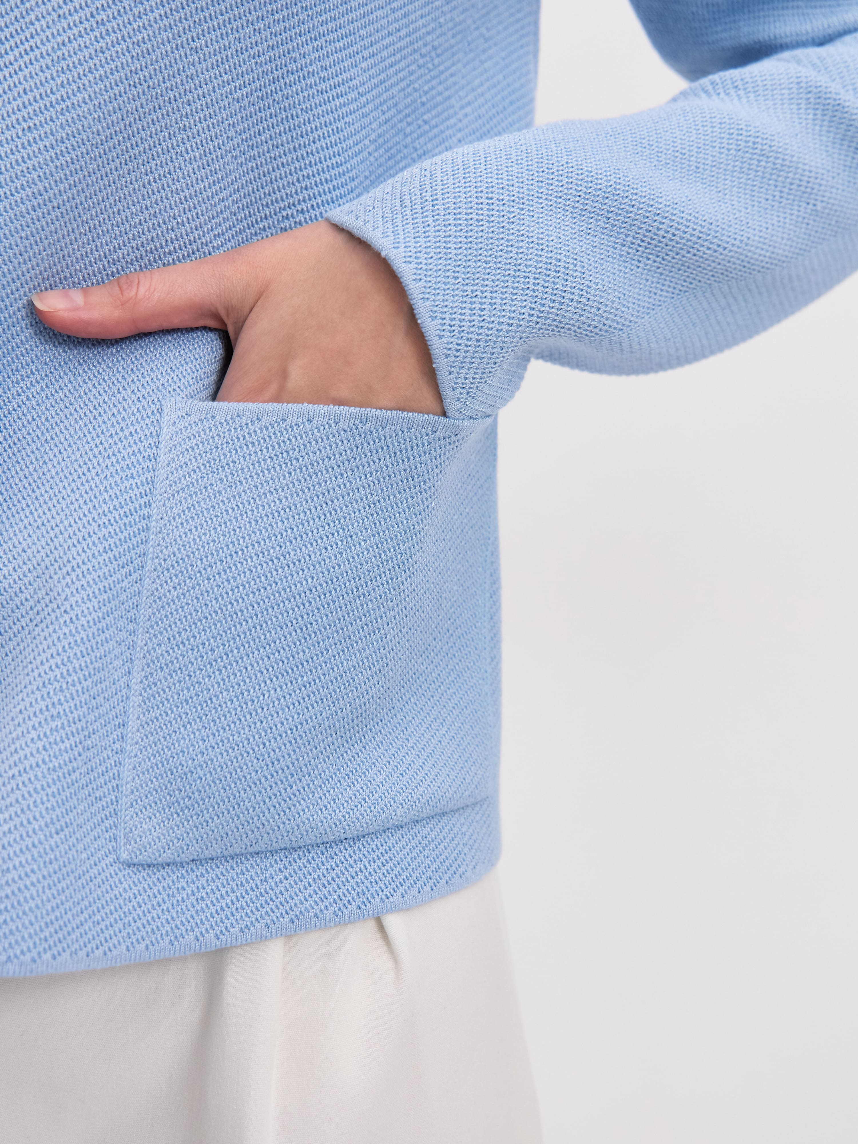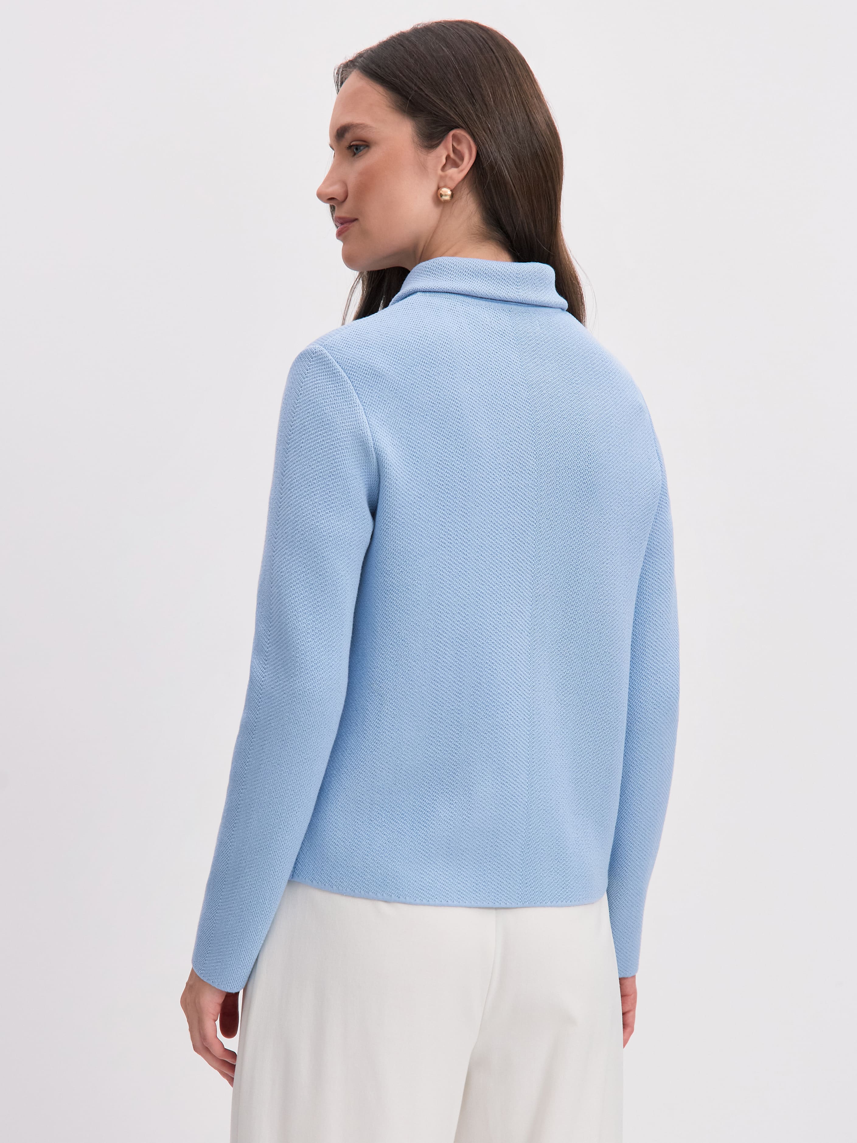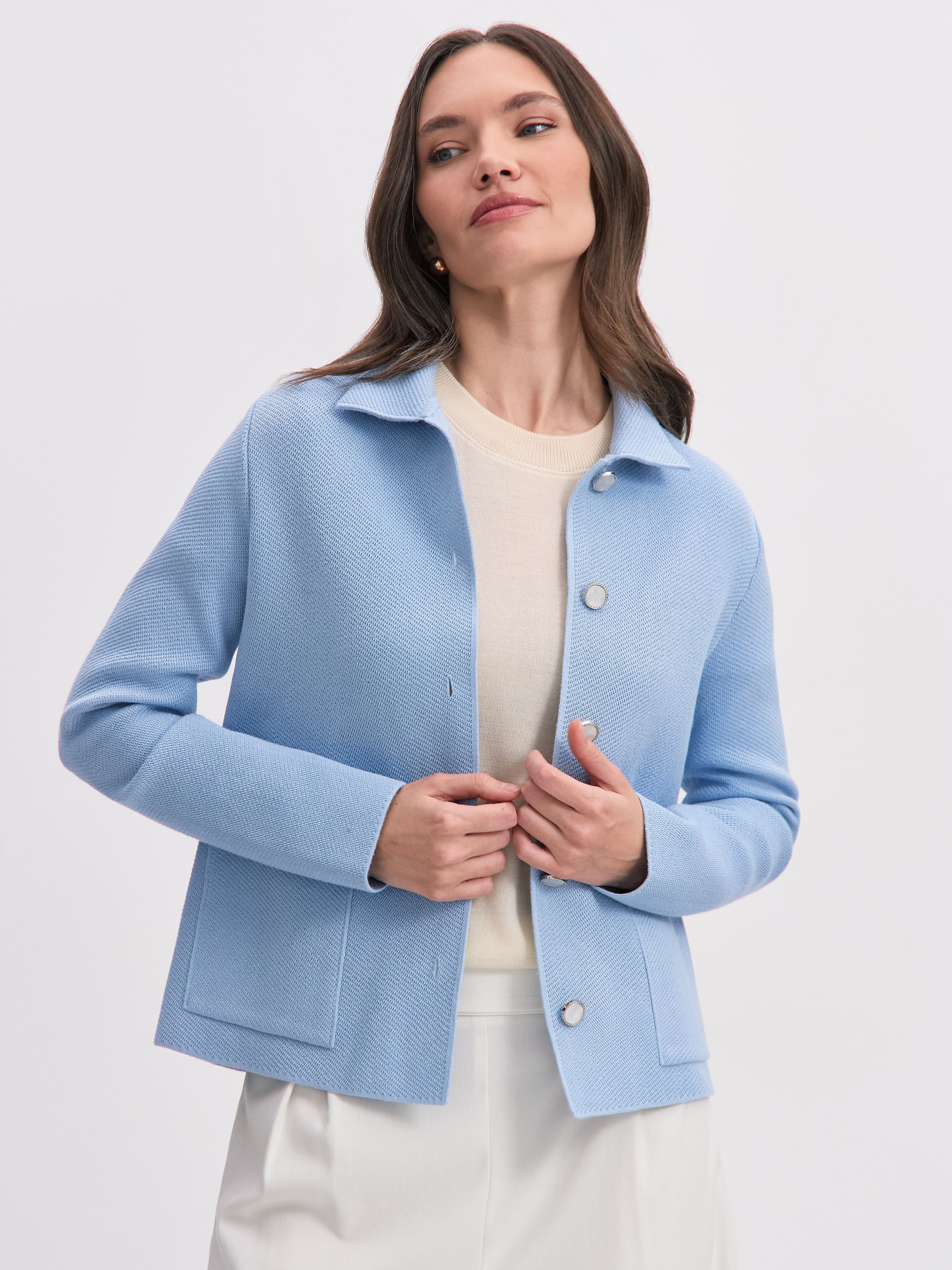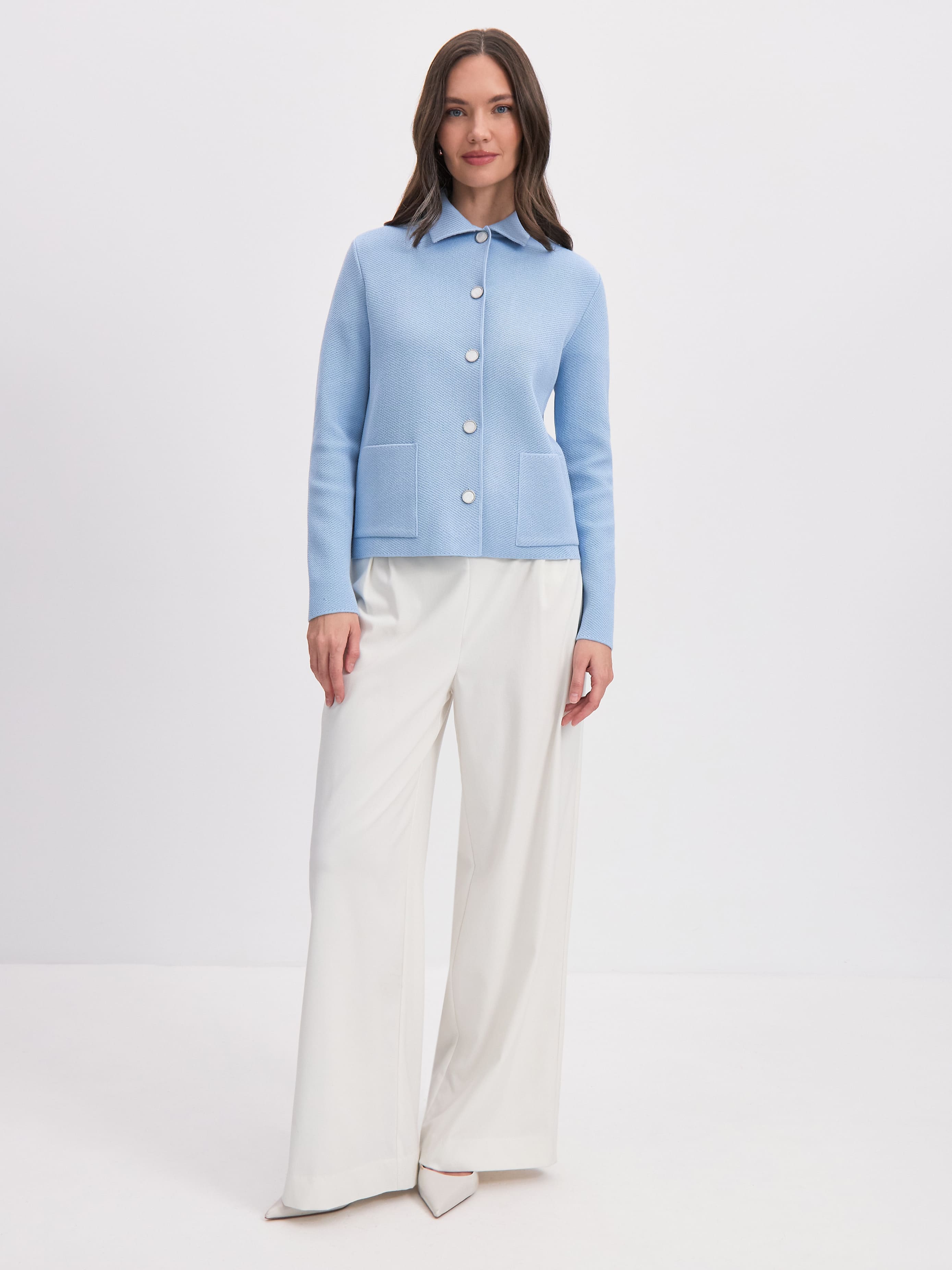 Тот самый жакет из рельефно-фактурного хлопка, который с легкостью пройдет офисный дресс-код. Полотно изделия обладает хорошей формоустойчивостью и приятной тяжестью – отличительной чертой натурального трикотажа. Жакет с полуприлеганием, классической длины. Отделан воротничком, акцентными карманами и рядом роговых пуговиц. Важно! Модель не дублируется подкладом, что делает ее удобной альтернативой строгому пиджаку. Рекомендуемые варианты сочетаний: с мягкими брюками Палаццо; с хлопковыми юбками Моне и Кейт.
