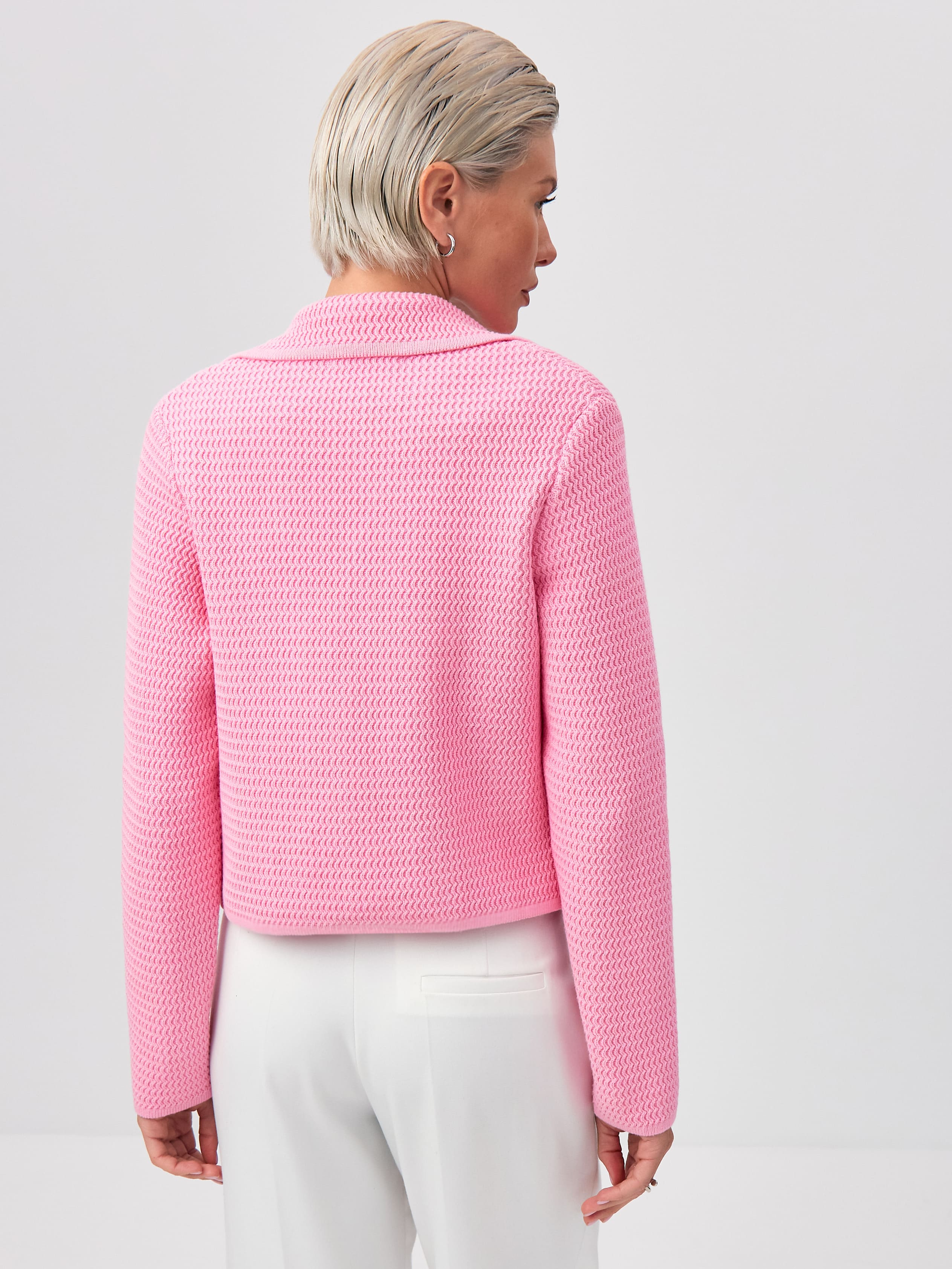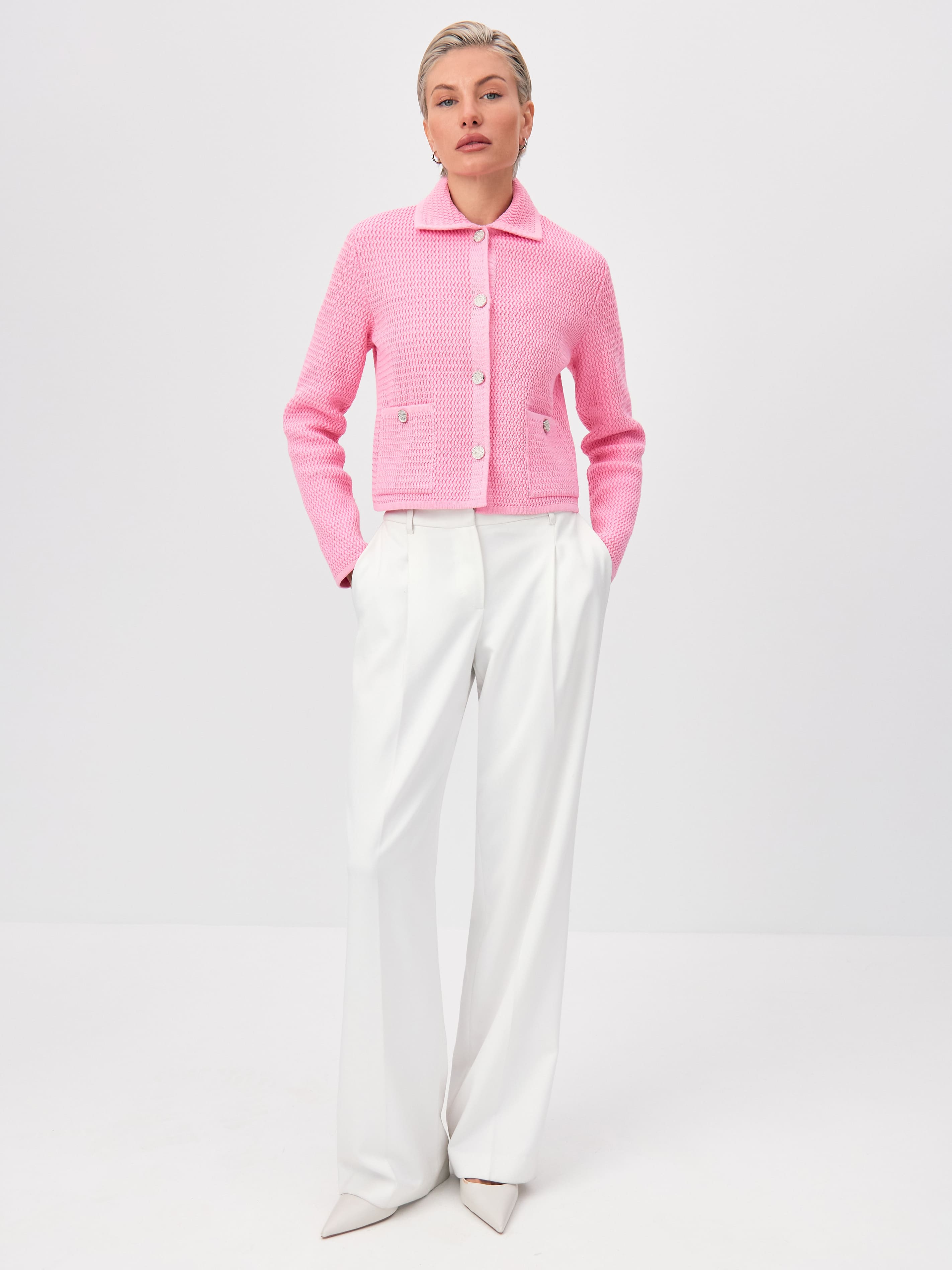Облегченный мини-жакет, пришедший на смену тяжелым пиджакам из текстиля. Модель в стиле элегантных 60-х выполнена из нежного длинноволокнистого хлопка. Рельефная текстура трикотажа оттеняется контрастным рядом пуговиц. Добавление в пряжу небольшого количества полиамида позволило отказаться от подклада, стабилизирующего форму изделия. В итоге кроп-жакет прекрасно держит силуэт и сохраняет изумительную воздухопроницаемость, что открывает ему дорогу в весенне-летний гардероб.