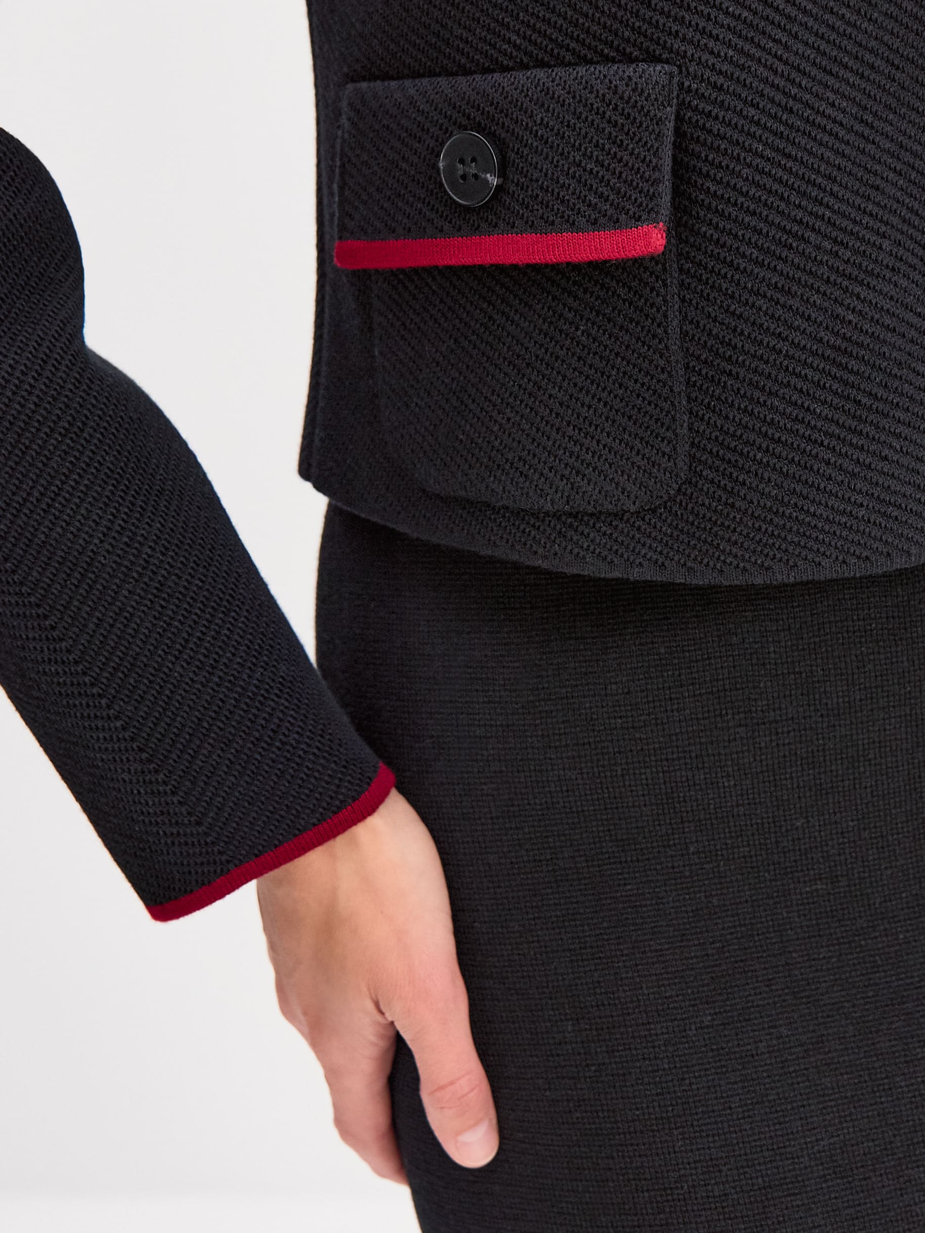 Ключевой нюанс вязаного жакета с хлопком – необычная «зернистая» текстура трикотажа. Рисунок располагается по диагонали, что формирует интересный визуальный эффект – силуэт как бы автоматически подтягивается. Графичность классического кроя пиджака превосходно уравновесят пластичные брюки-палаццо из нашей круизной линейки.