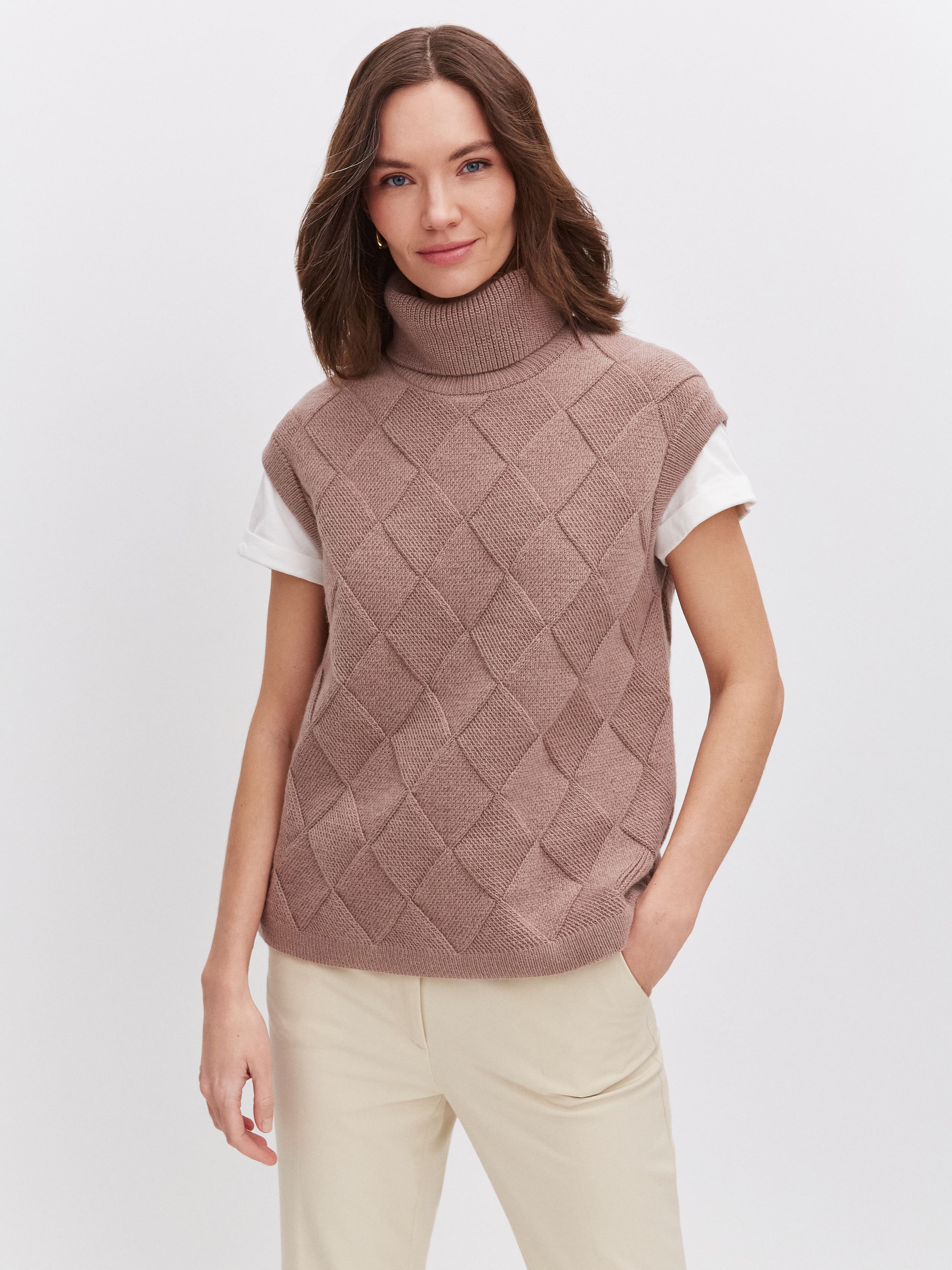 Когда мечтаешь о мягкости и тепле на пределе возможностей! Наш объемный жилет включает шерсть тонкорунного мериноса с вплетением нежнейшего кид-мохера. Именно они позволили создать шелковистую фактуру, с которой так и хочется контактировать – гладить, трогать, скользить ладонью. Рельефный узор и высокий, ворот работают как средства выразительности – мы против скучных повседневных образов!