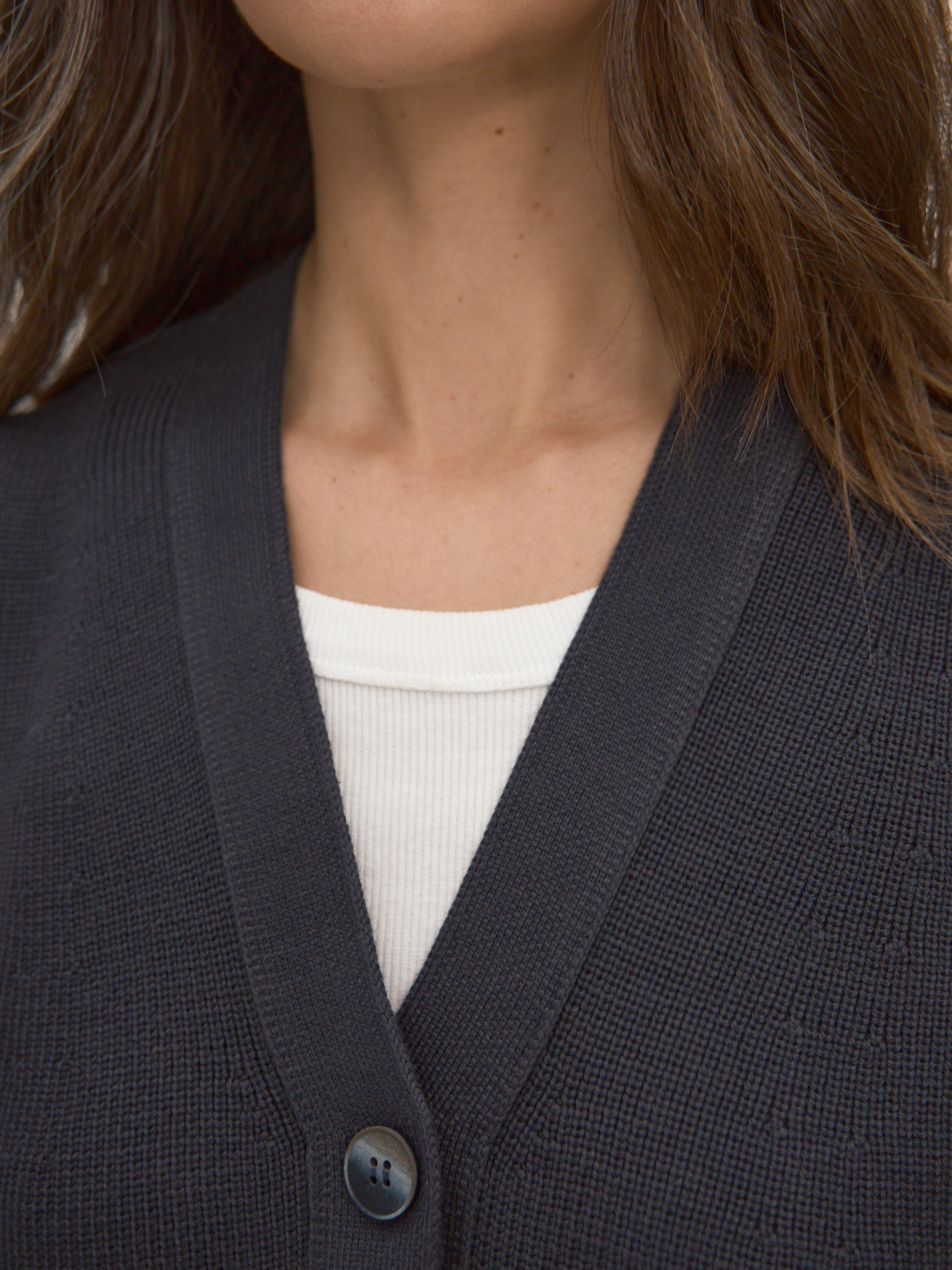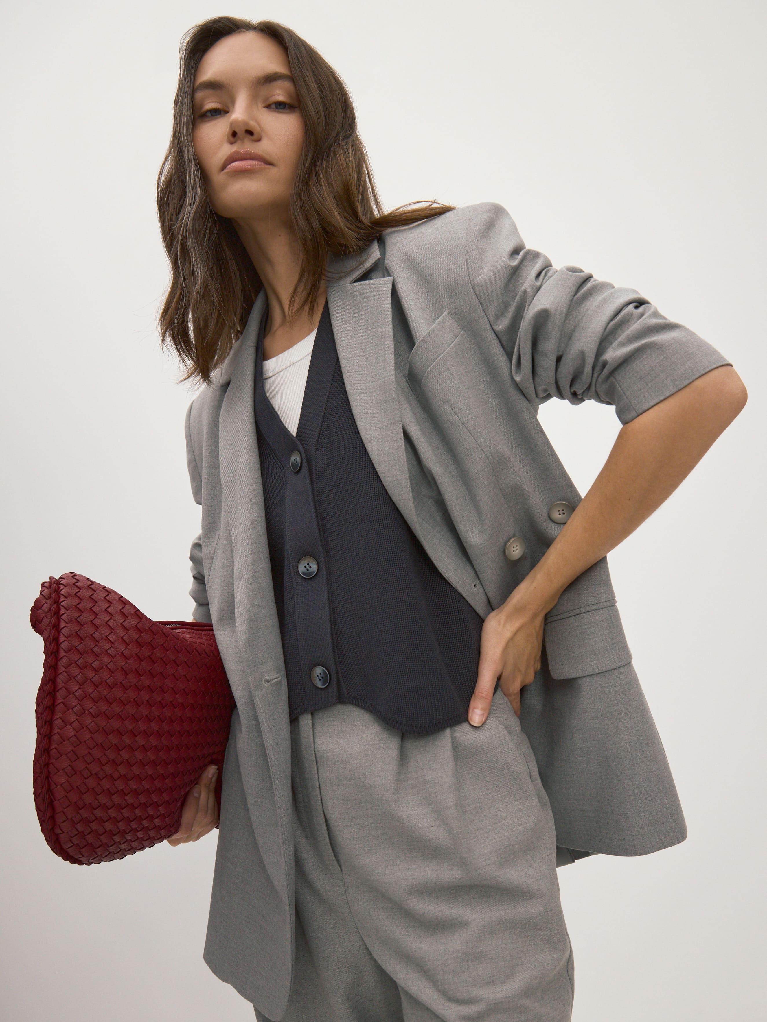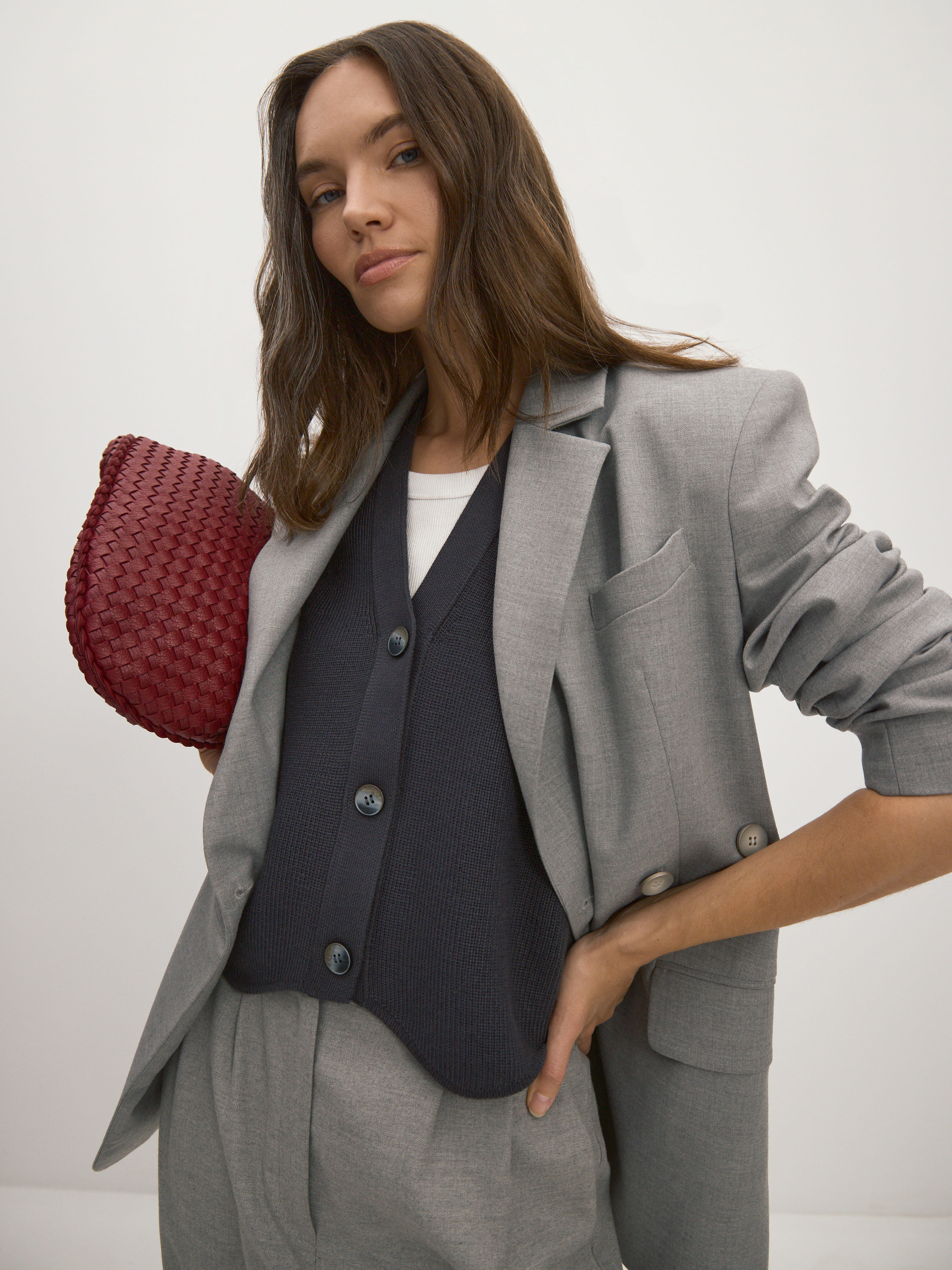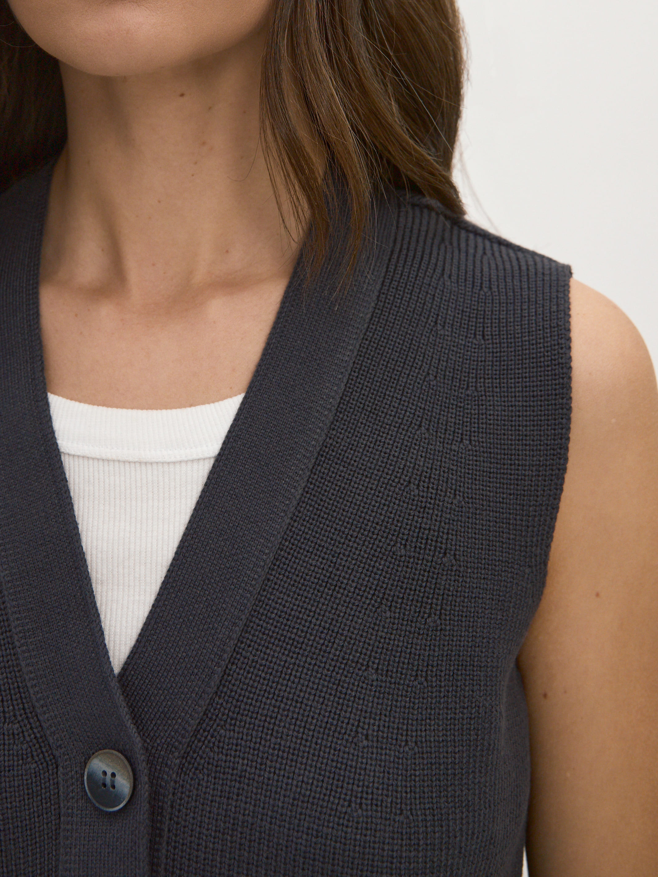 Фактурный однобортный жилет для эклектичных капсул. Авторская укороченная модель с фигурным кроем низа. Поверхность трикотажа рельефная, комфортная на ощупь, благодаря тщательно выверенному балансу хлопкового волокна и вискозы. Для получения провоцирующе-стильного образа рекомендуем носить как топ поверх белья. Для формальных выходов жилету лучше стилизовать слоями – под низ задействуем объемные рубашки из тонкого хб текстиля.