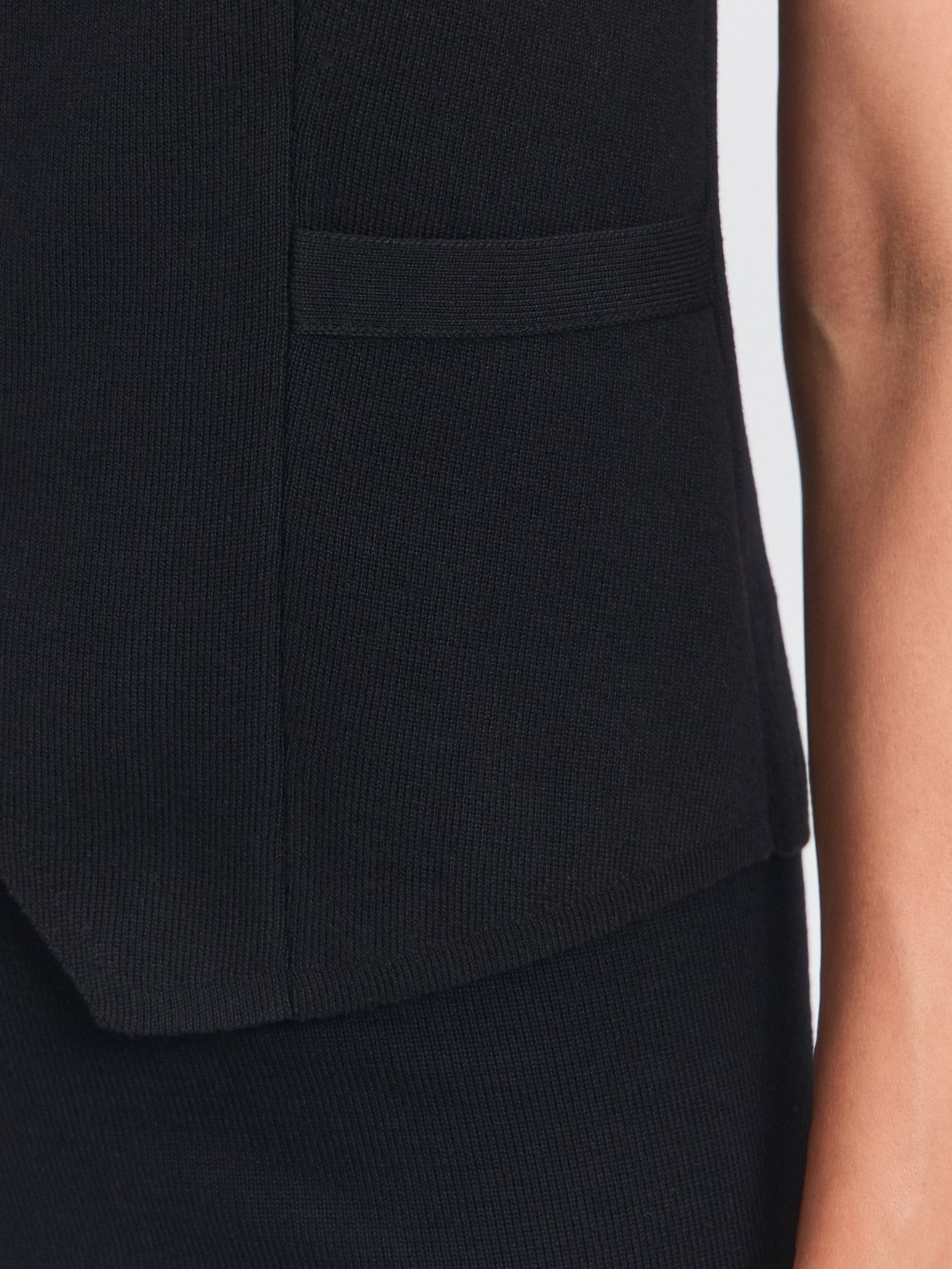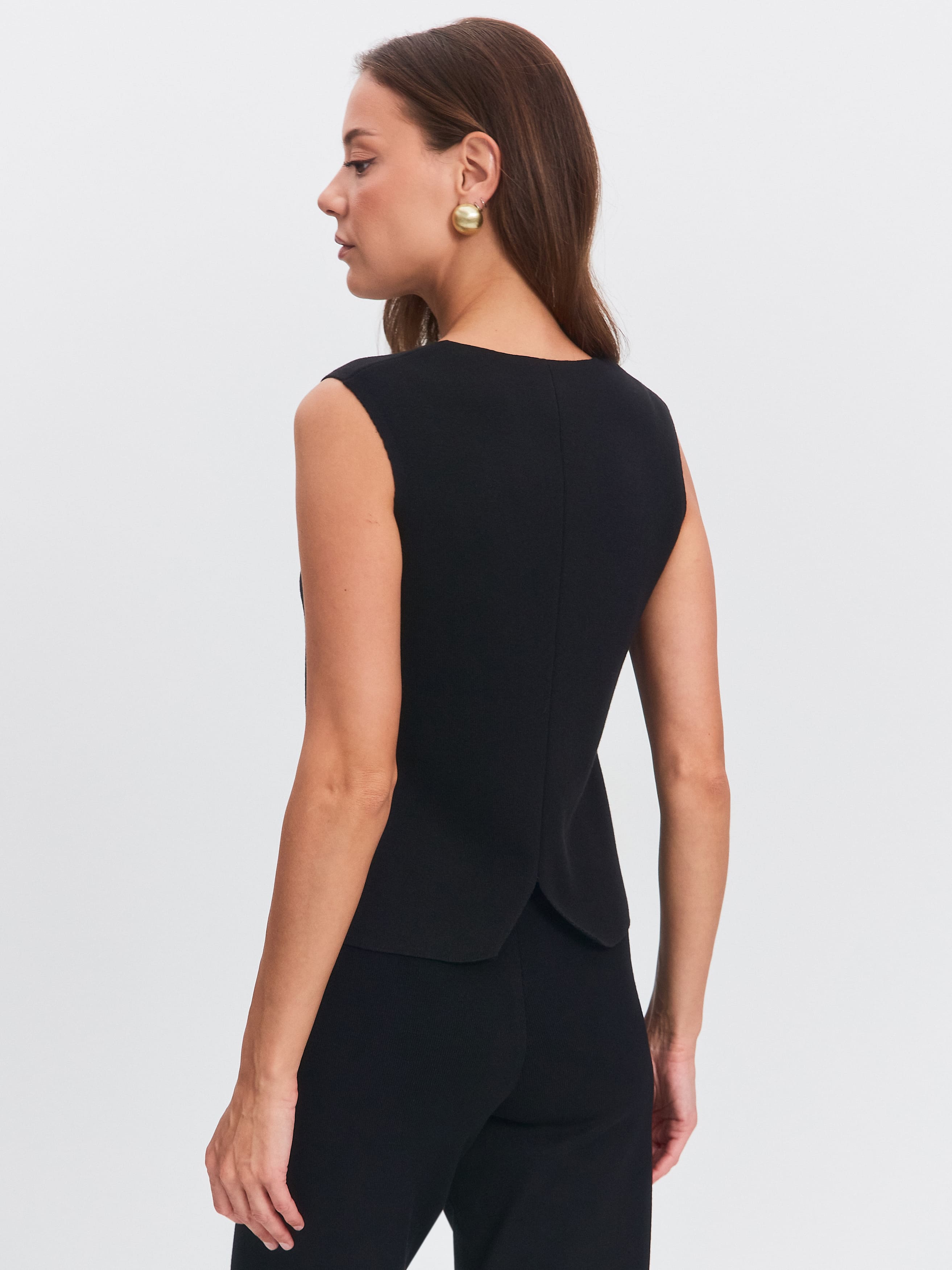 Этот укороченный костюмный жилет вдохновлен силуэтами консервативной классики. Модель с центральной застежкой на пуговицы, v-образным вырезом и вытачками для силуэтности. Средняя глубина проймы позволяет использовать жилет поверх тонкого текстиля и не ощущать скованности в плечевой зоне. Основной материал жилетки – премиальная хлопковая пряжа с увеличенным количеством вискозы. Благодаря ей, удается получить трикотаж оптимальных характеристик – плотный, умеренно эластичный, комплиментарный в посадке.